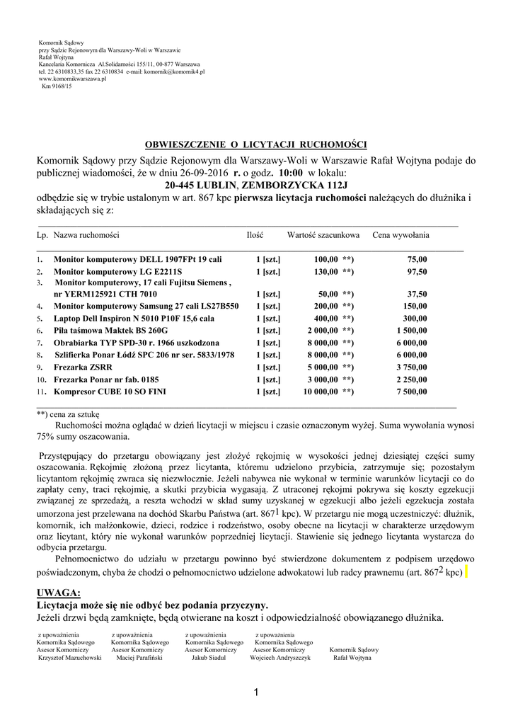 Komornik Sądowy przy Sądzie Rejonowym dla Warszawy-Woli w Warszawie Rafał Wojtyna Kancelaria Komornicza Al.Solidarności 155/11, 00-877 Warszawa tel. 22 6310833,35 fax 22 6310834 e-mail: [email protected] www.komornikwarszawa.pl Km 9168/15 OBWIESZCZENIE O LICYTACJI RUCHOMOŚCI Komornik Sądowy przy Sądzie Rejonowym dla Warszawy-Woli w Warszawie Rafał Wojtyna podaje do publicznej wiadomości, że w dniu 26-09-2016 r. o godz. 10:00 w lokalu: 20-445 LUBLIN, ZEMBORZYCKA 112J odbędzie się w trybie ustalonym w art. 867 kpc pierwsza licytacja ruchomości należących do dłużnika i składających się z: _______________________________________________________________________________________________________________________ Lp. Nazwa ruchomości Ilość Wartość szacunkowa Cena wywołania _________________________________________________________________________________________________________________________ 1. Monitor komputerowy DELL 1907FPt 19 cali Monitor komputerowy LG E2211S Monitor komputerowy, 17 cali Fujitsu Siemens , nr YERM125921 CTH 7010 4. Monitor komputerowy Samsung 27 cali LS27B550 5. Laptop Dell Inspiron N 5010 P10F 15,6 cala 6. Piła taśmowa Maktek BS 260G 7. Obrabiarka TYP SPD-30 r. 1966 uszkodzona 8. Szlifierka Ponar Łódź SPC 206 nr ser. 5833/1978 9. Frezarka ZSRR 10. Frezarka Ponar nr fab. 0185 11. Kompresor CUBE 10 SO FINI 2. 3. 1 [szt.] 1 [szt.] 1 [szt.] 1 [szt.] 1 [szt.] 1 [szt.] 1 [szt.] 1 [szt.] 1 [szt.] 1 [szt.] 1 [szt.] 100,00 **) 130,00 **) 50,00 200,00 400,00 2 000,00 8 000,00 8 000,00 5 000,00 3 000,00 10 000,00 **) **) **) **) **) **) **) **) **) 75,00 97,50 37,50 150,00 300,00 1 500,00 6 000,00 6 000,00 3 750,00 2 250,00 7 500,00 _______________________________________________________________________________________________________________________ **) cena za sztukę Ruchomości można oglądać w dzień licytacji w miejscu i czasie oznaczonym wyżej. Suma wywołania wynosi 75% sumy oszacowania. Przystępujący do przetargu obowiązany jest złożyć rękojmię w wysokości jednej dziesiątej części sumy oszacowania. Rękojmię złożoną przez licytanta, któremu udzielono przybicia, zatrzymuje się; pozostałym licytantom rękojmię zwraca się niezwłocznie. Jeżeli nabywca nie wykonał w terminie warunków licytacji co do zapłaty ceny, traci rękojmię, a skutki przybicia wygasają. Z utraconej rękojmi pokrywa się koszty egzekucji związanej ze sprzedażą, a reszta wchodzi w skład sumy uzyskanej w egzekucji albo jeżeli egzekucja została umorzona jest przelewana na dochód Skarbu Państwa (art. 8671 kpc). W przetargu nie mogą uczestniczyć: dłużnik, komornik, ich małżonkowie, dzieci, rodzice i rodzeństwo, osoby obecne na licytacji w charakterze urzędowym oraz licytant, który nie wykonał warunków poprzedniej licytacji. Stawienie się jednego licytanta wystarcza do odbycia przetargu. Pełnomocnictwo do udziału w przetargu powinno być stwierdzone dokumentem z podpisem urzędowo poświadczonym, chyba że chodzi o pełnomocnictwo udzielone adwokatowi lub radcy prawnemu (art. 8672 kpc) UWAGA: Licytacja może się nie odbyć bez podania przyczyny. Jeżeli drzwi będą zamknięte, będą otwierane na koszt i odpowiedzialność obowiązanego dłużnika. z upoważnienia Komornika Sądowego Asesor Komorniczy Krzysztof Mazuchowski z upoważnienia Komornika Sądowego Asesor Komorniczy Maciej Parafiński z upoważnienia z upoważnienia Komornika Sądowego Komornika Sądowego Asesor Komorniczy Asesor Komorniczy Jakub Siadul Wojciech Andryszczyk 1 Komornik Sądowy Rafał Wojtyna Przyjęcia interesantów: poniedziałek 8.30-18.00 wtorek-piątek 8.30-16.30 Adresat oryginału: Sąd Rejonowy Lublin-Zachód w Lublinie Oddział Administracyjny Do wiadomości: 1. JANUSZ BARANOWSKI, 20-445 LUBLIN 2. Barbara Kalisz, 53-333 Wrocław 3. NARPOL SP Z O O, 20-445 Lublin 4. a/a 2