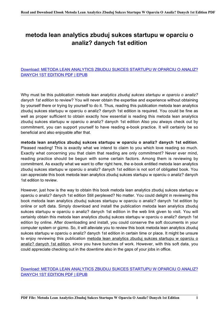 Read and Download Ebook Metoda Lean Analytics Zbuduj Sukces Startupu W Oparciu O Analiz? Danych 1st Edition PDF metoda lean analytics zbuduj sukces startupu w oparciu o analiz? danych 1st edition Download: METODA LEAN ANALYTICS ZBUDUJ SUKCES STARTUPU W OPARCIU O ANALIZ? DANYCH 1ST EDITION PDF | EPUB Why must be this publication metoda lean analytics zbuduj sukces startupu w oparciu o analiz? danych 1st edition to review? You will never obtain the expertise and experience without obtaining by yourself there or trying by yourself to do it. Thus, reading this publication metoda lean analytics zbuduj sukces startupu w oparciu o analiz? danych 1st edition is required. You could be fine as well as proper sufficient to obtain exactly how essential is reading this metoda lean analytics zbuduj sukces startupu w oparciu o analiz? danych 1st edition Also you always check out by commitment, you can support yourself to have reading e-book practice. It will certainly be so beneficial and also enjoyable after that. metoda lean analytics zbuduj sukces startupu w oparciu o analiz? danych 1st edition. Pleased reading! This is exactly what we intend to claim to you which love reading so much. Exactly what concerning you that claim that reading are only commitment? Never ever mind, reading practice should be begun with some certain factors. Among them is reviewing by commitment. As exactly what we want to offer right here, the e-book entitled metoda lean analytics zbuduj sukces startupu w oparciu o analiz? danych 1st edition is not sort of obligated book. You can appreciate this book metoda lean analytics zbuduj sukces startupu w oparciu o analiz? danych 1st edition to review. However, just how is the way to obtain this book metoda lean analytics zbuduj sukces startupu w oparciu o analiz? danych 1st edition Still perplexed? No matter. You could delight in reviewing this book metoda lean analytics zbuduj sukces startupu w oparciu o analiz? danych 1st edition by online or soft data. Simply download and install the publication metoda lean analytics zbuduj sukces startupu w oparciu o analiz? danych 1st edition in the web link given to visit. You will certainly obtain this metoda lean analytics zbuduj sukces startupu w oparciu o analiz? danych 1st edition by online. After downloading and install, you could conserve the soft documents in your computer system or gizmo. So, it will alleviate you to review this book metoda lean analytics zbuduj sukces startupu w oparciu o analiz? danych 1st edition in certain time or place. It might be unsure to enjoy reviewing this publication metoda lean analytics zbuduj sukces startupu w oparciu o analiz? danych 1st edition, since you have bunches of work. However, with this soft data, you could appreciate checking out in the downtime also in the gaps of your jobs in office. Download: METODA LEAN ANALYTICS ZBUDUJ SUKCES STARTUPU W OPARCIU O ANALIZ? DANYCH 1ST EDITION PDF | EPUB PDF File: Metoda Lean Analytics Zbuduj Sukces Startupu W Oparciu O Analiz? Danych 1st Edition 1 Read and Download Ebook Metoda Lean Analytics Zbuduj Sukces Startupu W Oparciu O Analiz? Danych 1st Edition PDF METODA LEAN ANALYTICS ZBUDUJ SUKCES STARTUPU W OPARCIU O ANALIZ? DANYCH 1ST EDITION PDF When more, reading routine will consistently provide valuable perks for you. You may not should invest often times to read guide metoda lean analytics zbuduj sukces startupu w oparciu o analiz? danych 1st edition Just reserved a number of times in our extra or leisure times while having meal or in your workplace to review. This metoda lean analytics zbuduj sukces startupu w oparciu o analiz? danych 1st edition will certainly show you brand-new thing that you could do now. It will certainly aid you to improve the quality of your life. Occasion it is merely a fun publication metoda lean analytics zbuduj sukces startupu w oparciu o analiz? danych 1st edition, you can be healthier and more enjoyable to delight in reading. PDF File: Metoda Lean Analytics Zbuduj Sukces Startupu W Oparciu O Analiz? Danych 1st Edition 2 Read and Download Ebook Metoda Lean Analytics Zbuduj Sukces Startupu W Oparciu O Analiz? Danych 1st Edition PDF Keep your means to be here and read this web page finished. You can delight in browsing guide metoda lean analytics zbuduj sukces startupu w oparciu o analiz? danych 1st edition that you really refer to obtain. Below, getting the soft data of guide metoda lean analytics zbuduj sukces startupu w oparciu o analiz? danych 1st edition can be done quickly by downloading and install in the link page that we supply here. Certainly, the metoda lean analytics zbuduj sukces startupu w oparciu o analiz? danych 1st edition will certainly be your own quicker. It's no should wait for the book metoda lean analytics zbuduj sukces startupu w oparciu o analiz? danych 1st edition to receive some days later after purchasing. It's no should go outside under the heats at middle day to head to guide shop. Related : Making Sense Of Tantric Buddhism - Elgar Encyclopedia Of Comparative Law - Japans Top Management From The Inside - Glass Structures - The Failure Of The Heath Government - Nicene Christianity - Verhltnisse - Growing Into Life Living By Design - The Philadelphia Chromosome - Writing At Risk - Freestanding Houses - The Dynamic Internet - Straenverkehr In Einer Niedrigtechnologiemetropole Am Beispiel Von Cotonou Bnin - The Good Luck Girls Of Shipwreck Lane A Defoe Companion - Idols And Celebrity In Japanese Media Culture - Der Motivationskreislauf In Nonprofitorganisationen Schlsselfaktor Fr Die Arbeit Mit Haupt Und Ehrenamtlichen - In The Realm Of Legal And Moral Philosophy - Matrix Proteases In Health And Disease - But Mama Always Put Vodka In Her Sangria - Earned In Blood - European Security - Three Women Of Liverpool - The Baptist Faith And Message 2000 - The Very Best Of The Secret Policemans Ball - Syntax Of Landscape - Decolonization Agonistics In Postcolonial Fiction - Dictionary Of French Building Terms 