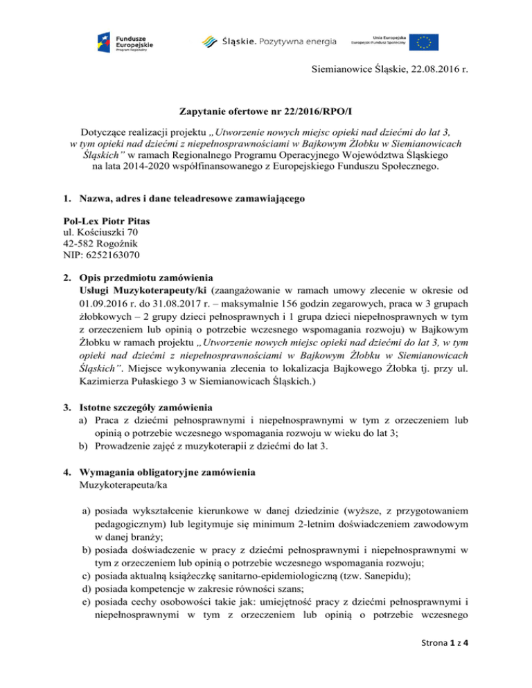 Siemianowice Śląskie, 22.08.2016 r. Zapytanie ofertowe nr 22/2016/RPO/I Dotyczące realizacji projektu „Utworzenie nowych miejsc opieki nad dziećmi do lat 3, w tym opieki nad dziećmi z niepełnosprawnościami w Bajkowym Żłobku w Siemianowicach Śląskich” w ramach Regionalnego Programu Operacyjnego Województwa Śląskiego na lata 2014-2020 współfinansowanego z Europejskiego Funduszu Społecznego. 1. Nazwa, adres i dane teleadresowe zamawiającego Pol-Lex Piotr Pitas ul. Kościuszki 70 42-582 Rogoźnik NIP: 6252163070 2. Opis przedmiotu zamówienia Usługi Muzykoterapeuty/ki (zaangażowanie w ramach umowy zlecenie w okresie od 01.09.2016 r. do 31.08.2017 r. – maksymalnie 156 godzin zegarowych, praca w 3 grupach żłobkowych – 2 grupy dzieci pełnosprawnych i 1 grupa dzieci niepełnosprawnych w tym z orzeczeniem lub opinią o potrzebie wczesnego wspomagania rozwoju) w Bajkowym Żłobku w ramach projektu „Utworzenie nowych miejsc opieki nad dziećmi do lat 3, w tym opieki nad dziećmi z niepełnosprawnościami w Bajkowym Żłobku w Siemianowicach Śląskich”. Miejsce wykonywania zlecenia to lokalizacja Bajkowego Żłobka tj. przy ul. Kazimierza Pułaskiego 3 w Siemianowicach Śląskich.) 3. Istotne szczegóły zamówienia a) Praca z dziećmi pełnosprawnymi i niepełnosprawnymi w tym z orzeczeniem lub opinią o potrzebie wczesnego wspomagania rozwoju w wieku do lat 3; b) Prowadzenie zajęć z muzykoterapii z dziećmi do lat 3. 4. Wymagania obligatoryjne zamówienia Muzykoterapeuta/ka a) posiada wykształcenie kierunkowe w danej dziedzinie (wyższe, z przygotowaniem pedagogicznym) lub legitymuje się minimum 2-letnim doświadczeniem zawodowym w danej branży; b) posiada doświadczenie w pracy z dziećmi pełnosprawnymi i niepełnosprawnymi w tym z orzeczeniem lub opinią o potrzebie wczesnego wspomagania rozwoju; c) posiada aktualną książeczkę sanitarno-epidemiologiczną (tzw. Sanepidu); d) posiada kompetencje w zakresie równości szans; e) posiada cechy osobowości takie jak: umiejętność pracy z dziećmi pełnosprawnymi i niepełnosprawnymi w tym z orzeczeniem lub opinią o potrzebie wczesnego Strona 1 z 4 wspomagania rozwoju do lat 3, dyspozycyjność, punktualność, otwartość, asertywność, cierpliwość, komunikatywność, rzetelność, wysoka kultura osobista. 5. Warunki udziału w postępowaniu oraz opis sposobu dokonywania oceny ich spełniania. a) O zlecenie mogą ubiegać się Wykonawcy, którzy: i) w terminie złożyli wypełniony i podpisany formularz ofertowy, sporządzony w języku polskim, którego wzór stanowi załącznik nr 1 do zapytania ofertowego, ii) ofertę złożono zgodnie z reprezentacją Wykonawcy lub jego pełnomocnictwem. b) Zamawiający po otrzymaniu ofert zobowiązany jest do ich analizy w oparciu o powyższe informacje na podstawie oferty i zawartych w niej informacji. c) Powyższe warunki maja charakter obligatoryjny. 6. Informację o kryteriach oceny oraz wagach punktowych lub procentowych przypisanych do poszczególnych kryteriów oceny oferty. a) cena 70% b) doświadczenie 30% 7. Opis sposobu przyznawania punktacji za spełnienie danego kryterium oceny oferty. Do porównania ofert będzie brana cena całkowita za godzinę zegarową usługi do poniesienia przez Zamawiającego. Najkorzystniejszą ofertą zostanie wybrana ta, z najwyższą liczbą uzyskanych punktów, obliczaną według poniższego wzoru: Ad. a. C = cena najtańszej oferty / oferowana cena x 70pkt Do porównania ofert będzie miała miejsce analiza ilości godzin przeprowadzonych usług Muzykoterapeuty/ki dla dzieci do lat 3. Ad. b. D = doświadczenie oferty badanej / doświadczenie oferty z najdłuższym doświadczeniem x 30pkt Całkowita liczba punktów, jaką otrzyma dana oferta, zostanie obliczona wg poniższego wzoru: L = C + D gdzie: L – całkowita liczba punktów, C – punkty uzyskane w kryterium „Cena”, D – punkty uzyskane w kryterium „Doświadczenie”. Zamawiający wybierze ofertę najkorzystniejszą na podstawie kryteriów oceny ofert określonych w niniejszym zapytaniu ofertowym dla poszczególnych części zapytania. Oferta, która uzyska największa liczbę punktów w danej części zapytania wg powyższych kryteriów i metodologii obliczania zostanie uznana za najkorzystniejszą dla danej części zapytania. Strona 2 z 4 W przypadku gdy najkorzystniejsza oferta w całości przekroczy budżet przeznaczony na działania będące przedmiotem zapytania, Zamawiający może podjąć negocjacje z oferentami. 8. Termin i miejsce składania ofert. Podpisany formularz ofertowy należy przesłać w formie skanu za pośrednictwem poczty elektronicznej na adres: [email protected] lub oryginał za pomocą poczty, kuriera bądź też dostarczyć osobiście na adres: ul. Pułaskiego 3 41-100 Siemianowice Śląskie (Bajkowy Żłobek) nie później niż do 29.08.2016 r. do godziny 12:00 do biura Dyrektora/ki Żłobka. Oferty złożone po terminie nie będą rozpatrywane. Decyduje data i godzina wpłynięcia oferty do Zamawiającego. 9. Informacje na temat zakresu wykluczenia. Wykluczeniu z postępowania podlegają Wykonawcy: a) w stosunku do których otwarto likwidację lub których upadłość ogłoszono; b) którzy zalegają z uiszczeniem podatków, opłat lub składek na ubezpieczenia społeczne lub zdrowotne, z wyjątkiem przypadków gdy uzyskali oni przewidziane prawem zwolnienie, odroczenie, rozłożenie na raty zaległych płatności lub wstrzymanie w całości wykonania decyzji właściwego organu; c) którzy są powiązani osobowo lub kapitałowo z Zamawiającym. Przez powiązania kapitałowe lub osobowe rozumie się wzajemne powiązania między Zamawiającym lub osobami upoważnionymi do zaciągania zobowiązań w mieniu Zamawiającego lub osobami wykonującymi w imieniu Zamawiającego czynności związane z przygotowaniem i przeprowadzaniem procedury wyboru Wykonawcy, a Wykonawcą, polegające w szczególności na: i) uczestniczeniu w spółc