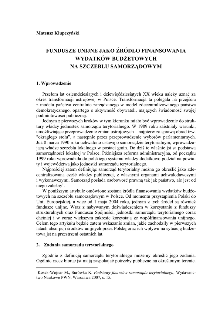 Mateusz Klupczyński FUNDUSZE UNIJNE JAKO ŹRÓDŁO FINANSOWANIA WYDATKÓW BUDŻETOWYCH NA SZCZEBLU SAMORZĄDOWYM 1. Wprowadzenie Przełom lat osiemdziesiątych i dziewięćdziesiątych XX wieku należy uznać za okres transformacji ustrojowej w Polsce. Transformacja ta polegała na przejściu z modelu państwa centralnie zarządzanego w model zdecentralizowanego państwa demokratycznego, opartego o aktywność obywateli, mających świadomość swojej podmiotowości publicznej. Jednym z pierwszych kroków w tym kierunku miało być wprowadzenie do struktury władzy jednostek samorządu terytorialnego. W 1989 roku zaistniały warunki, umożliwiające przeprowadzenie zmian ustrojowych – najpierw za sprawą obrad tzw. "okrągłego stołu”, a następnie przez przeprowadzenie wyborów parlamentarnych. Już 8 marca 1990 roku uchwalono ustawę o samorządzie terytorialnym, wprowadzającą władzę szczebla lokalnego w postaci gmin. Do dziś te właśnie jst są podstawą samorządności lokalnej w Polsce. Późniejsza reforma administracyjna, od początku 1999 roku wprowadziła do polskiego systemu władzy dodatkowo podział na powiaty i województwa jako jednostki samorządu terytorialnego. Najprościej zatem definiując samorząd terytorialny można go określić jako zdecentralizowaną część władzy publicznej, z własnymi organami uchwałodawczymi i wykonawczymi. Samorząd posiada osobowość prawną tak jak państwo, ale jest od niego zależny1. W poniższym artykule omówione zostaną źródła finansowania wydatków budżetowych na szczeblu samorządowym w Polsce. Od momentu przystąpienia Polski do Unii Europejskiej, a więc od 1 maja 2004 roku, jednym z tych źródeł są również fundusze unijne. Wraz z nabywanym doświadczeniem w korzystaniu z funduszy strukturalnych oraz Funduszu Spójności, jednostki samorządu terytorialnego coraz chętniej i w coraz większym zakresie korzystają ze współfinansowania unijnego. Celem tego artykułu będzie zatem wskazanie zmian, jakie zachodziły w pierwszych latach absorpcji środków unijnych przez Polskę oraz ich wpływu na sytuację budżetową jst na przestrzeni ostatnich lat. 2. Zadania samorządu terytorialnego Zgodnie z definicją samorządu terytorialnego możemy określić jego zadania. Ogólnie rzecz biorąc jst mają zaspokajać potrzeby publiczne na określonym terenie. 1 Kosek-Wojnar M., Surówka K. Podstawy finansów samorządu terytorialnego, Wydawnictwo Naukowe PWN, Warszawa 2007, s. 15. Władza, ze swym przedstawicielstwem w terenie jest w stanie lepiej reprezentować potrzeby mieszkańców, rozwiązywać pojawiające się na danym terenie problemy. W ustawie o samorządzie terytorialnym z 8 marca 1990r.2 przyjęto zasadę, że gmina wykonywać będzie zadania własne oraz zadania zlecone przez odpowiednie organy administracji rządowej. Do zadań własnych zaliczamy m.in. sprawy związane z: ładem przestrzennym, gospodarką nieruchomościami, ochroną środowiska, odpowiedzialnością za stan dróg, ulic, mostów itp., zaopatrywaniem w wodę, kanalizację, usuwaniem i oczyszczaniem ścieków komunalnych, utrzymaniem czystości i urządzeń sanitarnych, utylizacją odpadów, ochroną zdrowia, opieką społeczną, edukacją publiczną, a także kulturą. Oprócz tych zadań konstytucja RP stwierdza w art. 1633, iż samorząd terytorialny wykonuje wszystkie zadania, które nie zostały wcześniej zastrzeżone dla innych organów władzy publicznej przez konstytucję lub inne ustawy. Poza zadaniami własnymi, które gmina wykonuje z własnego budżetu istnieje również możliwość współpracy ze szczeblem centralnym w celu realizacji większych przedsięwzięć. W wyniku wcześniej wspomnianej reformy administracyjnej od początku roku 1999, samorząd terytorialny przestał działać w strukturze jednoszczeblowej. Wprowadzono nowe jednostki samorządu terytorialnego – powiaty i województwa. Zgodnie z założeniami reformy powiaty miały obejmować obszar graniczących ze sobą gmin (tzw. powiaty ziemskie) albo miasta na prawach powiatu (tzw. powiaty grodzkie). Powiaty jednak nie są jednostką nadrzędną nad gminami. Z kolei w przypadku województw występuje dualizm władzy, z jednej strony utworzono bowiem organy samorządu województwa, z drugiej strony istnieje urząd wojewody, który jest przedstawicielem rządu. Wszystkim jst przyznano osobowość prawną, prawo własności i inne prawa majątkowe a ich samodzielność podlega ochronie sądowej. Ażeby zapewnić jak największą swobodę działania, jst podlegają nadzorowi wyłącznie z punktu widzenia legalności. Nadzór ten pełnią – Prezes Rady Ministrów i wojewodowie, a w sprawach finansowych regionalne izby obrachunkowe. Po zmianach w strukturze jednostek samorządu terytorialnego, ustawodawcy musieli rozwiązać problem rozdzielenia zadań i kompetencji poszczególnych szczebli. I tak na mocy ustawy o samorządzie powiatowym4, powiat zobligowany został do wykonywania zadań publicznych o charakterze ponadgminnym. Zgodnie z ustawą zadania powiatu nie mogą jednak naruszać zakresu kompetencji gmin. Na uzasadniony wniosek zainteresowanej gminy powiat może przekazywać jej zadania, leżące w jego kompetencji na warunkach porozumienia. Samorząd województwa zobowiązany jest do wykonywania zadań publicznych, które nie zostały zastrzeżone dla organów administracji rządowej, w takim zakresie jak edukacja publiczna (w tym szkolnictwo wyższe), pobudzanie aktywności gospodarczej, podnoszenie poziomu konkurencyjności i innowacyjności gospodarki wo- 2 Dz.U. 2007, nr 173, poz. 1218. Konstytucja Rzeczypospolitej Polskiej z 2 kwietnia 1997 r. (Dz.U. 1997, nr 78, poz. 483). 4 Ustawa z 5 czerwca 1998 r. o samorządzie powiatowym, (Dz.U. 1998, nr 91, poz. 578). 3 162 jewództwa, zachowanie wartości środowiska kulturowego i przyrodniczego, kształtowanie i utrzymywanie ładu przestrzennego5. Podobnie jak w przypadku powiatów, samorządy wojewó
