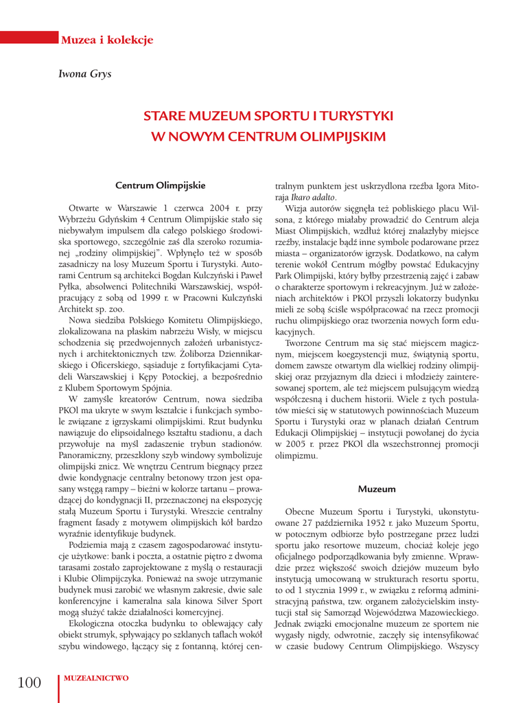 Muzea i kolekcje Iwona Grys STARE MUZEUM SPORTU I TURYSTYKI W NOWYM CENTRUM OLIMPIJSKIM Centrum Olimpijskie Otwarte w Warszawie 1 czerwca 2004 r. przy Wybrzeżu Gdyńskim 4 Centrum Olimpijskie stało się niebywałym impulsem dla całego polskiego środowiska sportowego, szczególnie zaś dla szeroko rozumianej „rodziny olimpijskiej”. Wpłynęło też w sposób zasadniczy na losy Muzeum Sportu i Turystyki. Autorami Centrum są architekci Bogdan Kulczyński i Paweł Pyłka, absolwenci Politechniki Warszawskiej, współpracujący z sobą od 1999 r. w Pracowni Kulczyński Architekt sp. zoo. Nowa siedziba Polskiego Komitetu Olimpijskiego, zlokalizowana na płaskim nabrzeżu Wisły, w miejscu schodzenia się przedwojennych założeń urbanistycznych i architektonicznych tzw. Żoliborza Dziennikarskiego i Oficerskiego, sąsiaduje z fortyfikacjami Cytadeli Warszawskiej i Kępy Potockiej, a bezpośrednio z Klubem Sportowym Spójnia. W zamyśle kreatorów Centrum, nowa siedziba PKOl ma ukryte w swym kształcie i funkcjach symbole związane z igrzyskami olimpijskimi. Rzut budynku nawiązuje do elipsoidalnego kształtu stadionu, a dach przywołuje na myśl zadaszenie trybun stadionów. Panoramiczny, przeszklony szyb windowy symbolizuje olimpijski znicz. We wnętrzu Centrum biegnący przez dwie kondygnacje centralny betonowy trzon jest opasany wstęgą rampy – bieżni w kolorze tartanu – prowadzącej do kondygnacji II, przeznaczonej na ekspozycję stałą Muzeum Sportu i Turystyki. Wreszcie centralny fragment fasady z motywem olimpijskich kół bardzo wyraźnie identyfikuje budynek. Podziemia mają z czasem zagospodarować instytucje użytkowe: bank i poczta, a ostatnie piętro z dwoma tarasami zostało zaprojektowane z myślą o restauracji i Klubie Olimpijczyka. Ponieważ na swoje utrzymanie budynek musi zarobić we własnym zakresie, dwie sale konferencyjne i kameralna sala kinowa Silver Sport mogą służyć także działalności komercyjnej. Ekologiczna otoczka budynku to oblewający cały obiekt strumyk, spływający po szklanych taflach wokół szybu windowego, łączący się z fontanną, której cen- 100 MUZEALNICTWO tralnym punktem jest uskrzydlona rzeźba Igora Mitoraja Ikaro adalto. Wizja autorów sięgnęła też pobliskiego placu Wilsona, z którego miałaby prowadzić do Centrum aleja Miast Olimpijskich, wzdłuż której znalazłyby miejsce rzeźby, instalacje bądź inne symbole podarowane przez miasta – organizatorów igrzysk. Dodatkowo, na całym terenie wokół Centrum mógłby powstać Edukacyjny Park Olimpijski, który byłby przestrzenią zajęć i zabaw o charakterze sportowym i rekreacyjnym. Już w założeniach architektów i PKOl przyszli lokatorzy budynku mieli ze sobą ściśle współpracować na rzecz promocji ruchu olimpijskiego oraz tworzenia nowych form edukacyjnych. Tworzone Centrum ma się stać miejscem magicznym, miejscem koegzystencji muz, świątynią sportu, domem zawsze otwartym dla wielkiej rodziny olimpijskiej oraz przyjaznym dla dzieci i młodzieży zainteresowanej sportem, ale też miejscem pulsującym wiedzą współczesną i duchem historii. Wiele z tych postulatów mieści się w statutowych powinnościach Muzeum Sportu i Turystyki oraz w planach działań Centrum Edukacji Olimpijskiej – instytucji powołanej do życia w 2005 r. przez PKOl dla wszechstronnej promocji olimpizmu. Muzeum Obecne Muzeum Sportu i Turystyki, ukonstytuowane 27 października 1952 r. jako Muzeum Sportu, w potocznym odbiorze było postrzegane przez ludzi sportu jako resortowe muzeum, chociaż koleje jego oficjalnego podporządkowania były zmienne. Wprawdzie przez większość swoich dziejów muzeum było instytucją umocowaną w strukturach resortu sportu, to od 1 stycznia 1999 r., w związku z reformą administracyjną państwa, tzw. organem założycielskim instytucji stał się Samorząd Województwa Mazowieckiego. Jednak związki emocjonalne muzeum ze sportem nie wygasły nigdy, odwrotnie, zaczęły się intensyfikować w czasie budowy Centrum Olimpijskiego. Wszyscy Muzea i kolekcje zainteresowani losem placówki oraz odpowiedzialni za jej działalność w latach minionych pamiętali, że przez ostatnie kilkanaście lat trwała – prowadzona ze zmiennym natężeniem – kampania nagłaśniająca coraz tragiczniejsze warunki egzystencji muzeum, które zlokalizowane było na systematycznie dewastowanym od lat stadionie SKRA przy ul. Wawelskiej 5. Ta tymczasowa – w założeniach z lat 60. – siedziba w pomieszczeniach zaadaptowanych wokół korony stadionu służyła ostatecznie aż 38 lat wszystkim funkcjom, jakie musiała w niej spełniać instytucja kultury. Szybka, bo szesnastomiesięczna, realizacja reprezentacyjnego budynku Centrum, jak też patowa sytuacja w poszukiwaniach innej siedziby dla Muzeum Sportu sprawiły, że od 2003 r. trwały rozmowy pomiędzy PKOl a Samorządem Województwa Mazowieckiego, wspierane konsultacjami Ministerstwa Kultury oraz Sejmowej Komisji Kultury Fizycznej i Turystyki. Efektowną pointą tych długotrwałych negocjacji stało się podpisanie umowy precyzującej szczegółowe warunki działalności MSiT w Centrum Olimpijskim od dnia 1 stycznia 2005 roku. W nowej siedzibie muzeum dysponuje powierzchnią porównywalną do zajmowanej na stadionie SKRA (od 2800 m² w pierwszym do 1400 m² w ostatnim okresie działalności). Kubatura budynku Centrum Olimpijskiego wynosi 40 813 m3, a powierzchnia użytkowa 6847 m² – MSiT zajmuje w Centrum 2150 m², tzn. 31,5 % powierzchni użytkowej. Pomieszczenia muzealne znajdują się na czterech kondygnacjach budynku: poziom –1 magazyny zbiorów 387 m2 poziom +2 ekspozycja stała 980 m2 poziom +3 sala wystaw czasowych 230 m2 poziom +4 pracownie muzealne, czytelnia, administracja 367 m2 tzw. powierzchnia wspólna 183 m2. Dodatkowo MSiT ma zapewnioną możliwość korzy- 1 – 2. Centrum Olimpijskie w Warszawie, na pierwszym planie rzeźba Igora Mitoraja Ikar Alato 1 – 2. Olympic Centre in 