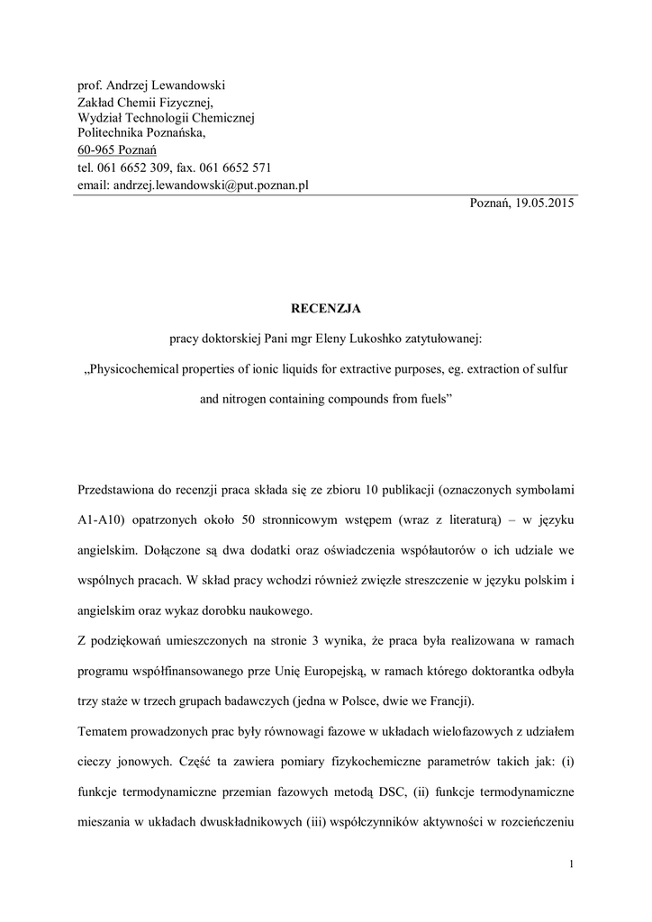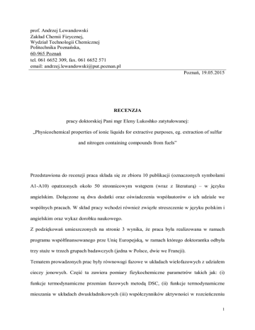 prof. Andrzej Lewandowski Zakład Chemii Fizycznej, Wydział Technologii Chemicznej Politechnika Poznańska, 60-965 Poznań tel. 061 6652 309, fax. 061 6652 571 email: [email protected] Poznań, 19.05.2015 RECENZJA pracy doktorskiej Pani mgr Eleny Lukoshko zatytułowanej: „Physicochemical properties of ionic liquids for extractive purposes, eg. extraction of sulfur and nitrogen containing compounds from fuels” Przedstawiona do recenzji praca składa się ze zbioru 10 publikacji (oznaczonych symbolami A1-A10) opatrzonych około 50 stronnicowym wstępem (wraz z literaturą) – w języku angielskim. Dołączone są dwa dodatki oraz oświadczenia współautorów o ich udziale we wspólnych pracach. W skład pracy wchodzi również zwięzłe streszczenie w języku polskim i angielskim oraz wykaz dorobku naukowego. Z podziękowań umieszczonych na stronie 3 wynika, że praca była realizowana w ramach programu współfinansowanego prze Unię Europejską, w ramach którego doktorantka odbyła trzy staże w trzech grupach badawczych (jedna w Polsce, dwie we Francji). Tematem prowadzonych prac były równowagi fazowe w układach wielofazowych z udziałem cieczy jonowych. Część ta zawiera pomiary fizykochemiczne parametrów takich jak: (i) funkcje termodynamiczne przemian fazowych metodą DSC, (ii) funkcje termodynamiczne mieszania w układach dwuskładnikowych (iii) współczynników aktywności w rozcieńczeniu 1 nieskończenie wielkim (iv) gęstości (v) równowag fazowych ciecz-ciało stałe, ciecz-ciecz oraz ciecz-para. Celem praktycznym było określenie możliwości ekstrakcji związków siarki i azotu (takie jak tiofen czy pirydyna) z węglowodorów alifatycznych (np. z n-heptanu jako węglowodoru wzorcowego). Osiem badanych cieczy jonowych, będących czwartorzędowymi solami amoniowymi, zostało zakupionych w firmach Merck oraz Iolitech. Rozwiązanie to (operowanie komercyjnymi solami) jest rozsądne, bo redukuje pracę konieczną do syntezy. Słaba stroną jest brak szczegółowych informacji o czystości soli. Jest to problem powszechny w tej dziedzinie. Temat ten jest kontynuacją wcześniejszych prac prowadzonych w zespole prof. Urszuli Domańskiej-Żelaznej nad fizykochemią cieczy jonowych, ich roztworów oraz równowag fazowych z innymi cieczami. Kopie prac będących podstawą doktoratu poprzedzone są krótkim wstępem opisującym (i) aktualne technologie oczyszczania paliw oraz możliwość zastosowania w tym celu cieczy jonowych, (ii) podstawy fizykochemiczne opisu układów (współczynnik aktywności w rozcieńczeniu nieskończenie wielkim, funkcje nadmiarowe mieszania oraz (iii) modele korelacyjne. Rozpuszczane związki to łańcuchowe i cykliczne alkany, alkeny, węglowodory aromatyczne, alkohole, woda, tiofen, pirydyna, etery, ketony, aldehydy, acetonitryl, nitropropan. Badania przeprowadzono w różnych temperaturach. Współczynniki aktywności wyznaczone w różnych temperaturach posłużyły do wyliczenia nadmiarowych funkcji termodynamicznych mieszania. Zbadano równowagi fazowe (metodą wizualną) w dwuskładnikowych układach ciekłych z udziałem cieczy jonowych. Wyniki korelowano różnymi modelami korelacyjnymi. Wykonano również badania równowag w układach trójskładnikowych: ciecz jonowa – heptan – tiofen lub pirydyna. Celem było oznaczenie współczynnika podziału tiofenu oraz pirydyny pomiędzy heptan (wzorcowy alkan) oraz ciecz jonową. Znalezione współczynniki podziału 2 były wysokie, sugerując możliwość praktycznego zastosowania tego typu układów do usuwania związków siarki i azotu z węglowodorów. Jedną z bardzo istotnych zalet cieczy jonowych jako cieczy do potencjalnych procesów ekstrakcyjnych jest ich zaniedbywalnie niska prężność pary, ograniczająca praktycznie do zera ich emisję do fazy gazowej. Przedstawione 10 prac zawiera ogromną ilość danych fizykochemicznych. Typowo tabele w jednej pracy (np. A1) pokazują dane dla układu wybranej cieczy jonowej i 60 innych związków chemicznych w 6-ciu temperaturach. Ilość danych jest na tyle duża, że trudno w niniejszej recenzji przedstawić wnioski wynikające z analizy bazy danych. Można dyskutować wpływ kationu czy anionu, z którego zbudowane są ciecze jonowe, wpływ długości podstawnika, substancji drugiej i trzeciej, na własności układu wieloskładnikowego. Na przykład w układach dwuskładnikowych, układy z tiofenem wykazywały zarówno dodatnie jak i ujemne odchylenia od prawa Roult’a, z pirydyną jedynie ujemne. Przeprowadzono również obliczenia ‘ab initio’ (program Gaussian) własności układów (dwie ciecze jonowe). Uzyskano zgodność obliczeń teoretycznych z danymi doświadczalnymi. Podstawową wartość prac upatruję w zgromadzeniu dużej ilości danych uzyskanych w wyniku podobnych eksperymentów. Na pierwszy rzut oka tego typu praca może wydawać się rutynowa. Jednak wiarygodne pomiary fizykochemiczne są trudne i nastręczają różne problemy eksperymentalne w zależności od układu. Analiza prac doktorantki sugeruje wiarygodność zgromadzonych danych (zarówno tych liczbowych jak i graficznych). Bardzo ważne jest też wskazanie na możliwość ekstrahowania z węglowodorów modelowych związków siarki i azotu do cieczy jonowych. Są to układy modelowe, pozytywny rezultat może skłonić do prób ekstrakcji z ropy lub materiałów ropopochodnych, czyli z układów przemysłowych o złożonym składzie, gdzie nie będzie możliwości dokładnego opisu fizykochemicznego. Zagadnienie jest praktycznie bardzo istotne, nie tylko w przypadku 3 paliw, ale również węglowodorów będących surowcami w syntezie, gdzie często stosuje się katalizatory heterogenne, dla których związki siarki i azotu mogą stanowić trucizny. Badania będące podstawą dysertacji wskazują na dwie ciecze jonowe do odsiarczania i jedną do usuwania związków azotu. W pracy znalazłem też pewną ilość drobnych usterek, które nie wpływaj