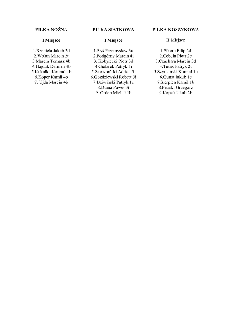 PIŁKA NOŻNA PIŁKA SIATKOWA PIŁKA KOSZYKOWA I Miejsce I Miejsce II Miejsce 1.Rzepiela Jakub 2d 2.Wolan Marcin 2t 3.Marcin Tomasz 4b 4.Hajduk Damian 4b 5.Kukułka Konrad 4b 6.Koper Kamil 4b 7. Ujda Marcin 4b 1.Ryś Przemysław 3u 2.Podgórny Marcin 4i 3. Kobyłecki Piotr 3d 4.Gielarek Patryk 3i 5.Skowroński Adrian 3i 6.Goździewski Robert 3i 7.Dziwiński Patryk 1c 8.Duma Paweł 3t 9. Ordon Michał 1b 1.Sikora Filip 2d 2.Cebula Piotr 2c 3.Czachara Marcin 3d 4.Tutak Patryk 2t 5.Szymański Konrad 1c 6.Gunia Jakub 1c 7.Sierpień Kamil 1b 8.Piarski Grzegorz 9.Kopeć Jakub 2b