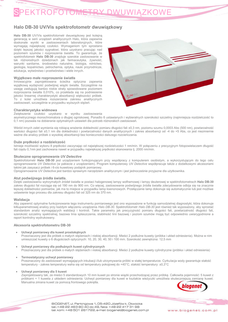 SPEKTROFOTOMETRY DWUWIĄZKOWE Halo DB-30 UV/Vis spektrofotometr dwuwiązkowy Halo DB-30 UV/Vis spektrofotometr dwuwiązkowy jest kolejną generacją w serii urządzeń analitycznych Halo, która zapewnia doskonale wyniki w zastosowaniach laboratoryjnych, które wymagają największej czułości. Wymaganiom tym sprostano dzięki lepszej jakości sygnałowi, która uzyskano pracując nad poziomem szumów i rozproszenia światła. To gwarantuje, że spektrofotometr Halo DB-30 znajduje szerokie zastosowanie w tak różnorodnych dziedzinach jak farmaceutyka, żywność, warunki sanitarne, środowisko naturalne, biologia, rolnictwo, geologia, kopalnictwo, petrochemia, optyka, nauki przyrodnicze, edukacja, wytwórstwo i przetwórstwo i wiele innych. Wyjątkowo małe rozproszenie światła Innowacyjnie zaprojektowana ścieżka optyczna zapewnia wyjątkową wydajność podwójnej wiązki światła. Szczególnie na uwagę zasługują bardzo niskie straty spowodowane poziomem rozproszenia światła 0,010%, co przekłada się na podniesienie jakości linearnej charakterystyki absorbancji większości próbek. To z kolei umożliwia rozszerzenie zakresu analitycznych zastosowań, szczególnie w przypadku wyższych stężeń. Charakterystyka widmowa Zwiększenie czułości uzyskano w wyniku zastosowania asymetrycznego monochromatora o długiej ogniskowej. Ponadto 6 ustawianych i wybieralnych szerokości szczeliny (najmniejsza rozdzielczość to 0,1 nm) pozwala na dobieranie optymalnych ustawień dla potrzeb różnorakich zastosowań. Wśród innych zalet wymienia się robiącą wrażenie dokładność pomiaru długości fali ±0,3 nm, poziomu szumu 0,0003 Abs (500 nm), powtarzalność wartości długości fali ±0,1 nm dla dokładności i powtarzalności danych analitycznych i zakres absorbancji od -4 do +5 Abs, co jest niezmiernie ważne dla analizy próbek o wysokiej absorbancji bez konieczności dalszego rozcieńczania. Duże prędkości a rozdzielczość Istnieje możliwość wyboru 8 prędkości zaczynając od największej rozdzielczości 1 nm/min. W połączeniu z precyzyjnym fotopowielaczem długość fali rzędu 0,1nm jest zachowana nawet w przypadku największej prędkości skanowania tj. 2000 nm/min. Skuteczne oprogramowanie UV Detective Spektrofotometr Halo DB-30 jest urządzeniem funkcjonującym przy współpracy z komputerem osobistym, a wykorzystującym do tego celu oprogramowanie UV Detective (w pakiecie z urządzeniem). Program komputerowy UV Detective współpracuje także z dodatkowymi akcesoriami takimi jak zasysacz próbek i 6-cio kuwetowy podajnik pomiarowy. Oprogramowanie UV Detective jest bardzo sprawnym narzędziem analitycznym i jest jednocześnie przyjazne dla użytkownika. Atut podwójnego źródła światła. Dzięki zastosowaniu wytrzymałych źródeł światła w postaci halogenowej lampy wolframowej i lampy deuterowej w spektrofotometrach Halo DB-30 zakres długości fal rozciąga się od 190 nm do 900 nm. Co więcej, zastosowanie podwójnego źródła światła zdecydowanie odbija się na znacznie lepszej dokładności pomiarów, jak ma to miejsce w przypadku lamp ksenonowych. Przełączanie lamp dokonuje się automatycznie lub jest możliwe ustawienie tego procesu dla zakresu długości fali od 325 nm do 370 nm. Walidacja Aby zapewnić optymalne funkcjonowanie tego instrumentu pomiarowego jest ono wyposażone w funkcję samodzielnej diagnostyki, która dokonuje kilkuparametrowej analizy przy każdym włączeniu urządzenia Halo DB-30. Spektrofotometr Halo DB-30 jest również tak wyposażony, aby sprostać standardom analiz wymagających walidacji i kontroli. Takie parametry jak precyzyjność pomiaru długości fali, powtarzalność długości fali, szerokość szczeliny spektralnej, bazowa linia spłaszczenia, stabilność linii bazowej i poziom szumów mogą być odpowiednio uwiarygodnione a raport kontrolny wydrukowany. Akcesoria spektrofotometru DB-30 Uchwyt pomiarowy dla kuwet prostokątnych Przeznaczony jest dla próbek o małych stężeniach i niskiej absorbancji. Mieści 2 podłużne kuwety (próbka i układ odniesienia). Można w nim umieszczać kuwety o 6 długościach optycznych: 10, 20, 30, 40, 50 i 100 mm. Szerokość zewnętrzna: 12,5 mm Uchwyt pomiarowy dla podłużnych kuwet cylindrycznych Przeznaczony jest dla próbek o małych stężeniach i niskiej absorbancji. Mieści 2 podłużne kuwety cylindryczne (próbka i układ odniesienia) Termostatyczny uchwyt pomiarowy Przeznaczony do zastosowań wymagających inkubacji i/lub utrzymywania próbki w stałej temperaturze. Cyrkulacja wody gwarantuje stałość temperatury - zakres temperatury waha się od temperatury pokojowej do +40°C, stałość temperatury: ±0,3°C Uchwyt pomiarowy dla 5 kuwet Zaprojektowany tak, ze mieści 5 standardowych 10 mm kuwet po stronie wiązki przechodzącej przez próbkę. Całkowita pojemność: 5 kuwet z próbkami + 1 kuweta z układem odniesienia. Uchwyt pomiarowy dla kuwet w kształcie wieżyczki umożliwia skuteczniejszą zamianę kuwet. Manualna zmiana kuwet za pomocą frontowego pokrętła. SPEKTROFOTOMETRY DWUWIĄZKOWE Uchwyt pomiarowy dla 6 kuwet (z elektroniczną kontrolą temperatury) Zaprojektowany tak, że mieści 6 standardowych 10 mm kuwet z funkcja kontroli temperatury i mieszania. Całkowita pojemność: 6 kuwet z próbkami + 1 kuweta z układem odniesienia. Elektroniczna zmiana kuwet – zmiana automatyczna w zdefiniowanych interwałach. Elektroniczny termostat – zakres temperatury od +20°C do +40°C Mieszadło magnetyczne. Wymaga wodnego systemu chłodzenia (przewody w zestawie) Uchwyt pomiarowy dla mikro-kuwet Zaprojektowany do analiz mikro-próbek w kuwetach o pojemności 50μL. Zakres długości fali: 220nm-880nm. Poziom szumów: ±0,001 Abs (objętość 50 μL) Mikro-kuwety Odpowiednie do wykorzystania z uchwytem pomiarowym do mikro-kuwet. Wykonane z kwarcu, dostępna pojemność: 50 μL Automatyczny zasysacz próbek (Sipper) bez kontroli temperatury 