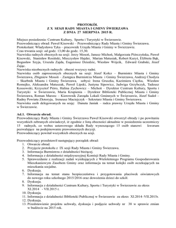 PROTOKÓŁ Z X SESJI RADY MIASTA I GMINY ŚWIERZAWA Z DNIA 27 SIERPNIA 2015 R. Miejsce posiedzenia: Centrum Kultury, Sportu i Turystyki w Świerzawie. Przewodniczący obrad: Paweł Kisowski – Przewodniczący Rady Miasta i Gminy Świerzawa. Protokolant: Władysława Tyka – pracownik Urzędu Miasta i Gminy w Świerzawie. Czas trwania sesji: od godz. 13,00 do godz. 15,30. Nazwiska radnych obecnych na sesji: Jerzy Mosoń, Janusz Michoń, Małgorzata Piórczyńska, Paweł Kisowski, Stanisław Rosiński, Mieczysław Hajder, Marian Matusiak, Robert Kuryś, Elżbieta Bąk, Bogusław Szyja, Urszula Zajda, Eugeniusz Dziedzic, Wiesław Wójcik, Edward Grabski, Józef Zając. Nazwiska nieobecnych radnych: obecni wszyscy radni. Nazwiska osób zaproszonych obecnych na sesji: Józef Kołcz – Burmistrz Miasta i Gminy Świerzawa, Zbigniew Mosoń – Zastępca Burmistrza Miasta i Gminy Świerzawa, Andrzej Chodyra – Skarbnik Miasta i Gminy Świerzawa, sołtysi: Irena Gruszka, Kazimiera Ciężka, Wiesław Romejko, Aleksandra Matuszak, Paweł Lipski, Justyna Sipowicz, Jadwiga Grzybczyk, Tadeusz Kossowski, Krzysztof Pióro, Halina Zychowicz – Michoń – Dyrektor Centrum Kultury, Sportu i Turystyki w Świerzawie, Maria Krupienia – Dyrektor Biblioteki Publicznej Miasta i Gminy Świerzawa, Roman Marzec – Kierownik Zarządu Lokali Gminnych w Świerzawie, Józef Sudoł – Radny Powiatu Złotoryja, Ireneusz Maciejczyk – Sekretarz Miasta i Gminy Świerzawa. Nazwiska osób delegowanych na sesję: Danuta Janiak – radca prawny Urzędu Miasta i Gminy w Świerzawie. Ad.1. Otwarcie obrad. Przewodniczący Rady Miasta i Gminy Świerzawa Paweł Kisowski otworzył obrady i po powitaniu wszystkich zebranych oświadczył, iż zgodnie z listą obecności aktualnie w posiedzeniu uczestniczy 15 radnych, co wobec ustawowego składu Rady wynoszącego 15 osób stanowi kworum pozwalające na podejmowanie prawomocnych decyzji. Przewodniczący powitał wszystkich obecnych na sesji. Przewodniczący przedstawił następujący porządek obrad: 1. Otwarcie obrad. 2. Przyjęcie protokołu z IX sesji Rady Miasta i Gminy Świerzawa. 3. Informacja Burmistrza z działalności bieżącej. 4. Informacja z działalności międzysesyjnej Komisji Rady Miasta i Gminy. 5. Sprawozdanie z realizacji zadań wynikających z Wieloletniego Programu Gospodarowania Mieszkaniowym Zasobem Gminy oraz informacja na temat kolejki osób oczekujących na mieszkania socjalne. 6. Dyskusja. 7. Informacja na temat stanu bezpieczeństwa i przygotowania placówek oświatowych do nowego roku szkolnego 2015/2016 oraz dowożenia dzieci do szkół. 8. Dyskusja. 9. Informacja z działalności Centrum Kultury, Sportu i Turystyki w Świerzawie za okres XI.2014 - VII.2015 r. 10. Dyskusja. 11. Informacja z działalności Biblioteki Publicznej w Świerzawie za okres XI.2014–VII.2015r. 12. Dyskusja. 13. Przedstawienie projektu uchwały, dyskusja i podjęcie uchwały nr 38 w sprawie zmian w budżecie na 2015 rok. - 2 14. Interpelacje i zapytania radnych. 15. Odpowiedzi na interpelacje. 16. Wolne wnioski. 17. Sprawy różne. 18. Zamknięcie sesji. Nikt z radnych nie zgłosił uwag, porządek obrad został przyjęty. Burmistrz Miasta i Gminy J. Kołcz oraz Zastępca Burmistrza Miasta i Gminy Z. Mosoń wręczyli akty nadania stopnia nauczyciela mianowanego trzem nauczycielom naszej gminy, którzy pod koniec sierpnia zdali wymagany egzamin. Mianowani nauczyciele złożyli oficjalne ślubowanie, a następnie, wraz z gratulacjami, otrzymali od Burmistrza Józefa Kołcza symboliczne kaganki oświaty. Ad 2. Przyjęcie protokołu z IX sesji Rady Miasta i Gminy Świerzawa. Nikt z radnych nie zgłosił uwag do protokołu. W głosowaniu: za – 15, przeciw – 0, wstrzymujących się – 0 radnych protokół został przyjęty. Ad 3. Informacja Burmistrza z działalności bieżącej. Burmistrz MiG J. Kołcz przedstawił informację z działalności bieżącej (zał. nr 1). Burmistrz J. Kołcz przedstawił obecnym na sesji nowego Sekretarza Miasta i Gminy Świerzawa p. Ireneusza Maciejczyka. Pan I. Maciejczyk w krótkiej wypowiedzi przedstawił swoją dotychczasową karierę zawodową. Zadeklarował jednocześnie wolę szerokiej współpracy z radnymi i wszystkimi przedstawicielami jednostek pomocniczych gminy Świerzawa. Nikt z radnych nie zabierał głosu w dyskusji nad informacją Burmistrza. Ad.4. Informacja z działalności międzysesyjnej Komisji Rady Miasta i Gminy. 1. Przewodniczący Komisji Rewizyjnej M. Matusiak przedstawił informację o działalności Komisji w okresie międzysesyjnym (zał. nr 2). 2. Przewodniczący Komisji Budżetowo-Finansowej, Oświaty i Spraw Społecznych J. Michoń przedstawił informację o działalności Komisji w okresie międzysesyjnym (zał. nr 3). 3. Przewodniczący Komisji Rolnictwa, Infrastruktury Technicznej i Ochrony Środowiska E. Grabski przedstawił informację o działalności Komisji w okresie międzysesyjnym (zał. nr 4). E. Grabski poinformował, że Komisja Rolna skierowała do Burmistrza Miasta i Gminy wniosek o podjecie działań mających na celu pomoc dla rolników dotkniętych klęską suszy. Burmistrz J. Kołcz odpowiedział, że takie działania zostały już podjęte na szczeblu rządowym. Do 31 sierpnia br. poszkodowani rolnicy mogą składać wnioski o pomoc. Ad.5. Sprawozdanie z realizacji zadań wynikających z Wieloletniego Programu Gospodarowania Mieszkaniowym Zasobem Gminy oraz informacja na temat kolejki osób oczekujących na mieszkania socjalne. Kierownik Zarządu Lokali Gminnych w Świerzawie R. Marzec przedstawił sprawozdanie z realizacji zadań wynikających z Wieloletniego Programu Gospodarowania Mieszkaniowym Zasobem Gminy oraz informację na temat kolejki osób oczekujących na mieszkania socjalne (zał. nr 5). Ad 6. Dyskusja. 1. J. Mosoń zapytał o to, jak długa jest kolejka osób oczekujących na przydział mieszkania komunalnego. 2. R. Marzec odpowiedział, że nie dysponuje takimi informacjami.