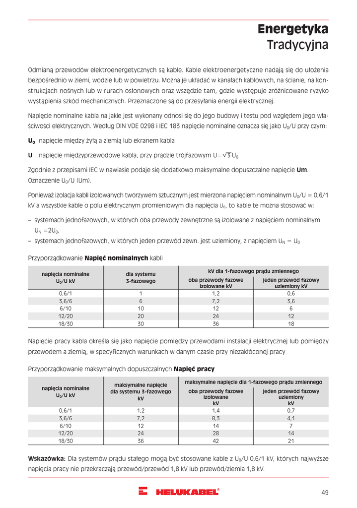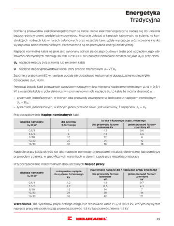 Energetyka Tradycyjna Odmianą przewodów elektroenergetycznych są kable. Kable elektroenergetyczne nadają się do ułożenia bezpośrednio w ziemi, wodzie lub w powietrzu. Można je układać w kanałach kablowych, na ścianie, na konstrukcjach nośnych lub w rurach osłonowych oraz wszędzie tam, gdzie występuje zróżnicowane ryzyko wystąpienia szkód mechanicznych. Przeznaczone są do przesyłania energii elektrycznej. Napięcie nominalne kabla na jakie jest wykonany odnosi się do jego budowy i testu pod względem jego właściwości elektrycznych. Według DIN VDE 0298 i IEC 183 napięcie nominalne oznacza się jako U0/U przy czym: U0 napięcie między żyłą a ziemią lub ekranem kabla U napięcie międzyprzewodowe kabla, przy prądzie trójfazowym U=√3̄ U0 Zgodnie z przepisami IEC w nawiasie podaje się dodatkowo maksymalne dopuszczalne napięcie Um. Oznaczenie U0/U (Um). Ponieważ izolacja kabli izolowanych tworzywem sztucznym jest mierzona napięciem nominalnym U0/U = 0,6/1 kV a wszystkie kable o polu elektrycznym promieniowym dla napięcia U0, to kable te można stosować w: – systemach jednofazowych, w których oba przewody zewnętrzne są izolowane z napięciem nominalnym UN =2U0, – systemach jednofazowych, w których jeden przewód zewn. jest uziemiony, z napięciem UN = U0 Przyporządkowanie Napięć nominalnych kabli napięcia nominalne U0/U kV dla systemu 3-fazowego 0,6/1 3,6/6 6/10 12/20 18/30 1 6 10 20 30 kV dla 1-fazowego prądu zmiennego oba przewody fazowe izolowane kV jeden przewód fazowy uziemiony kV 1,2 7,2 12 24 36 0,6 3,6 6 12 18 Napięcie pracy kabla określa się jako napięcie pomiędzy przewodami instalacji elektrycznej lub pomiędzy przewodem a ziemią, w specyficznych warunkach w danym czasie przy niezakłóconej pracy Przyporządkowanie maksymalnych dopuszczalnych Napięć pracy napięcia nominalne U0/U kV maksymalne napięcie dla systemu 3-fazowego kV 0,6/1 3,6/6 6/10 12/20 18/30 1,2 7,2 12 24 36 maksymalne napięcie dla 1-fazowego prądu zmiennego oba przewody fazowe izolowane kV jeden przewód fazowy uziemiony kV 1,4 8,3 14 28 42 0,7 4,1 7 14 21 Wskazówka: Dla systemów prądu stałego mogą być stosowane kable z U0/U 0,6/1 kV, których najwyższe napięcia pracy nie przekraczają przewód/przewód 1,8 kV lub przewód/ziemia 1,8 kV. 49 PODSTAWOWE KABLE ENERGETYCZNE NN W OFERCIE HELUKABEL® Kable produkowane są najczęściej jako 4- lub 5-żyłowe z żyłami miedzianymi lub aluminiowymi o izolacji i powłoce z polwinitu PVC lub z polietylenu usieciowanego XLPE. NYY-J Q Q kabel ziemny, 0,6/1 kV, z aprobatą VDE NYCY kabel ziemny z przewodem koncentrycznym, 0,6/1 kV, z aprobatą VDE. Napięcie testu: 4kV/50Hz Zakres temperatur: • elastycznie od -5°C do +50°C • stacjonarnie od -40°C do +70°C Napięcie testu: 4kV/50Hz Zakres temperatur: • elastycznie od -5°C do +50°C • stacjonarnie od -40°C do +70°C Maksymalna dopuszczalna temperatura pracy żyły roboczej: +70°C Maksymalna dopuszczalna temperatura pracy żyły roboczej: +70°C Maksymalna krótkotrwała temperatura pracy Maksymalna krótkotrwała temperatura pracy przewodu: +160°C/5s przewodu: +160°C/5s Zastosowanie: w przemyśle, elektrowniach, budowie rozdzielnic, oświetleniu ulicznym, przyłączach domów oraz jako kabel sterowniczy do przesyłu impulsów sterujących i regulujących oraz wartości pomiarowych. Zastosowanie: w przemyśle, elektrowniach, budowie rozdzielnic, oświetleniu ulicznym, przyłączach domów oraz jako kabel sterowniczy do przesyłu impulsów sterujących i regulujących oraz wartości pomiarowych. NYCWY kabel ziemny z przewodem koncentrycznym, 0,6/1 kV, z aprobatą VDEE. Q Napięcie testu: 4kV/50Hz Zakres temperatur: • elastycznie od -5°C do +50°C • stacjonarnie od -40°C do +70°C Maksymalna dopuszczalna temperatura pracy żyły roboczej: +70°C Maksymalna krótkotrwała temperatura pracy przewodu: +160°C/5s Zastosowanie: w przemyśle, budowie rozdzielnic, elektrowniach, sieciach miejscowych oraz jako kabel sterowniczy. Do układania w ziemi, wodzie, betonie i kanałach, pomieszczeniach wew. 50 YKXS 0,6/1kV, ziemny kabel energetyczny w izolacji XLPE oraz powłoce zewnętrznej z PVC Q Napięcie testu: 4kV/50Hz Temperatura układania: min. -5°C Temperatura pracy: od -30°C do +90°C Maksymalna dopuszczalna temperatura pracy żyły roboczej: +90°C Maksymalna krótkotrwała temperatura pracy przewodu: +250°C/5s Zastosowanie: instalacje przemysłowe, rozdzielcze i zasilające. Na stałę do układania bezpośrednio w ziemi. wew i na zew. Pomieszczeń, w kanałach kablowych, w betonie lub w wodzie. YAKXS 0,6/1kV ziemny kabel energetyczny w izolacji XLPE oraz powłoce zewnętrznej z PVC, E Q YKY 0,6/1kV, kabel ziemny Napięcie testu: 4kV/50Hz Temperatura układania: min. -5°C Temperatura pracy: od -30°C do +90°C Napięcie testu: 4kV/50Hz Zakres temperatur: • elastyczne: od -5°C do +50°C • stacjonarnie: od -30°C do +70°C Maksymalna dopuszczalna temperatura pracy żyły roboczej: +90°C Maksymalna dopuszczalna temperatura pracy żyły roboczej: +70°C Maksymalna krótkotrwała temperatura pracy Maksymalna krótkotrwała temperatura pracy przewodu: +250°C/5s przewodu: +160°C/5s Zastosowanie: instalacje przemysłowe, rozdzielcze i zasilające. Na stałę do układania bezpośrednio w ziemi. wew i na zew. pomieszczeń, w kanałach kablowych, w betonie lub w wodzie. Zastosowanie: pomieszczenia wew., elektrownie, rozdzielnie, w sieciach miejscowych jeśli nie grozi wystąpienie szkód mechanicznych, w ziemi, betonie, wodzie. STANDARDOWE WARUNKI EKSPLOATACYJNE I ZALECENIA DOTYCZĄCE NIESTANDARDOWYCH WARUNKÓW EKSPLOATACYJNYCH Warunki układania kabli energetycznych Głębokość układania, liczoną jako geometryczną odległość od powierzchni do osi kabla, a w przypadku wiązek trójżyłowych jako odległość od powierzchni do osi wiązki, ustala się na 70 cm. Dla większych głębokości układania konieczne będzie proporcjona