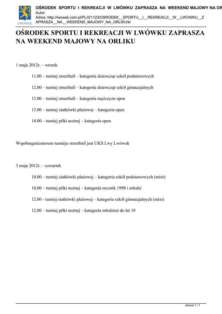 OŚRODEK SPORTU I REKREACJI W LWÓWKU ZAPRASZA NA WEEKEND MAJOWY NA OR Autor: Adres: http://lwowek.com.pl/PL/0/1123/OSRODEK__SPORTU__I__REKREACJI__W__LWOWKU__Z APRASZA__NA__WEEKEND_MAJOWY_NA_ORLIKU/k/ OŚRODEK SPORTU I REKREACJI W LWÓWKU ZAPRASZA NA WEEKEND MAJOWY NA ORLIKU 1 maja 2012r. – wtorek 11.00 – turniej streetball – kategoria dziewcząt szkół podstawowych 12.00 – turniej streetball – kategoria dziewcząt szkół gimnazjalnych 13.00 – turniej streetball – kategoria mężczyzn open 13.00 – turniej siatkówki plażowej – kategoria open 14.00 – turniej piłki nożnej – kategoria open Współorganizatorem turnieju streetball jest UKS Lwy Lwówek 3 maja 2012r. – czwartek 10.00 – turniej siatkówki plażowej – kategoria szkół podstawowych (mixt) 10.00 – turniej piłki nożnej – kategoria rocznik 1998 i młodsi 12.00 - turniej siatkówki plażowej – kategoria szkół gimnazjalnych (mixt) 12.00 – turniej piłki nożnej – kategoria młodzież do lat 18 strona 1 / 1 Powered by TCPDF (www.tcpdf.org)