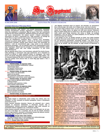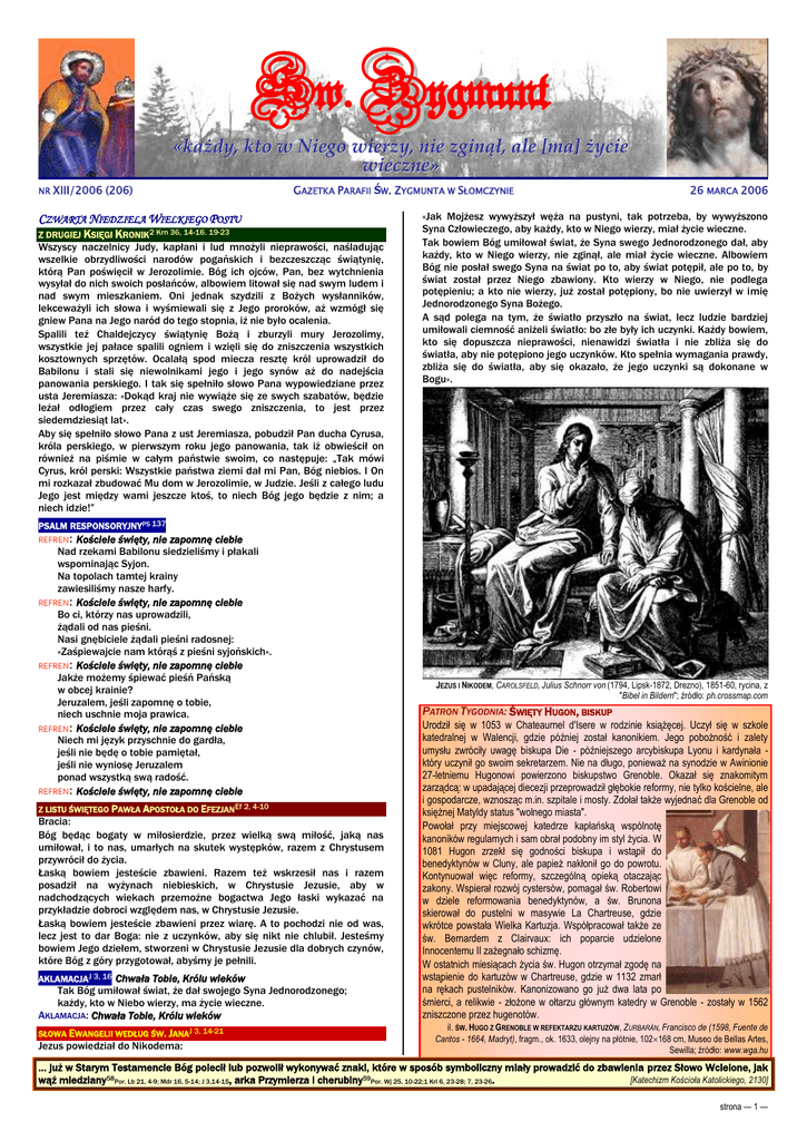 Sw. Zygmunt «każdy, kto w Niego wierzy, nie zginął, ale [ma] życie wieczne» NR XIII/2006 (206) GAZETKA PARAFII ŚW. ZYGMUNTA W SŁOMCZYNIE CZWARTA NIEDZIELA WIELKIEGO POSTU Z DRUGIEJ KSIĘGI KRONIK2 Krn 36, 14-16. 19-23 Wszyscy naczelnicy Judy, kapłani i lud mnożyli nieprawości, naśladując wszelkie obrzydliwości narodów pogańskich i bezczeszcząc świątynię, którą Pan poświęcił w Jerozolimie. Bóg ich ojców, Pan, bez wytchnienia wysyłał do nich swoich posłańców, albowiem litował się nad swym ludem i nad swym mieszkaniem. Oni jednak szydzili z Bożych wysłanników, lekceważyli ich słowa i wyśmiewali się z Jego proroków, aż wzmógł się gniew Pana na Jego naród do tego stopnia, iż nie było ocalenia. Spalili też Chaldejczycy świątynię Bożą i zburzyli mury Jerozolimy, wszystkie jej pałace spalili ogniem i wzięli się do zniszczenia wszystkich kosztownych sprzętów. Ocalałą spod miecza resztę król uprowadził do Babilonu i stali się niewolnikami jego i jego synów aż do nadejścia panowania perskiego. I tak się spełniło słowo Pana wypowiedziane przez usta Jeremiasza: «Dokąd kraj nie wywiąże się ze swych szabatów, będzie leżał odłogiem przez cały czas swego zniszczenia, to jest przez siedemdziesiąt lat». Aby się spełniło słowo Pana z ust Jeremiasza, pobudził Pan ducha Cyrusa, króla perskiego, w pierwszym roku jego panowania, tak iż obwieścił on również na piśmie w całym państwie swoim, co następuje: „Tak mówi Cyrus, król perski: Wszystkie państwa ziemi dał mi Pan, Bóg niebios. I On mi rozkazał zbudować Mu dom w Jerozolimie, w Judzie. Jeśli z całego ludu Jego jest między wami jeszcze ktoś, to niech Bóg jego będzie z nim; a niech idzie!” 26 MARCA 2006 «Jak Mojżesz wywyższył węża na pustyni, tak potrzeba, by wywyższono Syna Człowieczego, aby każdy, kto w Niego wierzy, miał życie wieczne. Tak bowiem Bóg umiłował świat, że Syna swego Jednorodzonego dał, aby każdy, kto w Niego wierzy, nie zginął, ale miał życie wieczne. Albowiem Bóg nie posłał swego Syna na świat po to, aby świat potępił, ale po to, by świat został przez Niego zbawiony. Kto wierzy w Niego, nie podlega potępieniu; a kto nie wierzy, już został potępiony, bo nie uwierzył w imię Jednorodzonego Syna Bożego. A sąd polega na tym, że światło przyszło na świat, lecz ludzie bardziej umiłowali ciemność aniżeli światło: bo złe były ich uczynki. Każdy bowiem, kto się dopuszcza nieprawości, nienawidzi światła i nie zbliża się do światła, aby nie potępiono jego uczynków. Kto spełnia wymagania prawdy, zbliża się do światła, aby się okazało, że jego uczynki są dokonane w Bogu». PSALM RESPONSORYJNYPS 137 REFREN: Kościele święty, nie zapomnę ciebie Nad rzekami Babilonu siedzieliśmy i płakali wspominając Syjon. Na topolach tamtej krainy zawiesiliśmy nasze harfy. REFREN: Kościele święty, nie zapomnę ciebie Bo ci, którzy nas uprowadzili, żądali od nas pieśni. Nasi gnębiciele żądali pieśni radosnej: «Zaśpiewajcie nam którąś z pieśni syjońskich». REFREN: Kościele święty, nie zapomnę ciebie Jakże możemy śpiewać pieśń Pańską w obcej krainie? Jeruzalem, jeśli zapomnę o tobie, niech uschnie moja prawica. REFREN: Kościele święty, nie zapomnę ciebie Niech mi język przyschnie do gardła, jeśli nie będę o tobie pamiętał, jeśli nie wyniosę Jeruzalem ponad wszystką swą radość. REFREN: Kościele święty, nie zapomnę ciebie Z LISTU ŚWIĘTEGO PAWŁA APOSTOŁA DO EFEZJANEf 2, 4-10 Bracia: Bóg będąc bogaty w miłosierdzie, przez wielką swą miłość, jaką nas umiłował, i to nas, umarłych na skutek występków, razem z Chrystusem przywrócił do życia. Łaską bowiem jesteście zbawieni. Razem też wskrzesił nas i razem posadził na wyżynach niebieskich, w Chrystusie Jezusie, aby w nadchodzących wiekach przemożne bogactwa Jego łaski wykazać na przykładzie dobroci względem nas, w Chrystusie Jezusie. Łaską bowiem jesteście zbawieni przez wiarę. A to pochodzi nie od was, lecz jest to dar Boga: nie z uczynków, aby się nikt nie chlubił. Jesteśmy bowiem Jego dziełem, stworzeni w Chrystusie Jezusie dla dobrych czynów, które Bóg z góry przygotował, abyśmy je pełnili. AKLAMACJAJ 3, 16 Chwała Tobie, Królu wieków Tak Bóg umiłował świat, że dał swojego Syna Jednorodzonego; każdy, kto w Niebo wierzy, ma życie wieczne. AKLAMACJA: Chwała Tobie, Królu wieków SŁOWA EWANGELII WEDŁUG ŚW. JANAJ 3, 14-21 Jezus powiedział do Nikodema: JEZUS I NIKODEM, CAROLSFELD, Julius Schnorr von (1794, Lipsk-1872, Drezno), 1851-60, rycina, z "Bibel in Bildern"; źródło: ph.crossmap.com PATRON TYGODNIA: ŚWIĘTY HUGON, BISKUP Urodził się w 1053 w Chateaurnel d'Isere w rodzinie książęcej. Uczył się w szkole katedralnej w Walencji, gdzie później został kanonikiem. Jego pobożność i zalety umysłu zwróciły uwagę biskupa Die - późniejszego arcybiskupa Lyonu i kardynała który uczynił go swoim sekretarzem. Nie na długo, ponieważ na synodzie w Awinionie 27-letniemu Hugonowi powierzono biskupstwo Grenoble. Okazał się znakomitym zarządcą: w upadającej diecezji przeprowadził głębokie reformy, nie tylko kościelne, ale i gospodarcze, wznosząc m.in. szpitale i mosty. Zdołał także wyjednać dla Grenoble od księżnej Matyldy status "wolnego miasta". Powołał przy miejscowej katedrze kapłańską wspólnotę kanoników regularnych i sam obrał podobny im styl życia. W 1081 Hugon zrzekł się godności biskupa i wstąpił do benedyktynów w Cluny, ale papież nakłonił go do powrotu. Kontynuował więc reformy, szczególną opieką otaczając zakony. Wspierał rozwój cystersów, pomagał św. Robertowi w dziele reformowania benedyktynów, a św. Brunona skierował do pustelni w masywie La Chartreuse, gdzie wkrótce powstała Wielka Kartuzja. Współpracował także ze św. Bernardem z Clairvaux: ich