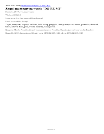 Adres URL strony http://www.rozrywka24.net/32914 Zespół muzyczny na wesele "DO-RE-MI" Pruszków, 05-800, woj. mazowieckie Telefon: 602326641 Strona www: http://www.doremi-bis.webpark.pl Email: [email protected] Zespół, muzyczny, imprezy, rodzinne, bale, eventy, przyjęcia, obsługa muzyczna, wesele, pruszków, do-re-mi, taniec, zabawa, disco, polo, wesela, oczepiny, uroczystości. Kategorie: Muzyka Pruszków, Zespoły muzyczne i muzycy Pruszków, Organizacja wesel i sale weselne Pruszków Numer ID: 32914, liczba odsłon: 166, aktywacja: 14/08/2010 15:40:26, edycja: 14/08/2010 15:40:26 Strona 1 / 1