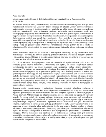 Paula Sawicka Mowa nienawiści w Polsce. Z doświadczeń Stowarzyszenia Otwarta Rzeczpospolita (8.04.2014) Na murach naszych miast, na stadionach, podczas ulicznych demonstracji nie brakuje haseł wyrażających nienawiść do „innych”. Treści szerzące lub choćby „tylko” usprawiedliwiające nietolerancję, wrogość i dyskryminację ze względu na takie cechy jak rasa, pochodzenie etniczne, narodowość, płeć, tożsamość płciowa, orientacja psychoseksualna, wiek, czy światopogląd religijny są dotkliwie obecne w polskich mediach, publikacjach, w Internecie, w wypowiedziach osób publicznych. Nierzadko przechodzień, współpasażer, a nawet urzędnik, funkcjonariusz policji czy poseł daje publicznie i bez wstydu wyraz rasistowskim, czy homofobicznym poglądom. Ich głosiciele może nie są bardzo liczni, ale skoro te zachowania rzadko spotykają się z potępieniem - zazwyczaj nie spotykają się z żadną reakcją – brak reakcji biorą za przyzwolenie. Przybysz odwiedzający Polskę patrzy na to i słucha ze zdumieniem. Co więcej, sądzi, że wykrzywiona nienawiścią gęba kibola jest naszą narodową twarzą. Mowa nienawiści czyni zło po dwakroć – ma wymiar społeczny, bo jej tolerowanie psuje demokrację, i moralny, bo narusza osobistą godność człowieka. Tuż za nią podążają przemoc i nienawistne czyny. Dlatego o mowie nienawiści nie powinno się mówić w oderwaniu od czynów, do których nieuchronnie prowadzą. Od 15 lat Otwarta Rzeczpospolita stara się uwrażliwiać społeczeństwo polskie na zło szerzone przez mowę nienawiści. Ośmielamy się sądzić, że nasza aktywność sprzyja powstawaniu inicjatyw na rzecz tolerancji oraz sprzeciwu wobec aktów nienawiści i przemocy. To ważne, bo jednocześnie ożywiana długotrwałym brakiem reakcji społecznej mowa nienawiści pojawia się w przestrzeni publicznej coraz bardziej otwarcie, z wolna lecz systematycznie dołączają do niej nienawistne czyny. Zakorzeniona jest w zadawnionych, głęboko tkwiących stereotypach, resentymentach i uprzedzeniach, dlatego tak często i łatwo ujawnia się we wszystkich niemal środowiskach i tak trudno ją wykorzenić. Opinie ekspertów Otwartej Rzeczpospolitej upoważniają do stwierdzenia, że na tych utrwalonych stereotypach i resentymentach żerują ruchy skrajne, coraz bardziej widoczne w Polsce i posługujące się nienawistnymi hasłami. Systematycznie monitorujemy i opisujemy budzące niepokój zjawiska związane z wyrażaniem mowy nienawiści. Ten materiał pozwala nam oceniać ich skalę oraz skuteczność organów powołanych do przeciwdziałania im oraz ścigania zgodnie z obowiązującym w Polsce prawem. Odnotowując, że obecnie zaczyna się coś zmieniać na lepsze, ubolewamy jednak, że ocena wciąż nie wypada dobrze. Instytucje, które powinny być naturalnym i ważnym sojusznikiem obywatelskich działań nie udzielają nam wystarczająco mocnego i zdecydowanego wsparcia. Publicznie wyrażana mowa nienawiści nie jest dostatecznie ścigana, piętnowana i karana przez policję, prokuratury i sądy. Jest bagatelizowana, a do niedawna organy ścigania, choć zobowiązuje je do tego prawo, bardzo rzadko z własnej inicjatywy wszczynały postępowania. Zazwyczaj potrzebne jest zawiadomienie obywateli. Bywa, że policja – niezgodnie z prawem i pod wymyślonymi pretekstami – odmawia ich przyjęcia. Mowa nienawiści nie spotyka się z zadowalającą reakcją osób publicznych, urzędników państwowych, samorządowych, parlamentarzystów. Z przykrością stwierdzamy, że standardy zachowania obowiązujące w każdym demokratycznym państwie prawa w tych środowiskach wciąż nie są powszechne. Nadal dowiadujemy się o odległych od tych standardów, bulwersujących orzeczeniach prokuratorów, sędziów i biegłych dających wyraz przyzwoleniu a nawet akceptacji dla szerzenia nienawiści i bolesnych stereotypów. Wśród nich znalazły się orzeczenia uznające argumentację sprawców, że wyprężona ręka oznacza pozdrowienie rzymskie, a nie faszystowskie, że swastyka to hinduski znak miłości, okrzyk „wypędzimy Żydów z Polski” nie nawołuje do nienawiści, bo musiałoby brzmieć „wypędźmy”. Ostatnio, posiłkując się opinią biegłej, że określenie „żydowskie ścierwo” ma charakter „stereotypowy”, „ironiczny”, „satyryczny” prokurator umorzyła postępowanie, bo uznała, że „myślenia stereotypowego nie można uznać za obelżywe, jest ono bowiem uwarunkowane historycznie, kulturowo, a nawet środowiskowo”. Kiedy mamy do czynienia z mową nienawiści to zazwyczaj nie mamy wątpliwości, że to była nienawiść. Natomiast, z jakichś powodów, ci i podobnie myślący prokuratorzy i sędziowie zaczynają uprawiać swego rodzaju gry prawne, stosować język pełen eufemizmów, pytać sprawcę o intencje, jakby starali się mowę nienawiści czynić bezkarną, najwyraźniej nie widząc zła, jakie niesie. Zaś inni sądzą, że karanie czy choćby powstrzymywanie mowy nienawiści jest pogwałceniem fundamentalnego prawa wolności słowa. Nie chodzi tu zresztą o karanie za słowa więzieniem lecz o jasny przekaz, że mowa nienawiści jest złem. Jeśli kara ma mieć funkcję wychowawczą, taki przekaz powinien nieść wyrok ogłaszany w imieniu Rzeczpospolitej. Tak było w przypadku autora antysemickich okrzyków, którego sprawę sąd umorzył pod warunkiem, że sprawca obejrzy film pt. Cud purymowy o podobnym mu antysemicie, który dowiedział się, że sam jest Żydem. Sądy mają wiele takich możliwości, a niestety rzadko z nich korzystają. Bywa, i to wcale nierzadko, że mowa nienawiści wylewa się, m.in. za sprawą mediów, z polskiego parlamentu. Jeden z posłów po wyborze Baracka Obamy na prezydenta Stanów Zjednoczonych oznajmił z trybuny sejmowej, że jest to „koniec cywilizacji białego człowieka”. Jego wypowiedź nie spotkała się z należytą reakcją. Dziś język nienawiści cor