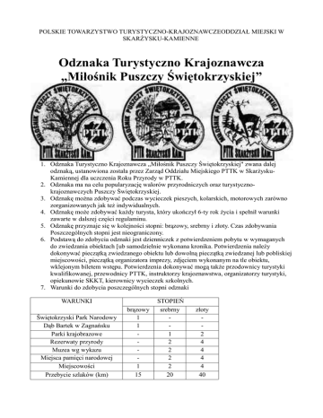 POLSKIE TOWARZYSTWO TURYSTYCZNO-KRAJOZNAWCZEODDZIAŁ MIEJSKI W SKARŻYSKU-KAMIENNE Odznaka Turystyczno Krajoznawcza „Miłośnik Puszczy Świętokrzyskiej” 1. Odznaka Turystyczno Krajoznawcza „Miłośnik Puszczy Świętokrzyskiej" zwana dalej odznaką, ustanowiona została przez Zarząd Oddziału Miejskiego PTTK w SkarżyskuKamiennej dla uczczenia Roku Przyrody w PTTK. 2. Odznaka ma na celu popularyzację walorów przyrodniczych oraz turystycznokrajoznawczych Puszczy Świętokrzyskiej. 3. Odznakę można zdobywać podczas wycieczek pieszych, kolarskich, motorowych zarówno zorganizowanych jak też indywidualnych. 4. Odznakę może zdobywać każdy turysta, który ukończył 6-ty rok życia i spełnił warunki zawarte w dalszej części regulaminu. 5. Odznakę przyznaje się w kolejności stopni: brązowy, srebrny i złoty. Czas zdobywania Poszczególnych stopni jest nieograniczony. 6. Podstawą do zdobycia odznaki jest dzienniczek z potwierdzeniem pobytu w wymaganych do zwiedzania obiektach [ub samodzielnie wykonana kronika. Potwierdzenia należy dokonywać pieczątką zwiedzanego obiektu lub dowolną pieczątką zwiedzanej lub pobliskiej miejscowości, pieczątką organizatora imprezy, zdjęciem wykonanym na tle obiektu, wklejonym biletem wstępu. Potwierdzenia dokonywać mogą także przodownicy turystyki kwalifikowanej, przewodnicy PTTK, instruktorzy krajoznawstwa, organizatorzy turystyki, opiekunowie SKKT, kierownicy wycieczek szkolnych. 7. Warunki do zdobycia poszczególnych stopni odznaki WARUNKI Świętokrzyski Park Narodowy Dąb Bartek w Zagnańsku Parki krajobrazowe Rezerwaty przyrody Muzea wg wykazu Miejsca pamięci narodowej Miejscowości Przebycie szlaków (km) brązowy 1 1 1 15 STOPIEŃ srebrny 1 2 2 2 2 20 złoty 2 4 4 4 4 40 8. Na odznakę stopnia wyższego nie można zaliczać tras oraz obiektów zwiedzanych podczas zdobywania stopnia niższego. 9. Wykaz szlaków oraz obiektów ujęty jest w Kanonie do odznaki. 10. Wycieczki odbyte w czasie zdobywania odznaki mogą być zaliczane na inne odznaki zgodnie z regulaminami ich zdobywania. 11. Weryfikację Odznaki prowadzi Komisja Turystyki Pieszej i Górskiej Oddziału Miejskiego PTTK, ul. Słowackiego 25, 26-110 Skarżysko Kamienna. 12. Odznaka jest odpłatna. 13. Za wybitne zasługi w popularyzacji turystyki i krajoznawstwa Zarząd Oddziału Miejskiego PTTK w Skarżysku-Kamiennej może przyznać odznakę w stopniu złotym honorowo. 14. Prawo interpretacji niniejszego regulaminu należy do Oddziału Miejskiego PTTK w Skarżysku-Kamiennej. 15. Odznaka wchodzi w życie z dniem 18.04.2008r. KANON KRAJOZNAWCZY l. Świętokrzyski Park Narodowy (Muzeum Parku na Świętym Krzyżu, gołoborze na Świętym Krzyżu, Łysica) II. PARKI KRAJOBRAZOWE (Jeleniowski, Sieradowicki, Suchedniowsko-Oblęgorski) III. REZERWATY PRZYRODY ( Barania Góra, Barcza, Ciechostowice, Dalejów, Gagaty Sołtysowskie, Małe Gołoborze , Góra Jeleniowska, Góra Sieradowska, Górna Krasna, Kamień Michniowski, Krzemionki, Perzowa Góra, Rosochacz, Skałki Piekło pod Niekłaniem, Skały pod Adamowem, Skały w Krynkach, Szczytniak, Świnia Góra, ,Wykus). IV. MUZEA - Bodzentyn - Zabytkowa Zagroda Czernikiewiczów - Janowice - Muzeum „Ponurego” Jana Piwnika - Kakonin - Izba Etnograficzna w zabytkowej zagrodzie " - Końskie - Izba Pamięci i Tradycji Ziemi Koneckiej (PTTK) - Krzemionki Opatowskie- Muzeum i Rezerwat Archeologiczno-Przyrodniczy - Michniów - Muzeum Martyrologii Wsi Polskiej - Oblęgorek - Muzeum Henryka Sienkiewicza - Oblęgorek - Muzeum Kowalstwa Artystycznego „Stara Kuźnia" --Ostrowiec Świętokrzyski - Muzeum Historyczno-Archeologiczne - Sielpia Wielka - Muzeum Zagłębia Staropolskiego - Skarżysko-Kamienna..- Muzeum im. Orła Białego - Słupia Nowa - Muzeum Starożytnego Hutnictwa im. M. Radwana - Starachowice - Muzeum Regionalne PTTK - Starachowice - Muzeum Przyrody i Techniki - Stara Kuźnica - Kuźnia Mechaniczna - Święta Katarzyna - Muzeum Minerałów i Skamieniałości - Święty Krzyż - Muzeum Misyjne Misjonarzy Oblatów - Wąchock - Muzeum Ojców Cystersów. V. MIEJSCA PAMIĘCI NARODOWEJ (pomniki i tablice pamiątkowe w miejscu bitew, martyrologii narodu polskiego, cmentarze wojenne na terenie objętym odznaką). VI. MIEJSCOWOŚCI (Bodzentyn, Kałków-Godów, Końskie, Oblęgorek, Ostrowiec Świętokrzyski, Samsonów, Skarżysko-Kamienna, Starachowice, Suchedniów, Wąchock). VII. SZLAKI PIESZE Szlak czerwony im. Edmunda Massalskiego Gołoszyce – G. Szczytniak - G. Jeleniowska - Paprocice - Trzcianka - Święty Krzyż - Kakonin - Kapliczka Św. Mikołaja - Łysica - Święta Katarzyna -G. Wymyślona - G. Radostowa - Przełom Lubrzanki - G. Klonówka - Masłów -Dąbrowa - G. Sosnowica - Tumlin PKP - G. Grodowa - G. Kamień - Miedziana Góra - G. Ciosowa - G. Barania - G. Siniewska - Góra Perzowa - Kuźniaki -łączna długość 105 km Szlak czerwony Skarżysko-Kamienna - Marcinków - Wąchock - Starachowice - Kałków Godów -łączna długość 60 km. Szlak niebieski im. Stanisława Malanowicza Kuźniaki - G. Dobrzeszowska - Gruszka - Jóźwików - Mościska Małe - Sielpia Wielka - Piekło Niebo - Końskie - Stara Kuźnica - Piasek - Furmanów -Rezerwat Skałki Piekło pod Niekłaniem Borki - Rędocin - Rez. Ciechostowice -Majdów - Cmentarz partyzancki pod Skarbową Górą Pogorzałe - łączna długość 81 km Szlak niebieski im. Stanisława Jeżewskiego Pętkowice - Bałtów Młyn - Rez. Archeologiczny Krzemionki Opatowskie - Sudół -Dębowa Wola Kunów PKP - Nietulisko - Doły Biskupie - Kałków Wióry - Kątków Godów - Pokrzywnica Włochy - Grzegorzewice - Nowa Słupia - Święty Krzyż -łączna długość - 80 km Szlak niebieski im. Edwarda Wołoszyna Wąchock PKP - Polana Langiewicza - Wykus - Sieradowice - Bodzentyn -G. Miejska - Święta Katarzyna - Krajno Zagórze - Ciekoty - Przełom Lubrzanki -Mąchocice - Cedzyna - łączna długość 45,5 km Szlak zielony Bliżyn PKP - Piekło Dalejowskie - Brama