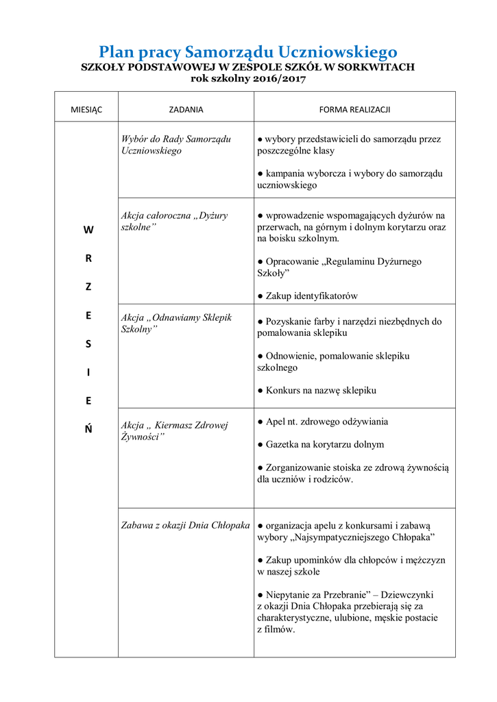 Plan pracy Samorzadu Uczniowskiego tabelka