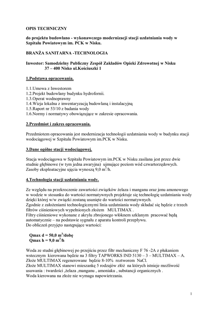 Przedmiotem opracowania jest modernizacja technologii uzdatniania wody w budynku stacji