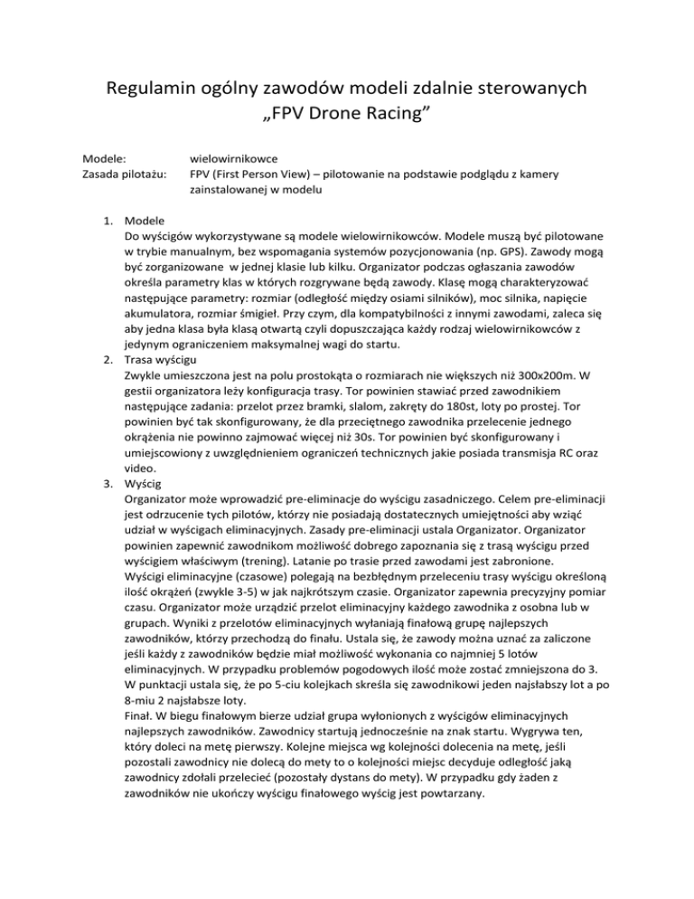 Regulamin ogólny zawodów modeli zdalnie sterowanych „FPV Drone Racing” Modele: Zasada pilotażu: wielowirnikowce FPV (First Person View) – pilotowanie na podstawie podglądu z kamery zainstalowanej w modelu 1. Modele Do wyścigów wykorzystywane są modele wielowirnikowców. Modele muszą być pilotowane w trybie manualnym, bez wspomagania systemów pozycjonowania (np. GPS). Zawody mogą być zorganizowane w jednej klasie lub kilku. Organizator podczas ogłaszania zawodów określa parametry klas w których rozgrywane będą zawody. Klasę mogą charakteryzować następujące parametry: rozmiar (odległość między osiami silników), moc silnika, napięcie akumulatora, rozmiar śmigieł. Przy czym, dla kompatybilności z innymi zawodami, zaleca się aby jedna klasa była klasą otwartą czyli dopuszczająca każdy rodzaj wielowirnikowców z jedynym ograniczeniem maksymalnej wagi do startu. 2. Trasa wyścigu Zwykle umieszczona jest na polu prostokąta o rozmiarach nie większych niż 300x200m. W gestii organizatora leży konfiguracja trasy. Tor powinien stawiać przed zawodnikiem następujące zadania: przelot przez bramki, slalom, zakręty do 180st, loty po prostej. Tor powinien być tak skonfigurowany, że dla przeciętnego zawodnika przelecenie jednego okrążenia nie powinno zajmować więcej niż 30s. Tor powinien być skonfigurowany i umiejscowiony z uwzględnieniem ograniczeń technicznych jakie posiada transmisja RC oraz video. 3. Wyścig Organizator może wprowadzić pre-eliminacje do wyścigu zasadniczego. Celem pre-eliminacji jest odrzucenie tych pilotów, którzy nie posiadają dostatecznych umiejętności aby wziąć udział w wyścigach eliminacyjnych. Zasady pre-eliminacji ustala Organizator. Organizator powinien zapewnić zawodnikom możliwość dobrego zapoznania się z trasą wyścigu przed wyścigiem właściwym (trening). Latanie po trasie przed zawodami jest zabronione. Wyścigi eliminacyjne (czasowe) polegają na bezbłędnym przeleceniu trasy wyścigu określoną ilość okrążeń (zwykle 3-5) w jak najkrótszym czasie. Organizator zapewnia precyzyjny pomiar czasu. Organizator może urządzić przelot eliminacyjny każdego zawodnika z osobna lub w grupach. Wyniki z przelotów eliminacyjnych wyłaniają finałową grupę najlepszych zawodników, którzy przechodzą do finału. Ustala się, że zawody można uznać za zaliczone jeśli każdy z zawodników będzie miał możliwość wykonania co najmniej 5 lotów eliminacyjnych. W przypadku problemów pogodowych ilość może zostać zmniejszona do 3. W punktacji ustala się, że po 5-ciu kolejkach skreśla się zawodnikowi jeden najsłabszy lot a po 8-miu 2 najsłabsze loty. Finał. W biegu finałowym bierze udział grupa wyłonionych z wyścigów eliminacyjnych najlepszych zawodników. Zawodnicy startują jednocześnie na znak startu. Wygrywa ten, który doleci na metę pierwszy. Kolejne miejsca wg kolejności dolecenia na metę, jeśli pozostali zawodnicy nie dolecą do mety to o kolejności miejsc decyduje odległość jaką zawodnicy zdołali przelecieć (pozostały dystans do mety). W przypadku gdy żaden z zawodników nie ukończy wyścigu finałowego wyścig jest powtarzany. 4. Bezpieczeństwo Organizator zobowiązany jest zapewnić bezpieczeństwo widzom i zawodnikom wyścigu. Tor więc powinien być należycie odgrodzony od publiczności. Dla zawodników powinna być wyznaczona strefa bezpieczeństwa, której przekroczenie oznacza zerową punktację za dany lot. Zawodnicy mogą wchodzić na tor tylko w celu umieszczenia lub zabrania modelu i tylko w czasie gdy wyścig nie jest rozgrywany. Ponadto Organizator musi zwrócić uwagę na częstotliwości RC oraz video na jakich latają zawodnicy zapewniając należytą separację dla startujących zawodników a pozostałym zabraniając włączania modeli/nadajników poza swoim lotem. Parametry zawodów podawane w zgłoszeniu: Data: Miejsce: Organizator: Klasy: Opis trasy: Trening (kiedy): Zasady pre-eliminacji (kiedy, ilość okrążeń planowanych/wymaganych, ew. max czas okrążeń wymaganych): Zasady eliminacji (kiedy, loty pojedyncze/grupowe (ile), planowana ilość biegów, zasada punktacji). * - zasada punktacji, np.: ominięcie przeszkody (+5s lub wymagane zaliczenie) lub np. dodatkowe okrążenie „karnej flagi” Zasady Finału (planowana ilość zawodników w finale, kary za ominięcie przeszkód) Opracowanie: Krzysztof Hilbrycht