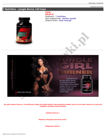 Informacje o produkcie Utworzono 02-03-2017 7 Nutrition - Jungle Burne 120 kaps Cena : 89,00 zł su pe ro dz y w ki .p l Producent : 7 nutrition Stan magazynowy : bardzo wysoki Średnia ocena : brak recenzji Nie tylko spalacz tłuszczu. To perfekcyjny środek dla każdej kobiety. Opracowaliśmy produkt, który nie ma sobie równych na rynku pod względem spełnienia potrzeb kobiet. Spalanie tłuszczu + Redukcja zalegającej pod skórą wody + Pielęgnacja włosów + Wygenerowano w programie www.oscGold.com Duży wzrost libido i satysfakcji seksualnej (!) A to wszystko w jednym. Jungle Girl Burner od 7Nutrition. Połączenie 16stu składników takich jak Momordica Charantia, Mniszek Lekarski, Pieprz kajeński, Piperyna, Garcinia Gambogia, dało piorunujący, sprawdzony efekt. Gwarantujemy wysoką skuteczność przez podniesienie termogenezy ciała i maksymalną potliwość. Oprócz bardzo mocnych i sprawdzonych Pieprzu Kajeńskiego w połączeniu z Garcinia Cambogia w składzie mamy unikatowe połączenie Balsamki Ogórkowatej i Kory Wierzby. Zdobywając coraz większa popularność powoli stają się jednymi z najskuteczniejszych składników najlepszych spalaczy. .p l Balsamka Ogórkowata : Przepękla (Momordica charantia), nazywana inaczej balsamką ogórkowatą, jabłkiem/gruszką balsamiczną czy gorzkim melonem. Zespół badaczy z Garvan Institue of Medical Research i Shanghai Institute of Materia Medica wyekstrahował z balsamki 4 bioaktywne składniki. Aktywują one enzym AMPK. Wpływa on na metabolizm komórek, np pobieranie glukozy. Prowadzi to do kontroli zasobów energetycznych i bezpośredniego spalania tkanki tłuszczowej. w ki Kora Wierzby : Przyspiesza rozkład tłuszczy i węglowodanów dzięki doskonałym właściwością kwasu salicylowego, który znajduje się w korze wierzby. Od setek lat używana w medycynie chińskiej jako środek wzmacniający i detoksykacyjny. ro dz y Mało kobiet wie, że często ich problemem nie jest gruba tkanka tłuszczowa, a właśnie woda, która gromadzi się pod skórą tworząc grubą warstwę przykrywającą zarysy mięśni i jędrnego ciała. Kobiety są nawet w 70% bardziej narażone na odkładanie się niepożądanej warstwy grubej - nawodnionej skóry. Zastosowanie Mniszka Lekarskiego pozwala na skuteczną walkę z tym problemem. Ma on udowodnione działanie dehydratyzacyjne i w cudowny sposób po maksimum 2 miesiącach regularnego stosowania produktu zauważysz piorunujący efekt cienkiej i gładkiej skóry, która odsłoni Twoje jędrne ciało. pe A na koniec niespodzianka dla każdej aktywnej kobiety. Potężny wzrost satysfakcji seksualnej i stymulacja Twojego libido. Od teraz możesz łączyć aktywność sportową, pracę nad sylwetką z czymś maksymalnie przyjemnym. 200 mg chińskiego zioła Turnera Diffusa na porcję sprawi, że Twoje życie seksualne nabierze nowego wymiaru. su Turnera Diffusa : Inaczej Zioło Damiana, pochodzi z Ameryki Południowej i Środkowej. Liście Damiana (Folium Damianae, są bogate w olejek eteryczny, garbniki, fitosterole i flawonoidy i liczne alkaloidy. Turnera Diffusa było stosowane już w medycynie Majów. Używane jako afrodyzjak, działa podniecająco, stymulująco i powoduje lepsze ukrwienie narządów płciowych. Jeszcze żaden producent nie zaoferował takiego połączenia. Myślimy nie tylko o Twojej sylwetce, ale i o Twojej przyjemności. Po około 14 dniach regularnego stosowania Jungle Girl Burner zauważysz dużo większą energię i pociąg seksualny. Będziesz cieszyć się aktywnym życiem, jednocześnie spalając tkankę tłuszczową kształtując idealne ciało. Zalecane spożycie : Spożywać 2 kapsułki dwa razy dziennie, popijając 200ml wody, rano oraz przed treningiem. W dni nietreningowe – między posiłkami. Informacje o produkcie Wartość odżywcza porcja 2 kapsułki Energy / Energia 1,1 kcal (4,5 kJ) Protein / Białko 0,25 g .p l Carbohydrates / Węglowodany < 0,01 g < 0,01 g ki Fat / Tłuszcze ro dz y w Active ingredients / Składniki aktywne: Turnera Diffusa (Damiana) 200,00 mg Garcinia cambogia extract 60 % pe 120,00 mg su Equisetum arvense / Wyciąg ze skrzypu polnego 120,00 mg Green tea extract 50 % / Ekstrakt z zielonej herbaty 73,00 mg Cayenne pepper / Pieprz kajeński 60,00 mg willow bark / kora wierzby 40,00 mg Momordica Charantia extract / wyciąg z balsamki ogórkowatej 40,00 mg Wygenerowano w programie www.oscGold.com Citrus aurantium extract (10 % bioflavonoides) / wyciąg z gorzkiej pomarańczy 20,00 mg Dandelion ground / mniszek lekarski 20,00 mg Ceylon cinnamon bark ground / cynamon 20,00 mg .p l resveratrol 50 % 10,00 mg 5,00 mg ki black pepper (95 % piperine) / Ekstrakt z czarnego pieprzu - 95% piperyny w L-Tyrosine / L-Tyrozyna ro dz y 60,00 mg L-carnitine / L-Karnityna 13,60 mg caffeine / Kofeina su pe 100,00 mg zinc / Cynk 19,20 mg chromium / Chrom 200 µg iodine / Jod 760,00 µg