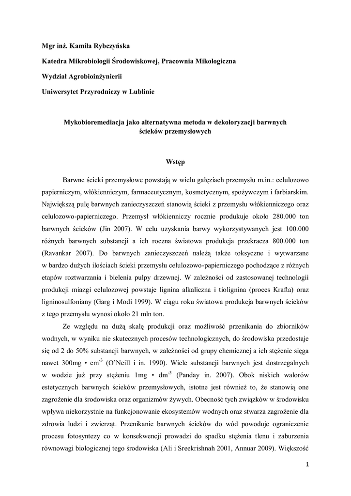 Mgr inż. Kamila Rybczyńska Katedra Mikrobiologii Środowiskowej