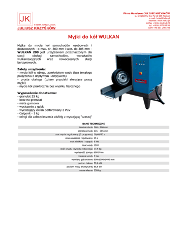 Firma Handlowa JULIUSZ KRZYŚKÓW ul. Świętochny 13, PL 61-055 Poznań e-mail: [email protected] internet: www.heka.pl tel/fax +48 61 653 63 29 tel. +48 61 876 83 56 GSM +48 601 290 198 Myjki do kół WULKAN Myjka do mycia kół samochodów osobowych i dostawczych - o max. śr. 800 mm i szer. do 305 mm WULKAN 200 jest urządzeniem przeznaczonym dla stacji obsługi samochodów, warsztatów wulkanizacyjnych oraz nowoczesnych stacji benzynowych. Zalety urządzenia: - mycie kół w obiegu zamkniętym wody (bez trwałego połączenia z dopływem i odpływem) - prosta obsługa (cztery przyciski sterujące pracą myjki) - mycie kół praktycznie bez wysiłku fizycznego Wyposażenie dodatkowe: - granulat 25 kg - kosz na granulat - mata gumowa - wyciszenie z gąbki - wyciszający ekran perforowany z PCV - Calgonit - 1 kg - oringi dla zabezpieczenia alufelg z wystającą "czaszą" DANE TECHNICZNE średnica koła 560 - 800 mm szerokość koła 135 - 305 mm czas mycia regulowany (3 programy) 20/40/60 s czas osuszania regulowany 15 s moc silników i napędu 6 kW ilość wody 150 l ilość wsadu czynnika roboczego 17,5 kg wydajność pompy 600 l/min ciśnienie wody 3 bar wymiary gabarytowe 900x1000x1400 mm poziom hałasu 79,6 dB poziom mocy akustycznej 88,6 dB masa własna 250 kg Myjka do mycia kół samochodów osobowych i dostawczych - o max. śr. 800 mm i szer. do 310 mm WULKAN 300 jest urządzeniem przeznaczonym dla stacji obsługi samochodów, warsztatów wulkanizacyjnych oraz nowoczesnych stacji benzynowych. Zalety urządzenia: - proces mycia w obiegu zamkniętym - mycie bez dodatków chemicznych - medium robocze: woda z granulatem - wykonanie z materiału nierdzewnego - podwójne akustyczne wyciszenie - komora mycia i osadnikowa - komora napędów i sterowania Wyposażenie dodatkowe: - granulat 25 kg - kosz na granulat - mata gumowa - wyciszenie z gąbki - wyciszający ekran perforowany z PCV - Calgonit - 2,5 kg - oringi dla zabezpieczenia alufelg z wystającą "czaszą" DANE TECHNICZNE średnica koła 560 - 800 mm szerokość koła 135 - 310 mm czas mycia regulowany (3 programy) 20/40/60 s czas osuszania regulowany 15 s moc silników i napędu 6 kW ilość wody 300 l ilość wsadu czynnika roboczego 20 kg wydajność pompy 600 l/min ciśnienie wody 3 bar wymiary 1000x1200x1460 mm poziom hałasu 78,7 dB poziom mocy akustycznej 87,1 dB masa własna 270 kg Myjka do mycia kół samochodów osobowych i dostawczych - o max. śr. 800 mm i szer. do 310 mm WULKAN 300H (z ogrzewaniem) jest urządzeniem przeznaczonym dla stacji obsługi samochodów, warsztatów wulkanizacyjnych oraz nowoczesnych stacji benzynowych. Zalety urządzenia: - dokładniejsze mycie nawet bardzo zabrudzonych kół dzięki systemowi ogrzewania wody - proces mycia w obiegu zamkniętym - mycie bez dodatków chemicznych - medium robocze: woda z granulatem - wykonanie z materiału nierdzewnego - podwójne akustyczne wyciszenie - komora mycia i osadnikowa - komora napędów i sterowania Parametry ogrzewania: - moc grzałki 4 kW - czas nagrzewania wody do temperatury 50°C - od 60 do 120 min Wyposażenie dodatkowe: - granulat 25 kg - kosz na granulat - mata gumowa - wyciszenie z gąbki - wyciszający ekran perforowany z PCV - Calgonit - 2,5 kg - oringi dla zabezpieczenia alufelg z wystającą "czaszą" DANE TECHNICZNE średnica koła 560 - 800 mm szerokość koła 135 - 310 mm czas mycia regulowany (3 programy) 20/40/60 s czas osuszania regulowany 15 s moc silników i napędu 6 kW ilość wody 300 l ilość wsadu czynnika roboczego 20 kg wydajność pompy 600 l/min ciśnienie wody 3 bar wymiary 1000x1200x1460 mm poziom hałasu 78,7 dB poziom mocy akustycznej 87,1 dB masa własna 270 kg Myjka do mycia kół samochodów ciężarowych - o max. śr. 1200 mm i szer. do 450 mm - WULKAN 500 z obrotowym podnośnikiem pneumatycznym jest urządzeniem przeznaczonym dla zajezdni, przedsiębiorstw transportowych, warsztatów usługowo-naprawczych oraz dużych zakładów wulkanizacyjnych. Zalety urządzenia: - proces mycia w obiegu zamkniętym - mycie bez dodatków chemicznych - medium robocze: woda z granulatem - wykonanie z materiału nierdzewnego - podwójne akustyczne wyciszenie - komora mycia i osadnikowa - komora napędów i sterowania Wyposażenie dodatkowe: - granulat 50 kg - kosz na granulat - mata gumowa - wyciszenie z gąbki - Calgonit - 15 kg DANE TECHNICZNE średnica koła do 1200 mm szerokość koła do 450 mm czas mycia regulowany (3 programy) 40/80/120 s czas osuszania regulowany 30 s moc silników i napędu 5,5 kW ilość wody 500 l ilość wsadu czynnika roboczego 30 kg wydajność pompy 600 l/min ciśnienie wody 3 bar wymiary 1600x1900x2160 mm poziom hałasu 77,1 dB poziom mocy akustycznej 89,9 dB masa własna 380 kg www.heka.pl