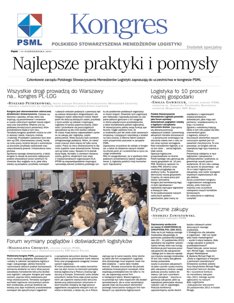 Kongres POLSKIEGO STOWARZYSZENIA MENEDŻERÓW LOGISTYKI Dodatek specjalny Piątek | 14 października 2011 Najlepsze praktyki i pomysły Członkowie zarządu Polskiego Stowarzyszenia Menedżerów Logistyki zapraszają do uczestnictwa w kongresie PSML Wszystkie drogi prowadzą do Warszawy na… kongres PL-LOG > Ryszard Petrykowski, P R E Z E S Z A R Z Ą D U P O LS K I E G O S TOWA R Z YS Z E N I A M E N E D Ż E R ÓW D O R A D CA I KO N S U LTA N T D S . P RO C E S ÓW P RO D U K T Y W N O Ś C I I E F E K T Y W N O Ś C I P RO C E S ÓW Logistyka to 10 procent naszej gospodarki > Emilia L O G I ST Y K I , D Y R E K TO R Kongres jest ukoronowaniem całorocznej działalności stowarzyszenia. Ciekawe wydarzenia i zjawiska, tematy, które nas inspirują, są prezentowane i omawiane w czasie cyklicznych spotkań naszej organizacji oraz warsztatów. Właśnie one są podstawą tematycznych prezentacji, które przedstawione będą w tym roku. Tematykę kongresu podzielić można na cztery obszary: ludzie, maszyny, metody i materiały. Przykładem zawartości tych dziedzin są CSR, zrównoważony rozwój, trendy na rynku pracy, kryteria decyzji o automatyzacji procesów, przykłady zastosowań oraz uwarunkowania prawne i infrastruktura transportowa. Spotkania naszego stowarzyszenia, a także kongres to okazja do poznania najlepszych praktyk stosowanych przez świetnych fachowców. Bez względu na to, jakie sfery wiedzy są pożądane, przykłady rozwiązań i udanych wdrożeń podanych z pierwszej ręki są zawsze doskonałym drogowskazem ułatwiającym wybór właściwych metod. Nawet jeżeli nie dotyczą bieżących zadań, przykłady z życia wzięte są ciekawe i inspirujące. Logistyka to bardzo pojemna branża. Zależności i przenikanie się poszczególnych specjalizacji są dla mnie bardzo ciekawe. W czasie mojej kariery odpowiadałem zarówno za zakupy, jak i logistykę, często jednocześnie. Wiele korzyści było wynikiem zintegrowanego podejścia. Wiem, że całość może znaczyć dużo więcej niż tylko sumę części. Praca na rzecz stowarzyszenia to dla mnie zupełnie nowe doświadczenie. Poświęcam jej wiele czasu. Sprawia mi to jednak dużą frajdę. Kontakty z członkami stowarzyszenia, gośćmi, ekspertami oraz więzi z międzynarodowymi organizacjami ELA, IFPSM są nieprawdopodobnie inspirujące i pozwalają odnosić problemy polskiego ryn- Gawryluk, C Z Ł O N E K Z A R Z Ą D U PSML, S P R Z E DA Ż Y T R A N S P O R T U K R A J OW E G O , M A R K E T I N G U DSV R OA D D Y R E K TO R D S . ku do problemów podobnych organizacji w innych krajach. Otwartość tych organizacji jest niebywała i naprawdę pozwala na czerpanie pełnymi garściami z ich osiągnięć w sferze pojedynczych przedsiębiorstw, a także kształtowania polityki regionalnej. W stowarzyszeniu pełnię swoją funkcję społecznie. Ciągle zadziwia mnie, że w środowisku jest tak wiele osób zarażonych inicjatywą i czerpiących satysfakcję z działań na rzecz branży. Z kilkoma takimi osobami mam przyjemność pracować w zarządzie PSML. Zapraszamy oczywiście do udziału w kongresie, a także do śledzenia naszych działań na stronie psml. pl i uczestnictwa w życiu naszego środowiska. Miło mi zasygnalizować, że w spotkaniu listopadowym przedstawiony będzie wyjątkowy temat, tj. logistyka polskich misji humanitarnych. Zapraszamy! Polskie Stowarzyszenie Menedżerów Logistyki powstało jako forum wymiany doświadczeń, poglądów i wiedzy o logistyce i zarządzaniu łańcuchem dostaw. Zajmujemy się aktywną promocją najlepszych praktyk i prezentacją aktualnych trendów biznesowych – a dynamicznie zmieniające się otoczenie stawia nam z roku na rok coraz wyższe wymagania. Rola menedżerów logistyki, a co za tym idzie – samej logistyki, stale rośnie. Operacje logistyczne przeprowadzane na terenie Polski każdego roku generują dla naszej gospodarki ok. 10 proc. PKB. Wystarczy spojrzeć na indeks PMI, któremu coraz uważniej przyglądają się analitycy rynku. To papierek lakmusowy naszej gospodarki. Czujemy, że nasza praca jest ważna i potrzebna. Kongres jest kwintesencją tego, co było najciekawsze i najbardziej zajmujące logistyków w bieżącym roku. To też podsumowanie naszych cyklicznych spotkań i spostrzeżeń, jakie mamy ze współpracy z organizacjami międzynarodowymi, doświadczeń, jakie mają nasi partnerzy i współpracownicy w kraju i na świecie. Zgodnie z wieloletnią tradycją także w tym roku pojawi się kilku znamienitych gości z zagranicy. Jednym z kluczowych elementów naszych corocznych spotkań jest ich zawartość merytoryczna. To ona powoduje, że kongres stał się największą tego typu imprezą w Polsce. Prezentacje oddajemy w ręce logistyków i zakupowców – profesjonalistów i praktyków, co gwarantuje wysoki poziom wydarzenia. W tym roku czekają nas łącznie 32 prezentacje – po 16 w części logistycznej i zakupowej, oraz sześć wystąpień wspólnych zaplanowanych dla obu bloków. Życzę uczestnikom kongresu i organizatorom wzbogacenia wiedzy, wielu twórczych inspiracji oraz oczywiście nawiązania nowych kontaktów biznesowych. Do zobaczenia w najbliższy czwartek! Etyczne zakupy MATERIAŁY PRASOWE > Andrzej Zawistowski, członek zarządu PSML Forum wymiany poglądów i doświadczeń logistyków > Magdalena Choquet, C Z Ł O N E K Z A R Z Ą D U PSML, D Y R E K TO R Z A R Z Ą D Z A J Ą C Y P R Z E D STAW I C I E LST WA SDI G RO U P P O L A N D Wybieramy kongres PSML, ponieważ jest to forum wymiany poglądów, doświadczeń i wiedzy w zakresie zarządzania logistycznego i zakupowego; ułatwia tworzenie i promowanie dobrych praktyk biznesowych; wzmacnia działanie na rzecz silnej pozycji zawodowej menedżerów łańcucha dostaw oraz logistyki i zakupów. Kongres jest wydarzeniem, poprzez które realizowana jest misja stowarzyszenia. Tematyka wystąpień wychodzi naprzeciw rzeczywistym potrzebom środowiska, promuje dzielenie się