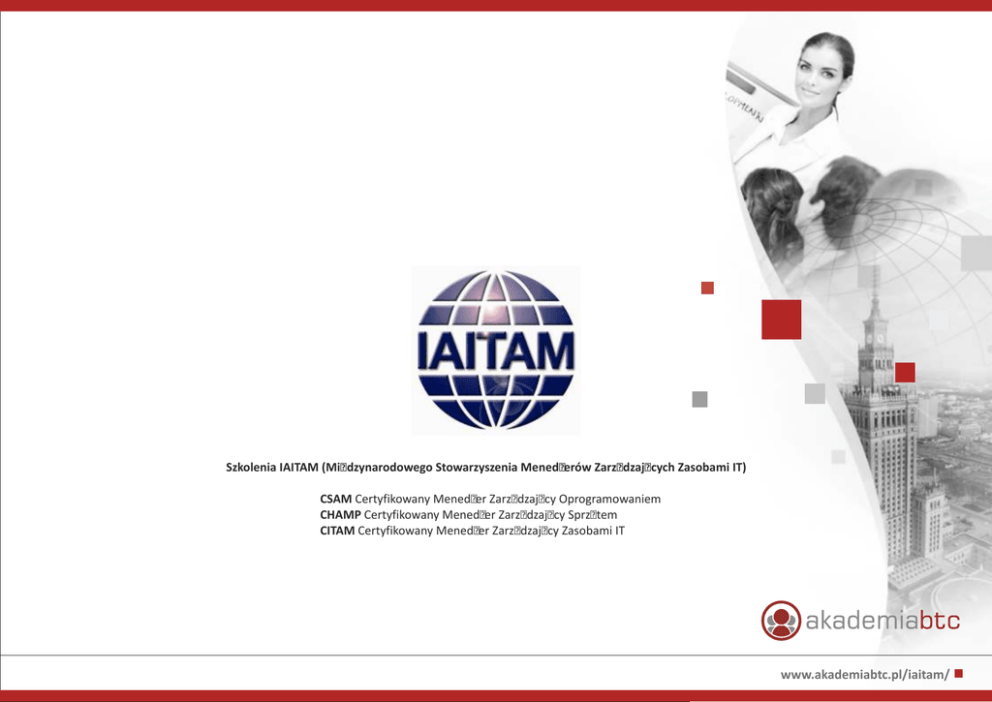 Szkolenia IAITAM (Międzynarodowego Stowarzyszenia Menedżerów Zarządzających Zasobami IT) CSAM Certyfikowany Menedżer Zarządzający Oprogramowaniem CHAMP Certyfikowany Menedżer Zarządzający Sprzętem CITAM Certyfikowany Menedżer Zarządzający Zasobami IT www.akademiabtc.pl/iaitam/ Akademia BTC Szanowni Państwo, o Akademii BTC: Z ogromną przyjemnością pragnę poinformować Państwa o wyjątkowym osiągnięciu Akademii BTC, która jako jedyna instytucja szkoleniowa w Polsce, otrzymała prawo do przeprowadzania kursów prestiżowej amerykańskiej organizacji IAITAM (Międzynarodowego Stowarzyszenia Menedżerów Zarządzających Zasobami IT). DOŚWIADCZENIE 3400 przeszkolonych osób z ponad 1100 firm i instytucji 15 specjalistycznych tematów szkoleń Ogólnopolski zasięg Możliwość prowadzenia tych szkoleń oraz przyznawania certyfikatów IAITAM Grupa kapitałowa BTC, do której należy Akademia, otrzymała w październiku 2011 roku na mocy aliansu strategicznego, podpisanego podczas otwarcia Dorocznej Konferencji IAITAM w Las Vegas. Kursy IAITAM otwierają przed polskimi menedżerami zarządzającymi zasobami IT nowe perspektywy, wyposażają ich w wiedzę na temat najlepszych praktyk oraz znajomość najnowszych rozwiązań. Dają narzędzia do efektywnego zarządzania infrastrukturą informatyczną, które wpisane w strategię biznesową firm lub instytucji, generują spore oszczędności finansowe, przyczyniają się do wzrostu efektywności pracy w całej organizacji oraz stwarzają nowe możliwości rozwoju osobistego. CERTYFIKACJA Prestiżowe certyfikaty amerykańskiego stowarzyszenia IAITAM Certyfikaty Akademii BTC Certyfikaty Partnerów JAKOŚĆ Trenerzy - praktycy z wieloletnim doświadczeniem Partnerzy merytoryczni: Adobe, Autodesk, Corel, Dell, Kaspersky, IAITAM, Intel, Longhill, Maruta, Microsoft, Oracle Wysokie oceny Uczestników Serdecznie zachęcam osoby odpowiedzialne za zarządzanie zasobami IT w firmach i instytucjach do podnoszenia kwalifikacji zawodowych, potwierdzonych certyfikatem największych światowych autorytetów. Z wyrazami szacunku, Sylwia Myszka Kierownik Działu Szkoleń www.akademiabtc.pl/iaitam/ Czym jest IAITAM? IAITAM (Międzynarodowe Stowarzyszenie Menadżerów Zarządzających Zasobami IT) – organizacja zrzeszająca specjalistów w obszarze zarządzania zasobami IT z blisko 40 krajów na całym świecie. IAITAM jest jednym z najważniejszych i najbardziej znaczących lobbystów na rynku IT. Dodatkowo w oparciu o dobre praktyki stowarzyszenia i jego członków powstają normy ISO oraz podstawowe standardy światowe dotyczące zarządzania infrastrukturą informatyczną. Ich tworzenie stoi u podstaw powstania IAITAM. Stowarzyszenie powołała do życia w 2002 roku grupa menadżerów odpowiedzialnych za oprogramowanie i sprzęt IT, którzy zauważyli potrzebę zbudowania scentralizowanej organizacji, zajmującej się rozwijaniem oraz obiektywizacją wiedzy w zakresie zarządzania zasobami IT. Prowadzone prace doprowadziły do określenia specyficznych potrzeb w nowo powstałym zawodzie menadżera zarządzającego infrastrukturą informatyczną, w tym opracowania programów szkoleniowych dla kadry zarządzającej oraz stworzenia obiektywnych norm i opinii dotyczących produktów na rynku IT, licencji na sprzęt i oprogramowanie. Edukacja IAITAM Szkolenia branżowe IAITAM Branżowe szkolenia oraz programy certyfikacji IAITAM zostały opracowane przez doświadczonych fachowców, w tym menedżerów zarządzających oprogramowaniem, sprzętem oraz pozostałymi zasobami informatycznymi na całym świecie. Przekazywana przez IAITAM wiedza z założenia jest praktyczna, obiektywna i profesjonalna, niezależna od opinii dostawców. IAITAM wspiera profesjonalistów, a samo Stowarzyszenie tworzą menedżerowie zarządzający zasobami IT oraz ich organizacje, pomagając sobie nawzajem w poszukiwaniu rozwiązań problemów, z którymi spotykają się w codziennej pracy. Kursy IAITAM - CSAM, CHAMP oraz CITAM opracowano w celu stworzenia ścieżki rozwoju zawodowego dla menedżerów zajmujących się zarządzaniem zasobami IT oraz stanowisk powiązanych. Szkolenia te zostały przyjęte na całym świecie jako wyznacznik doskonałości w procesie kształcenia zawodowego w sferze zarządzania zasobami IT. Uczestnik kursu otrzymuje gruntowne przygotowanie do realizacji zadań niezbędnych na stanowisku Menedżera Zasobów IT oraz prestiżowy certyfikat. Jednym z atutów IAITAM jest fakt, że Stowarzyszenie jest organizacją obecną na całym świecie. Każdy słuchacz posiada wiedzę, którą może podzielić się z innymi oraz pytania, które chciałby zadać. Podczas organizowanych szkoleń zachęcamy uczestników do rozmowy o bieżących sprawach, zadawania pytań oraz dzielenia się uwagami. Misja IAITAM polega na rozwijaniu wiedzy na temat zarządzania zasobami IT. Informacje od uczestników poprzednich kursów przekazywane do IAITAM dowodzą, że osoby zdobywające certyfikaty mają dużo większą łatwość w otrzymywaniu stanowisk i wynagrodzeń niedostępnych dla innych. Kursy IAITAM przekładają się w sposób mierzalny na zwrot z inwestycji dla firm uczestniczących, ponieważ zapewniają lepsze zrozumienie problematyki zarządzania zasobami IT oraz większą efektywność pracy. Posiadacze certyfikatów są przygotowani do realizacji celów stawianych przez daną organizację bez względu na to, czy jej zarząd koncentruje się na zarządzaniu finansami, ryzykiem czy na podnoszeniu efektywności. www.akademiabtc.pl/iaitam/ CSAM Certyfikowany Menedżer Zarządzający Oprogramowaniem (CSAM) Szkolenie to stanowi podsumowanie stale zmieniających się standardów dotyczących zarządzania oprogramowaniem i licencjami. Obejmuje również uświadamianie negatywnych skutków braku wiedzy oraz informacje na temat istniejących i proponowanych rozwiązań prawych regulujących zagadnienie legalności oprogramowania. Korzyści: § korzyści finansow