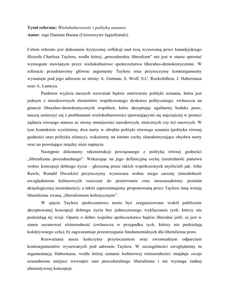 Tytuł referatu: Wielokulturowość i polityka uznania
