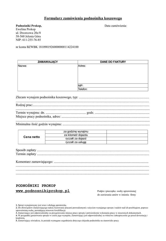 Formularz zamówienia podnośnika koszowego PODNOŚNIKI