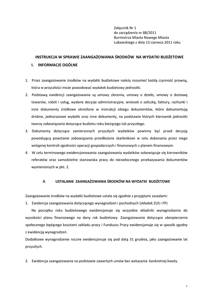 Załącznik Nr 1 do zarządzenia nr 88/2011 Burmistrza Miasta Nowego Miasta Lubawskiego z dnia 13 czerwca 2011 roku INSTRUKCJA W SPRAWIE ZAANGAŻOWANIA ŚRODKÓW NA WYDATKI BUDŻETOWE I. INFORMACJE OGÓLNE 1. Przez zaangażowanie środków na wydatki budżetowe należy rozumied każdą czynnośd prawną, która w przyszłości może powodowad wydatek budżetowy jednostki. 2. Podstawą ewidencji zaangażowania są umowy zlecenia, umowy o dzieło, umowy o dostawę towarów, robót i usług, wydane decyzje administracyjne, wniosek o zaliczkę, faktury, rachunki i inne dokumenty źródłowe określone w instrukcji obiegu dokumentów, które dokumentują drobne, jednorazowe wydatki oraz inne dokumenty, na podstawie których kierownik jednostki tworzy zobowiązania dotyczące budżetu roku bieżącego lub przyszłego. 3. Dokumenty dotyczące zamierzonych przyszłych wydatków powinny byd przed decyzją powodującą powstanie zobowiązania przedłożone skarbnikowi w celu dokonania przez niego wstępnej kontroli zgodności operacji gospodarczych i finansowych z planem finansowym. 4. W celu terminowego ewidencjonowania zaangażowania wydatków zobowiązuje się kierowników referatów oraz samodzielne stanowiska pracy do niezwłocznego przekazywania dokumentów wymienionych w pkt. 2. II. USTALANIE ZAANGAŻOWANIA ŚRODKÓW NA WYDATKI BUDŻETOWE Zaangażowanie środków na wydatki budżetowe ustala się zgodnie z przyjętymi zasadami: 1. Ewidencja zaangażowania dotyczącego wynagrodzeo i pochodnych (składek ZUS i FP) Na początku roku budżetowego ewidencjonuje się wszystkie składniki wynagrodzenia do wysokości planu finansowego na dany rok budżetowy. Zaangażowanie dotyczące ubezpieczenia społecznego będącego kosztami zakładu pracy i Funduszu Pracy ewidencjonuje się w sposób zgodny z ewidencją wynagrodzeo. Dodatkowe wynagrodzenie roczne ewidencjonuje się pod datą 31 grudnia, jako zaangażowanie lat przyszłych. 2. Ewidencja zaangażowania na podstawie zawartych umów bez wskazania konkretnej kwoty. 1 W szczególności są to zawierane umowy o dostawę energii cieplnej, elektrycznej, wody, o odprowadzanie ścieków, o świadczenie usług telekomunikacyjnych i inne. Ewidencję zaangażowania tego typu umów dokonuje się sukcesywnie na podstawie otrzymywanych faktur. 3. Ewidencja zaangażowania w pozostałych przypadkach. - drobne, jednorazowe wydatki dotyczące dostaw i usług nieobjęte wcześniej zawartymi umowami ewidencjonuje się na podstawie otrzymanych faktur, rachunków, - koszty podróży służbowych ewidencjonuje się na podstawie rozliczonej delegacji, umowy o ryczałt, - zaliczki stałe, jednorazowe ewidencjonuje się na podstawie zrealizowanego wniosku o zaliczkę, - odpis na Zakładowy Fundusz Świadczeo Socjalnych ewidencjonuje się na początku roku budżetowego na podstawie obliczeo zgodnymi z przepisami ustawy o Zakładowym Funduszu Świadczeo Socjalnych (zaangażowanie powinno byd równe wysokości kwoty planowanej w § 4440) - dostawę robót, towarów i usług objętych wcześniej zawartymi umowami ze wskazaniem kwoty ewidencjonuje się w dniu zawarcia umowy. W ciągu roku budżetowego dokonuje się korekt wartości zaangażowania wynikłych z aneksów do umowy, zmiany decyzji, przesunięcia terminu płatności i innych przyczyn. III. EWIDENCJA KSIĘGOWA ZAANGAŻOWANIA ŚRODKÓW NA WYDATKI BUDŻETOWE 1. Do ewidencji prawnego zaangażowania środków budżetowych służą konta pozabilansowe: 998 – „Zaangażowanie wydatków budżetowych roku bieżącego”, 999 – „Zaangażowanie wydatków budżetowych przyszłych lat”. Do kont 998 i 999 należy prowadzid ewidencję szczegółową według podziałek klasyfikacji budżetowej. 2. Konto 998 – „Zaangażowanie wydatków budżetowych roku bieżącego” Typowe zapisy strony Ma: - niezapłacone zobowiązania z roku poprzedniego, które wynikają z ksiąg rachunkowych i sprawozdao na dzieo 31 grudnia; - zaangażowanie z lat poprzednich dotyczące danego roku budżetowego przeksięgowane z konta 999; - zobowiązania wynikające z zawartych umów o dostawy, roboty i usługi, których termin płatności przypada na dany rok budżetowy; - zobowiązania wynikające z wydanych decyzji i innych postanowieo z terminem płatności w danym roku budżetowym; 2 - zobowiązania wobec pracowników wynikające z zawartych umów, płatne do 31 grudnia danego roku; - naliczone zobowiązania z tytułu pochodnych od wynagrodzeo wymagalne w danym roku budżetowym; - zwiększenie lub zmniejszenie (zapis minusowy) uprzednio zaksięgowanego zaangażowania wydatków danego roku budżetowego w wyniku aneksu do umowy lub zmiany decyzji, w tym także w wyniku przesunięcia terminu płatności na rok następny; - zaangażowanie w wysokości dokonanych wydatków na podstawie zawartych umów bez wskazania konkretnej kwoty; - zaangażowanie w wysokości dokonanych wydatków dotyczących dostaw i usług nieobjętych wcześniej zawartymi umowami, kosztów podróży służbowych, zaliczek stałych, jednorazowych; - zaangażowanie odpisu na ZFŚS; Typowe zapisy strony Wn: - równowartośd sfinansowanych wydatków budżetowych według sprawozdania Rb-28S na 31 grudnia danego roku. Ujęte na koncie 998 po stronie Ma zaangażowanie wydatków budżetowych wykazuje się w kwartalnych sprawozdaniach Rb-28S. Suma wykazywanego w nich zaangażowania nie może byd mniejsza od sumy wydatków wykonanych i występujących na koniec okresu zobowiązao. 3. Konto 999 – „Zaangażowanie wydatków budżetowych przyszłych lat” Typowe zapisy strony Ma: - zobowiązania wynikające z zawartych umów o dostawy, roboty i usługi, których termin płatności przypada w przyszłych latach; - zobowiązania wynikające z wydanych decyzji i innych postanowieo, których termin płatności przypada w przyszłych latach; - naliczone składki na ubezpieczenia społeczne, zdrowotne, podatki, Fundusz Pracy, dodatkowe wynagrodzenie roczne wymagalne w przyszłym roku; - 