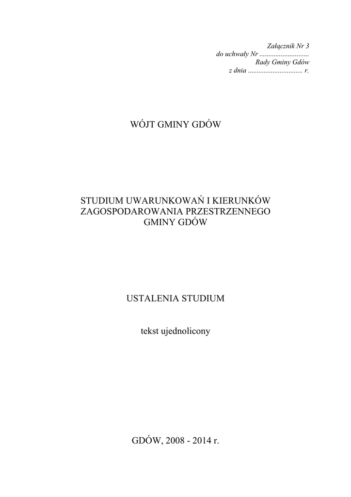 Załącznik Nr 3 do uchwały Nr ............................ Rady Gminy Gdów z dnia ............................... r. WÓJT GMINY GDÓW STUDIUM UWARUNKOWAŃ I KIERUNKÓW ZAGOSPODAROWANIA PRZESTRZENNEGO GMINY GDÓW USTALENIA STUDIUM tekst ujednolicony GDÓW, 2008 - 2014 r. Studium uwarunkowań i kierunków zagospodarowania przestrzennego Gminy Gdów Organ sporządzający studium: Wójt Gminy Gdów 32-420 Gdów Jednostka opracowująca projekt studium: Pracownia Projektowa Architektury i Urbanistyki – Jacek Banduła 30-081 Kraków, ul. Królewska 69/38 tel./fax 012 - 636-73-78, 0668-48-20-10 Zespół projektowy studium: mgr inż. arch. Jacek Banduła - mgr inż. arch. Dariusz Nawałka mgr inż. Jerzy Reiser inż. Andrzej Gorcziński mgr Marek Bzowski Mariusz Kamiński - główny projektant, kierownik zespołu członek Okręgowej Izby Urbanistów z siedzibą w Katowicach, wpis nr KT – 056/02; uprawnienia urbanistyczne nr RP-upr. 5/93 współpraca projektowa, zagadnienia przestrzenne komunikacja, ekofizjografia infrastruktura techniczna zagadnienia ochrony środowiska współpraca, opracowanie graficzne Zespół projektowy zmiany studium „OE.1”: mgr inż. arch. Jacek Banduła - mgr inż. arch. Paweł Migut mgr Andrzej Sułkowski - główny projektant, kierownik zespołu członek Okręgowej Izby Urbanistów z siedzibą w Katowicach, wpis nr KT – 056/02; uprawnienia urbanistyczne nr RP-upr. 5/93 współpraca projektowa, zagadnienia przestrzenne zagadnienia ochrony środowiska Zespół projektowy zmiany studium „ORWS.2”: mgr inż. arch. Jacek Banduła - mgr inż. arch. Paweł Migut mgr Andrzej Sułkowski Mariusz Kamiński - główny projektant, kierownik zespołu członek Okręgowej Izby Urbanistów z siedzibą w Katowicach, wpis nr KT – 056/02; uprawnienia urbanistyczne nr RP-upr. 5/93 współpraca projektowa, zagadnienia przestrzenne zagadnienia ochrony środowiska współpraca, opracowanie graficzne Opracowanie: Pracownia Projektowa Architektury i Urbanistyki - 2006 – 2008, 2012-2014 r. 1 Studium uwarunkowań i kierunków zagospodarowania przestrzennego Gminy Gdów SPIS TREŚCI I. WPROWADZENIE ................................................................................................................................ 4 1.1. 1.2. II. Podstawy prawne opracowania ......................................................................................................... 4 Charakter i zawartość opracowania................................................................................................... 4 UWARUNKOWANIA ROZWOJU GMINY ....................................................................................... 5 1. OGÓLNA CHARAKTERYSTYKA UWARUNKOWAŃ ZAGOSPODAROWANIA PRZESTRZENNEGO GMINY ............ 5 1.1. Podstawowe dane o gminie ............................................................................................................... 5 1.2. Zewnętrzne uwarunkowania rozwoju................................................................................................ 6 1.2.1. 1.2.2. 1.3. 1.3.1. 1.3.2. 2. Gmina na tle regionu..................................................................................................................................... 6 Dokumenty planistyczne o charakterze ponadlokalnym ................................................................................ 6 Dotychczasowe przeznaczenie, użytkowanie i zagospodarowanie terenów ..................................... 6 Stan użytkowania i zagospodarowania terenów............................................................................................ 6 Przeznaczenie terenów w dokumentach planistycznych gminy...................................................................... 7 ZASOBY I STAN ŚRODOWISKA .................................................................................................................... 8 2.1. Ukształtowanie terenu, warunki klimatyczne.................................................................................... 8 2.2. Środowisko biotyczne, świat roślinny i zwierzęcy............................................................................ 9 2.3. Walory przyrodnicze i krajobrazowe .............................................................................................. 10 2.4. Obiekty przyrodnicze prawnie chronione ....................................................................................... 12 2.4.1. 2.4.2. 2.5. 2.6. 2.6.1. 2.6.2. 2.6.3. 2.6.4. 2.6.5. 2.7. 2.8. 2.9. 2.9.1. 2.9.2. 2.9.3. Pomniki przyrody ........................................................................................................................................ 12 Inne tereny i obiekty cenne przyrodniczo .................................................................................................... 13 Rolnicza i leśna przestrzeń produkcyjna ......................................................................................... 13 Wielkość i jakość zasobów wodnych .............................................................................................. 14 Wody powierzchniowe................................................................................................................................. 14 Środowisko gruntowo-wodne ...................................................................................................................... 15 Wody mineralne .......................................................................................................................................... 15 Wody gruntowe............................................................................................................................................ 15 Wody geotermalne....................................................................................................................................... 16 Zasoby surowcowe, tereny górnicze ...........................................................................