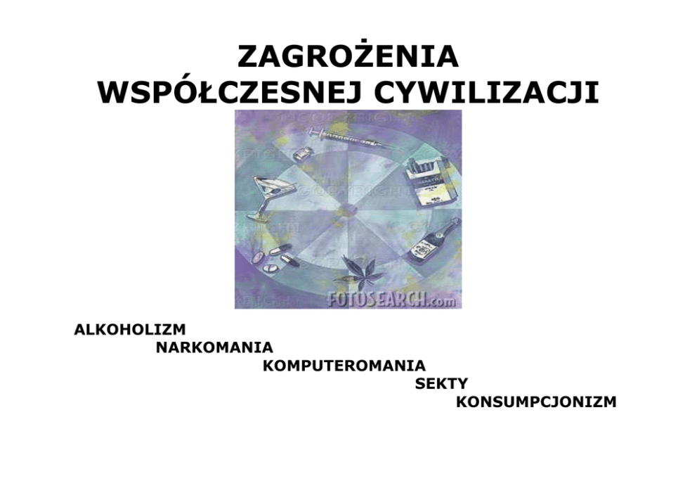 ZAGROśENIA WSPÓŁCZESNEJ CYWILIZACJI ALKOHOLIZM NARKOMANIA KOMPUTEROMANIA SEKTY KONSUMPCJONIZM śyjemy szybko i intensywnie. Presja otoczenia, otoczenia, ciągły brak czasu, nieustanny natłok informacji, obowiązki obowiązki zawodowe i domowe, domowe, kłopoty - oto nasza codzienność wypełniona stresem i frustracją. Niekiedy ich poziom staje się zbyt wysoki. wysoki. Co wtedy? Odrzucamy radykalne środki – zamach stanu, zmianę lub porzucenie pracy, pracy, rodziny. Nie pozostaje nic innego jak nauc nauczyć się dystansu i radzenia sobie z problemami. problemami. Wszak ten dzień moŜe być naszym dniem ostatnim, albo pierwszym dniem reszty naszego Ŝycia. MoŜna teŜ inaczej – zadręczyć siebie samego i innych nieustannym narzekaniem, roszczeniami, poszukiwaniem winnych i stosowaniem metod ucieczkowych. Niekiedy bywa i tak, Ŝe to któryś z członków naszej rodziny wybierze ucieczkę. A moŜliwości jest wiele. wiele. Oto tylko niektóre z nich: ALKOHOLIZM UzaleŜnienie od alkoholu to choroba, która rozwija się podstępnie, bez świadomości chorej osoby. Nałóg zmienia sposób funkcjonowania naszego organizmu, tak w sensie fizycznym, psychicznym, jak i społecznym. Systematyczne spoŜywanie alkoholu prowadzi do zmiany tolerancji – organizm przestaje bronić się przed toksyną (np. ustają torsje) i jednocześnie potrzebuje zwiększonej dawki alkoholu, by osiągnąć ten sam stan nietrzeźwości. Gdy osoba uzaleŜniona przerywa picie na jakiś czas lub zmniejsza ilość spoŜywanego alkoholu, pojawiają się objawy abstynenckie - niepokój i draŜliwość, dreszcze i drŜenie kończyn, skurcze mięśniowe, poty, nudności, a nawet zaburzenia świadomości i majaczenie. Alkoholik stara się szybko usunąć dokuczliwe cierpienia powracając do nałogu. Kolejny efekt "uboczny" to subiektywne poczucie łaknienia alkoholu. W miarę upływu czasu bez uŜywki, pojawiają się nieprzyjemne doznania podobne do głodu. W bardzo trudnych przypadkach zdarza się, Ŝe alkoholik ma zaburzenia pamięci i świadomości, tzw. „dziury pamięciowe". Wtedy coraz więcej spraw dzieje się poza wolą osoby uzaleŜnionej, a to stawia ją na pozycji Ŝyciowego bankruta - zrujnowane zdrowie, niska samoocena, bieda, samotność, bezdomność. Niekontrolowane picie moŜe doprowadzić takŜe do przedwczesnej śmierci. Wyniki wieloletnich obserwacji oraz tysięcy badań przeprowadzonych na całym świecie wskazują, Ŝe najlepiej w ogóle nie pić alkoholu. On naprawdę szkodzi zdrowiu! JeŜeli pijesz alkohol, to staraj się nie przekraczać dawki 2 standardowych drinków dziennie (standardowy drink to 10 g czystego, czyli 100% alkoholu) jeŜeli jesteś męŜczyzną i 1 standardowego drinka, o ile jesteś kobietą. NARKOMANIA Obecność narkotyków w Ŝyciu współczesnej młodzieŜy jest faktem, a ich dostępność powszechna. Do zagroŜenia narkomanią dochodzi najczęściej w okresie dojrzewania, w czasie konfrontacji wyobraŜeń o świecie, przyjaźni i miłości ze światem realnym, często odległym od naszych wizji. Przeciwdziałanie jej skutkom jest niezmiernie trudne. Jedną z najskuteczniejszych dróg jest zapobieganie, czyli profilaktyka. W okresie dojrzewania młody człowiek powinien mieć wypełniony dzień zajęciami, w tym sportowymi. MłodzieŜ wywodząca się z rodzin, gdzie rodzice poświęcają czas dziecku, organizują mu czas wolny, realizują rodzinne hobby, duŜo rozmawiają, wspólnie rozwiązują problemy – tam rzadziej sięga się po narkotyki. Środowisko najbardziej sprzyjające narkotykom to brak czasu i zainteresowania dzieckiem. Warto znać listę narkotyków, których uŜywa młodzieŜ: Środki wziewne: kleje, rozpuszczalniki uŜywane -wywołują stan odurzenia i euforii Środki pobudzające: kofeina, kokaina, amfetamina-pobudzają ośrodkowy układ nerwowy. Środki halucynogenne: marihuana, LSD- zaburzają czynności mózgu, potęgując dany nastrój Opioty: morfina, kodeina, heroina, „kompot”- zmiana osobowości, zaburzenia pamięci koncentracji, w skrajnych przypadkach śmierć Środki uspakajające : barbiturany, diazepan -działają depresyjnie na centralny układ nerwowy Narkotyki syntetyczne: zastępniki powszechnie uŜywanych narkotyków, głównie amfetaminy i z grupy opiatów – extaze. Co powinno zaniepokoić w zachowaniu dziecka? - gwałtowny spadek masy ciała, przewlekły katar, krwawienie z nosa, przekrwione oczy, nadmiernie zwęŜone lub rozszerzone źrenice nie reagujące na światło, słodka woń oddechu, włosów, ubrania; ślady po ukłuciach, ślady krwi na bieliźnie; nagłe zmiany nastroju i aktywności, spadek zainteresowania ulubionymi zajęciami, zaburzenia pamięci lub toku myślenia, izolowanie się od innych domowników; napady złości, agresji, buntu; bełkotliwa, niewyraźna mowa; pogorszenie się ocen, wagary, konflikty z nauczycielem; późne powroty, noce poza domem; kłamstwa, wynoszenie wartościowych przedmiotów z domu KOMPUTEROMANIA Sygnały komputeromanii u dzieci, młodzieŜy i dorosłych: - potrzeba częstszego i dłuŜszego kontaktu z komputerem, zatracanie poczucia czasu przed komputerem, fantazje i marzenia senne związane z komputerem, mimowolne poruszanie palcami, jak na klawiaturze, zaniedbywanie kontaktów z bliskimi, syndrom abstynencki: bóle i zawroty głowy, znudzenie, obojętność i apatia, trudności z koncentracją poza komputerem. Stwierdzona komputeromania, czyli uzaleŜnienie od komputera niesie zagroŜenia dla młodego człowieka. Oto tylko niektóre z nich: - zagroŜenia fizyczne: wady postawy, skrzywienia kręgosłupa, wady wzroku, uszkodzenia nerwów odpowiedzialnych za ruchy nadgarstka, zagroŜenia psychiczne: nerwice, lęki, zmiany w układzie nerwowym tzw. padaczka ekranowa, zatracenia poczucia realizmu – „wielokrotna śmierć bohaterów i moŜliwości cudownych uzdrowień”, zagroŜenia moralne: niekontrolowany kontakt z negatywnymi wartościami, postawami, informacjami i zachow