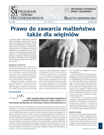 BIULETYN INFORMACYJNY Nr 1 (32) styczeń 2010 ISSN 1689-8737 Prawo do zawarcia małżeństwa także dla więźniów 5 stycznia 2009 r. Europejski Trybunał Praw Człowieka wydał wyroki w sprawach Jaremowicz przeciwko Polsce (skarga nr 24023/03) oraz Frasik przeciwko Polsce (skarga nr 22933/02). Trybunał uznał, że odmowa zawarcia małżeństwa w zakładzie karnym stanowiła w niniejszych sprawach naruszenie art. 12 Europejskiej Konwencji Praw Człowieka. W obu sprawach Helsińska Fundacja Praw Człowieka złożyła opinię przyjaciela sądu (amicus curiae). Nielegalna znajomość Paweł Jaremowicz w 2001 r. został skazany na karę pozbawienia wolności za usiłowanie włamania. Podczas jej odbywania w Zakładzie Karnym we Wrocławiu, w czerwcu 2003 r., wystąpił o zgodę na przepustkę, w celu wizyty u osoby osadzonej w innym zakładzie karnym we Wrocławiu. Odmówiono mu takiej zgody. Następnie wystąpił o wyrażenie zgody na przepustkę w celu zawarcia małżeństwa z M.H. w więzieniu. Pani M.H także wystąpiła do sądu o podobną zgodę. Wnioski zostały przez administrację zakładu karnego rozpatrzone negatywnie. Wskazano, że M.H. nie jest dla P. Jaremowicza osobą bliską w rozumieniu art. 102 § 2 kodeksu karnego wykonawczego. W sprawie interweniował także Rzecznik Praw Obywatelskich. W odpowiedzi do Rzecznika administracja zakładu karnego wskazała, że P. Jaremowicz nie potrafił udowodnić, że był w związku z M.H. jeszcze przed jej osadzeniem w zakładzie. Ponadto wskazano, że ich znajo- AKTUALNOŚCI GMS KANCELARIA RADCÓW PRAWNYCH GABRIELA MORAWSKA-STANECKA, MAREK STAŃKO SP. P. PARTNEREM WSPIERAJĄCYM PROGRAMU SPRAW PRECEDENSOWYCH Kancelaria GMS Kancelaria Radców Prawnych Gabriela Morawska-Stanecka, Marek Stańko Sp. P. z Katowic, została kolejnym Partnerem Wspierającym Programu Spraw Precedensowych. Kancelaria GMS jest kancelarią prawniczą kierowaną przez dwóch wysoce wykwalifikowanych prawników. Świadczy usługi doradztwa prawnego w obszarach takich jak: prawo cywilne i rodzinne, prawo gospodarcze i handlowe, prawo upadłościowe i naprawcze, prawo zamówień publicznych i prawo pracy. Kancelaria GMS specjalizuje się szczególnie w dziedzinach, do których należą: prawo rolne i żywnościowe, prawo spółdzielcze, prawo górnicze i geologiczne, prawo energetyczne, prawo medyczne oraz prawo sportowe. Do grona klientów kancelarii GMS należą podmioty sektora publicznego i prywatnego, nie tylko o kapitale polskim, lecz również zagranicznym. Kancelaria GMS świadczy usługi doradztwa prawnego zarówno w języku angielskim, hiszpańskim, włoskim jak i rosyjskim. Więcej informacji dostępnych jest na stronie: www.gms-radca.pl mość rozwijała się „nielegalnie”, bo za pomocą grypsów. We wrześniu 2003 r. P. Jaremowicz poskarżył się do Ministerstwa Sprawiedliwości. Skarga została przekazana Dyrektorowi Służby Więziennej we Wrocławiu. Uznał on, że decyzja administracji zakładu karnego nie narusza prawa. W październiku 2003 r. sprawa trafiła do Wydziału Penitencjarnego Sądu Okręgowego we Wrocławiu, ale nie podjął on żadnej decyzji. Z informacji przedstawionych przez rząd RP w postępowaniu przed ETPCz P. Jaremowicz nie zawarł w więzieniu związku małżeńskiego z M.H. W lipcu 2003 r. P. Jaremowicz złożył skargę do Europejskiego Trybunału Praw Człowieka w Strasburgu zarzucając naruszenie przez Polskę art. 12 (prawo do zawarcia małżeństwa), art. 13 (prawo do skutecznego środka odwoławczego) oraz art. 14 (zakaz dyskryminacji) Konwencji. Opinia Fundacji W sprawie, opinię przyjaciela sądu (amicus curiae), w ramach Programu Spraw Precedensowych złożyła Helsińska Fundacja Praw Człowieka (zob. pkt 43-47 i 62 uzasadnienia wyroku). Opinia przyjaciela sądu została przygotowana w ramach Programu Spraw Precedensowych przez ciąg dalszy na stronie 2 1 Kanstantsina Dzehtsiarou, Grzegorza Godlewskiego oraz Helenę Gogadze. Podniesiono w niej, że prawo do zawarcia związku małżeńskiego jest jednym z podstawowych praw gwarantowanych przez szereg umów międzynarodowych dotyczących praw człowieka, a także przez Europejską Konwencję Praw Człowieka, co zostało potwierdzone w orzecznictwie Europejskiego Trybunału Praw Człowieka (przykładowo: F. przeciwko Szwajcarii, skarga nr 11329/85, wyrok z dnia 18 grudnia 1987 r.). Prawo do życia rodzinnego zostało wymienione także w stworzonym przez Trybunał katalogu praw, których przebywający w zakładzie karnym nie może być pozbawiony (Hirst przeciwko Wielkiej Brytanii, skarga nr 24025/01, wyrok z dnia 6 października 2005 r., § 69, Ploski przeciwko Polsce, skarga nr 26761/95). W sprawie Hirst przeciwko Wielkiej Brytanii Trybunał stwierdził, że „wszelkie ograniczenia praw muszą zostać uzasadnione, choć takie uzasadnienie może dotyczyć kwestii bezpieczeństwa, w szczególności w zakresie przeciwdziałania przestępstwom i zaburzeniom porządku, które w sposób nieunikniony wynikają z osadzenia w więzieniu”(§ 69). Naruszenie art. 12 Konwencji Trybunał uznał, że ocena dopuszczalnych ograniczeń prawa do zawarcia małżeństwa na gruncie art. 12 Konwencji, nie może zostać oparta na badaniu niezbędności takiego ograniczenia, tak jak ma to miejsce w przypadku np. ograniczeń prawa do prywatności (art. 8 ust. 2 Konwencji). Taka ocena będzie polegała na sprawdzeniu, czy ograniczenie prawa do zawarcia małżeństwa nie było arbitralne lub nieproporcjonalne w stosunku do chronionych wartości. Z całą pewnością, wolność osobista nie stanowi czynnika warunkującego możliwość zawarcia małżeństwa. stwa był brak w niniejszej sprawie skutecznego środka odwoławczego od decyzji administracji więziennej. Pomimo, że sprawa trafiła do sądu penitencjarnego, nie została merytorycznie rozpoznana, ponieważ w międzyczasie władze zmieniły swoją decyzję. Trybunał podkreślił, że miało to miejsce 5 miesięcy po złożeniu wn