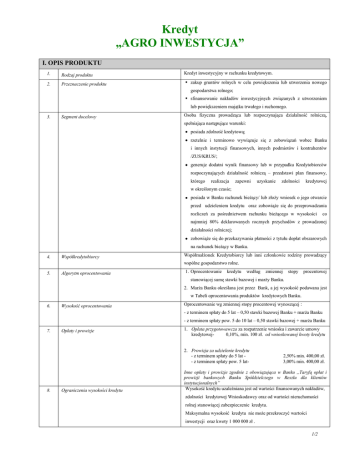 Kredyt „AGRO INWESTYCJA” I. OPIS PRODUKTU 1. Rodzaj produktu Kredyt inwestycyjny w rachunku kredytowym. 2. Przeznaczenie produktu zakup gruntów rolnych w celu powiększenia lub utworzenia nowego gospodarstwa rolnego; sfinansowanie nakładów inwestycyjnych związanych z utworzeniem lub powiększeniem majątku trwałego i ruchomego. 3. Segment docelowy Osoba fizyczna prowadząca lub rozpoczynająca działalność rolniczą, spełniająca następujące warunki: posiada zdolność kredytową; rzetelnie i terminowo wywiązuje się z zobowiązań wobec Banku i innych instytucji finansowych, innych podmiotów i kontrahentów /ZUS/KRUS/; generuje dodatni wynik finansowy lub w przypadku Kredytobiorców rozpoczynających działalność rolniczą – przedstawi plan finansowy, którego realizacja zapewni uzyskanie zdolności kredytowej w określonym czasie; posiada w Banku rachunek bieżący/ lub złoży wniosek o jego otwarcie przed udzieleniem kredytu oraz zobowiąże się do przeprowadzania rozliczeń za pośrednictwem rachunku bieżącego w wysokości co najmniej 80% deklarowanych rocznych przychodów z prowadzonej działalności rolniczej; zobowiąże się do przekazywania płatności z tytułu dopłat obszarowych na rachunek bieżący w Banku. 4. Współkredytobiorcy Współmałżonek Kredytobiorcy lub inni członkowie rodziny prowadzący wspólne gospodarstwo rolne. 5. Algorytm oprocentowania 1. Oprocentowanie kredytu według zmiennej stopy procentowej stanowiącej sumę stawki bazowej i marży Banku. 2. Marża Banku określana jest przez Bank, a jej wysokość podawana jest w Tabeli oprocentowania produktów kredytowych Banku. 6. Wysokość oprocentowania Oprocentowanie wg zmiennej stopy procentowej wynoszącej : - z terminem spłaty do 5 lat – 0,50 stawki bazowej Banku + marża Banku - z terminem spłaty pow. 5 do 10 lat – 0,50 stawki bazowej + marża Banku 7. Opłaty i prowizje 1. Opłata przygotowawcza za rozpatrzenie wniosku i zawarcie umowy kredytowej0,10%, min. 100 zł. od wnioskowanej kwoty kredytu 2. Prowizja za udzielenie kredytu - z terminem spłaty do 5 lat - z terminem spłaty pow. 5 lat- 8. Ograniczenia wysokości kredytu 2,50% min. 400,00 zł. 3,00% min. 400,00 zł. Inne opłaty i prowizje zgodnie z obowiązująca w Banku „Taryfą opłat i prowizji bankowych Banku Spółdzielczego w Reszlu dla klientów instytucjonalnych” Wysokość kredytu uzależniana jest od wartości finansowanych nakładów, zdolności kredytowej Wnioskodawcy oraz od wartości nieruchomości rolnej stanowiącej zabezpieczenie kredytu. Maksymalna wysokość kredytu nie może przekroczyć wartości inwestycji oraz kwoty 1 000 000 zł . 1/2 Minimalna kwota kredytu: 20 000 zł. 9. Okres kredytowania Okres kredytowania uzależniony jest od rodzaju finansowanych nakładów. Maksymalny okres kredytowania wynosi 10 lat. 10. Karencja Możliwość uzyskania karencji do 24 m-cy w przypadku kredytów udzielanych dla osób rozpoczynających działalność gospodarczą. 11. Sposób uruchomienia kredytu Kredyt uruchamiany jest po przedłożeniu przez Kredytobiorcę potwierdzenia złożenia wniosku o wpis hipoteki w Sądzie Rejonowym właściwym dla miejsca położenia nieruchomości, stanowiącej przedmiot zabezpieczenia oraz potwierdzenia przyjęcia przez ARiMR dyspozycji przekazania płatności z tytułu dopłat obszarowych na rachunek bieżący prowadzony w Banku. 12. Wymagany udział środków własnych 1. Udział środków własnych Kredytobiorcy przedsięwzięciu wynosi minimum 10% w kredytowanym wartości przedsięwzięcia i musi być udokumentowany. Bank dopuszcza możliwość realizacji inwestycji bez udziału środków własnych. Obniżenie udziału środków własnych Kredytobiorcy w kredytowanym przedsięwzięciu skutkuje podwyższeniem marży Banku o 0,50 p.p. 2. W przypadku, gdy Klient jest podatnikiem podatku od towarów i usług VAT i przysługuje mu prawo do zwrotu VAT, kredytem finansowana jest wartość netto przedsięwzięcia inwestycyjnego (tzn. z wyłączeniem kwoty podatku VAT), z zastrzeżeniem ust. 3. 3. W przypadku, gdy przedsięwzięcie dotyczy nabycia środka trwałego, od którego, zgodnie z ustawą o podatku od towarów i usług oraz o podatku akcyzowym, nie przysługuje zwrot podatku VAT, kredytem może być finansowana jego wartość brutto (pomimo, że Klient jest płatnikiem podatku VAT). 4. Klient zobowiązany jest zaangażować środki własne na etapie rozpoczęcia realizacji danego przedsięwzięcia i udokumentować ich zaangażowanie przed uruchomieniem przez Bank kredytu inwestycyjnego. 13. Forma wypłaty Wypłata kredytu następuje jednorazowo lub w transzach w terminach i kwotach określonych w Umowie kredytu. 14. Wykorzystanie kredytu Wykorzystanie kredytu następuje w formie bezgotówkowej poprzez realizację dyspozycji klienta w ciężar rachunku kredytowego. Wypłata środków z kredytu wymaga udokumentowania przez Klienta celowości ich przeznaczenia. 15. Atrakcyjność produktu Kredyt „AGRO INWESTYCJA”: 1. Pozwala swobodnie realizować swoje plany inwestycyjne i pomnażać posiadany majątek. 2. Długi okres kredytowania – do 10 lat. 3. Możliwość karencji do 24 m-cy dla osób rozpoczynających działalność rolniczą. 4. Spłata kredytu dostosowana do rodzaju prowadzonej działalności rolniczej. 2/2