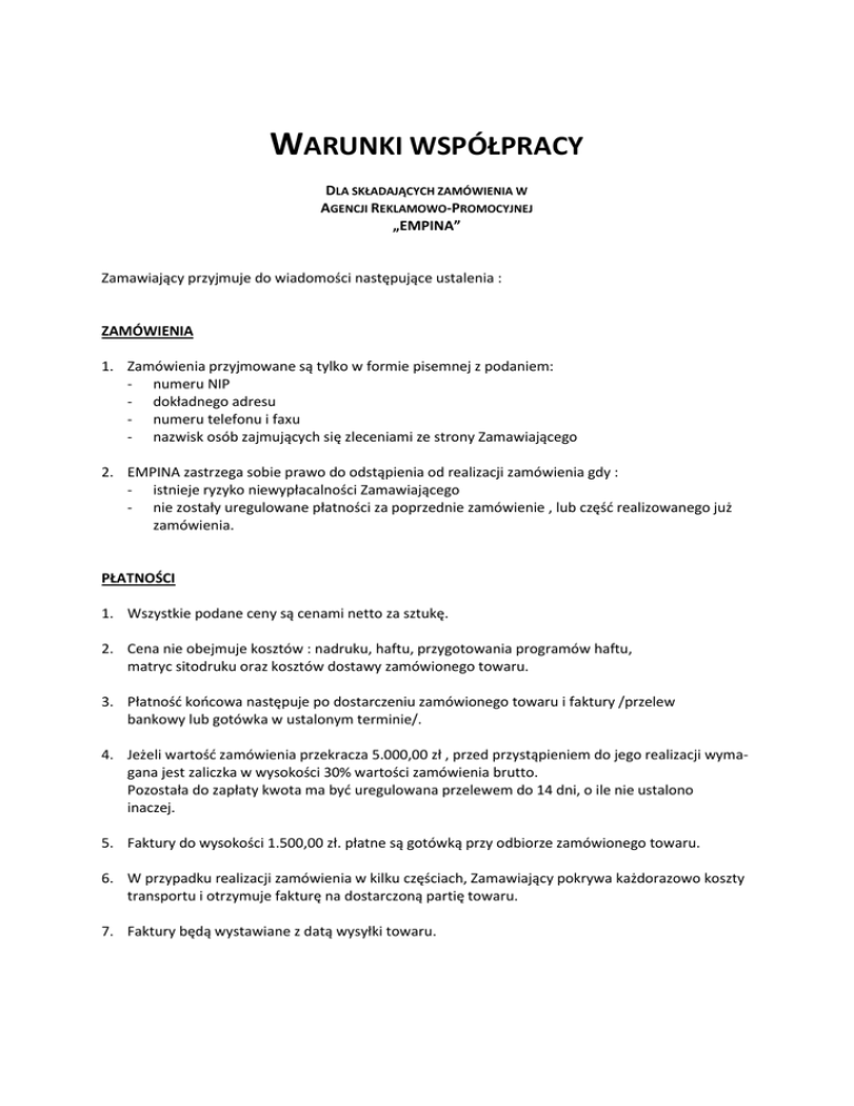 WARUNKI WSPÓŁPRACY DLA SKŁADAJĄCYCH ZAMÓWIENIA W AGENCJI REKLAMOWO-PROMOCYJNEJ „EMPINA” Zamawiający przyjmuje do wiadomości następujące ustalenia : ZAMÓWIENIA 1. Zamówienia przyjmowane są tylko w formie pisemnej z podaniem: - numeru NIP - dokładnego adresu - numeru telefonu i faxu - nazwisk osób zajmujących się zleceniami ze strony Zamawiającego 2. EMPINA zastrzega sobie prawo do odstąpienia od realizacji zamówienia gdy : - istnieje ryzyko niewypłacalności Zamawiającego - nie zostały uregulowane płatności za poprzednie zamówienie , lub częśd realizowanego już zamówienia. PŁATNOŚCI 1. Wszystkie podane ceny są cenami netto za sztukę. 2. Cena nie obejmuje kosztów : nadruku, haftu, przygotowania programów haftu, matryc sitodruku oraz kosztów dostawy zamówionego towaru. 3. Płatnośd koocowa następuje po dostarczeniu zamówionego towaru i faktury /przelew bankowy lub gotówka w ustalonym terminie/. 4. Jeżeli wartośd zamówienia przekracza 5.000,00 zł , przed przystąpieniem do jego realizacji wymagana jest zaliczka w wysokości 30% wartości zamówienia brutto. Pozostała do zapłaty kwota ma byd uregulowana przelewem do 14 dni, o ile nie ustalono inaczej. 5. Faktury do wysokości 1.500,00 zł. płatne są gotówką przy odbiorze zamówionego towaru. 6. W przypadku realizacji zamówienia w kilku częściach, Zamawiający pokrywa każdorazowo koszty transportu i otrzymuje fakturę na dostarczoną partię towaru. 7. Faktury będą wystawiane z datą wysyłki towaru. NADRUK I HAFT 1. Pliki z logo prosimy przesład w formie wektorowej w programie Corel Draw nie wyżej niż wersja 13. Jeśli nie posiadają Paostwo loga w tej formie, możliwe jest jego opracowanie za dodatkowa opłatą. 2. Przy określaniu kolorystyki projektu (nadruku) należy posługiwad się systemem kolorów Pantone lub CMYK. Ze względu na rodzaj materiału istnieje możliwośd niewielkich rozbieżności kolorów w nadruku. 3. Program haftu, klisze i matryce sitodruku wykonane przez EMPINE na zlecenie Zamawiającego, pozostają własnością Zamawiającego. 4. Logo firmy, treśd nadruku lub haftu i ewentualny układ graficzny, prosimy przesyład pocztą elektroniczną wraz z dokładnym opisem . 5. Przed przystąpieniem do druku lub haftu wymagamy ostatecznej akceptacji ze strony Zamawiającego: układu graficznego, logo, oraz treści. TRANSPORT 1. Zamówiony towar jest dostarczany na koszt Zamawiającego, o ile nie ustalono inaczej: - transportem firmy EMPINA, - za pośrednictwem firm spedycyjnych - za pośrednictwem firm kurierskich 2. O zachowaniu terminu dostawy decyduje data wydania przesyłki firmie spedycyjnej lub kurierskiej. 3. W przypadku, gdy odbiór zamówionego towaru następuje transportem własnym Zamawiającego, o zachowaniu terminu decyduje data wysłania zawiadomienia o gotowości towaru do odbioru. REKLAMACJE 1. Reklamacji podlega jedynie towar zakwalifikowany jako : - uszkodzony - niezgodny z zamówieniem 2. Zamawiający ponosi koszty transportu związane ze zwrotem reklamowanego towaru. 3. Wszelkie reklamacje muszą byd składane w terminie 7 dni od daty otrzymania zamówionego towaru. 4. Po odstąpieniu lub odsprzedaniu towaru kolejnemu odbiorcy, odpowiedzialnośd za jakiekolwiek wady jakościowe i braki ilościowe przenosi się na Zamawiającego. 5. Takie same warunki dotyczą towaru poddanego dalszym obróbką /np.: nadruk, haft/ w przypadku, gdy został zamówiony w EMPINIE towar bez nadruku , haftu. 6. Sprawdzenie towaru przed przekazaniem go komukolwiek należy do Zamawiającego. 7. Zwroty towaru przerobionego w jakikolwiek sposób nie będą akceptowane. WARUNKI KOOCOWE 1. Zamawiający oświadcza, że dysponuje prawami autorskimi lub/ oraz prawami z rejestracji znaku towarowego ( świadectwa ochronnego na znak zdobniczy), w zakresie niezbędnym do wykonania zamówienia. 2. W przypadku wystąpienia przez jakikolwiek podmiot z roszczeniami do firmy EMPINA z tytułu naruszenia praw autorskich lub/ oraz prawa z rejestracji znaku towarowego (świadectwa ochronnego na znak zdobniczy ) w związku z realizacją zamówienia, Zamawiający będzie odpowiedzialny względem firmy EMPINA za to, iż podmiot którego prawa naruszono nie będzie żądał od EMPINY spełnienia jakichkolwiek świadczeo związanych z naruszeniem praw. W sprawach nie uregulowanych powyższymi ustaleniami mają zastosowanie przepisy Kodeksu Cywilnego. Emilia Niepomniaszczij Agencja Reklamowo- Promocyjna „EMPINA” ul. Mostowa 2 46-300 Olesno