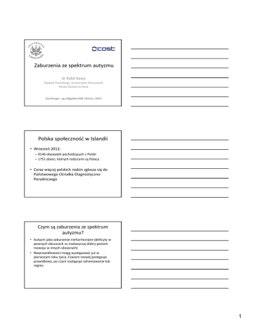 Zaburzenia ze spektrum autyzmu dr Rafał Kawa Wydział Psychologii, Uniwersytet Warszawski Polska Akademia Nauk Greiningar‐ og ráðgjafarstöð ríkisins, 2012 Polska społeczność w Islandii • Wrzesień 2012: – 9146 obywateli pochodzących z Polski – 1751 dzieci, których rodzicami są Polacy • Coraz więcej polskich rodzin zgłasza się do Państwowego Ośrodka Diagnostyczno‐ Poradniczego Czym są zaburzenia ze spektrum autyzmu? • Autyzm jako zaburzenie nieharmonijne (deficyty w pewnych obszarach vs nadzwyczaj dobry poziom rozwoju w innych obszarach) • Nieprawidłowości mogą występować już w pierwszym roku życia. Czasem rozwój postępuje prawidłowo, po czym następuje zahamowanie lub regres. 1 Objawy charakterystyczne dla autyzmu • Zaburzenia w komunikowaniu się • Zaburzenia interakcji społecznych • Ograniczone, powtarzające się, stereotypowe, modele zachowań i zainteresowań d l h ńi i ń • Zaburzenie to cechują symptomy występujące w trzech sferach: Interakcje społeczne Komunikowanie się AUTYZM Wzorce zachowań Objawy charakterystyczne dla autyzmu c.d. • Zaburzenia w komunikowaniu się – zaburzone rozumienie oraz ekspresja językowa używana w społecznym porozumiewaniu się 2 Objawy charakterystyczne dla autyzmu c.d. • Zaburzenia interakcji społecznych – zaburzony rozwój przywiązania społecznego lub wzajemnych kontaktów społecznych Objawy charakterystyczne dla autyzmu c.d. • Ograniczone, powtarzające się, stereotypowe, modele zachowań i zainteresowań – zaburzona zabawa Zaburzenia w komunikowaniu się • Opóźnienie lub brak rozwoju mówionego języka. • Nieużywanie gestów lub mimiki jako sposobu porozumiewania się porozumiewania się • Brak inicjatywy w podejmowaniu wymiany konwersacyjnej • Stereotypowe i powtarzające się wykorzystanie słów ‐ echolalie 3 Zaburzenia w komunikowaniu się • Brak potakiwania lub uśmiechania się aby podtrzymać komunikację • Odwracanie zaimków • Nieodpowiadanie na sygnały kierowanie do dziecka Nieodpowiadanie na sygnały kierowanie do dziecka • Rolę komunikacji pełnić może krzyk, płacz, samouszkadzanie lub zachowanie agresywne • Dysproporcja w rozumieniu i naśladowaniu słów Zaburzenia w komunikowaniu się: • • • • • • Powtarzanie tekstów z telewizji. Odpowiadanie na postawione pytanie tym samym pytaniem, np. A: Chcesz pić? B: Chcesz pić? Odwracanie się lub niereagowanie w sytuacji, gdy rodzic podchodzi i pyta się: „Chcesz jeść?” Mówienie monotonnym, niezmiennym tonem lub wypowiadanie konkretnego zdania z identyczną intonacją. d k k d d Używanie ręki rodzica jako „narzędzia” np. dziecko, które chce posłuchać muzyki, prowadzi rodzica i dotyka radia ręką rodzica. Mówienie o sobie: „Marek chce jeść.”, „On chce jeść.” Zaburzenia interakcji społecznych • Nienawiązywanie kontaktu wzrokowego • Nieadekwatne do sytuacji: wyraz twarzy, postawa ciała i użycie gestów • Nieadekwatny rozwój związków rówieśniczych obejmujących podzielanie zainteresowań, czynności, b j j h di l i i ń ś i emocji • Nieadekwatne reagowanie na emocje innych osób • Brak spontanicznej potrzeby dzielenia z innymi radości, zainteresowań lub osiągnięć 4 Zaburzenia interakcji społecznych • Zaburzona zdolność do monitorowania uwagi innej osoby • Zaburzone naśladowanie innych osób • Brak zainteresowania innymi ludźmi k i i i i l dź i • Brak podejmowania wspólnej aktywności z rówieśnikami. Zaburzenia interakcji społecznych: • • • • • • • Niereagowanie na wołanie dziecka. Uciekanie wzrokiem, gdy rodzic staje naprzeciwko dziecka i mówi do niego. Reagowanie płaczem/smutną miną na ulubioną osobę/przedmiot. Napady śmiechu niezwiązane z sytuacją. Reagowanie śmiechem na płacz matki Brak zainteresowania czynnościami wykonywanymi przez rodziców lub rówieśników np. naprawianie, malowanie, gotowanie itd. Nieuspakajanie się, gdy dziecko jest brane przez matkę na ręce. Zaburzenia interakcji społecznych: • • • • • • • • Nieuśmiechanie się do ludzi. Nie wyciąganie rąk przez dziecko w oczekiwaniu na to, że ktoś je przytuli. Odsuwanie się od przytulającej dziecko osoby Przytulanie się do obcych ludzi – traktowanie Przytulanie się do obcych ludzi traktowanie obcych jak znane osoby. Ignorowanie obecności ludzi. Nie rozumienie zasad zabawy lub gry, bawienie się obok. Szukanie kontaktu z osobami starszymi. Brak naśladowania zachowań innych osób. 5 Zachowania stereotypowe • Przywiązanie do niefunkcjonalnych czynności rutynowych • Powtarzające się manieryzmy ruchowe • Koncentracja na cząstkowych właściwościach j k h ł ś i ś i h przedmiotów • Brak zabawy, w której dziecko bawi się „na niby” lub naśladuje role Zachowania stereotypowe: • Wahadłowe kiwanie się, kołysanie się, podskakiwanie w miejscu, doznawanie wstrząsów, wirowanie w miejscu przysłuchiwanie się urządzeniom mechanicznym, zainteresowanie źródłami światła, przyglądanie się przedmiotom, fascynacja krawędziami, zachowania autoagresywne – dostarczanie sobie bólu (gryzienie się, drapanie, duszenie się, nakłuwanie ciała, szczypanie, uderzanie częściami ciała w przedmioty, uderzanie rękoma lub przedmiotami w różne części ciała) Zainteresowania dotyczące wąskiej grupy przedmiotów, aktywności • • • Zaburzenia w innych obszarach • Zaburzenia w funkcjonowaniu poznawczym – – – – • Zaburzenia uwagi oraz pamięci (brak zdolności do szybkiego przenoszenia uwagi, tworzenie wspólnego pola uwagi) deficyty te nie ograniczają się do sytuacji społecznych. społecznych Zaburzenia funkcji wykonawczych Zaburzenia centralnej koherencji Zaburzenia w zakresie tworzenia teorii umysłu Zaburzenia sensoryczne – Nadwrażliwość lub niedowrażliwość na niektóre bodźce 6 Zaburzenia w innych obszarach • Zaburzenia emocjonalne 