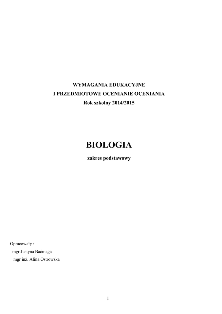 WYMAGANIA EDUKACYJNE I PRZEDMIOTOWE OCENIANIE OCENIANIA Rok szkolny 2014/2015 BIOLOGIA zakres podstawowy Opracowały : mgr Justyna Baćmaga mgr inż. Alina Ostrowska 1 1. Podstawa prawna: obowiązujące rozporządzenie MEN dotyczące zasad oceniania i klasyfikowania uczniów; Wewnątrzszkolne Oceniania w IV Liceum Ogólnokształcącym im. Dra T. Chałubińskiego w Radomiu podstawa programowa z biologii; program nauczania : „Biologia na czasie”- zakres podstawowy / wydawnictwo Nowa Era/ 2. Cele kształcenia i wymagania edukacyjne: Cele kształcenia i wychowania oraz wymagania edukacyjne z zakresu wiadomości i umiejętności zawarte są w wyżej wymienionym programie nauczania. W wyniku realizacji programu uczeń powinien : poszukiwać, wykorzystywać i tworzyć informacje interpretować i wyjaśniać zależności przyczynowo- skutkowe między faktami formułować wnioski, wyrażać opinie na temat omawianych zagadnień prezentować postawę szacunku wobec siebie i wszystkich istot żywych Treści nauczania dotyczą : Budowy kwasów nukleinowych, genów, ekspresji genetycznej, zmian w informacji genetycznej Biotechnologii i inżynierii genetycznej Różnorodności biologicznej i jej zagrożeń Realizowany program nauczania zawiera szczegółowy opis wymagań edukacyjnych na poszczególne oceny. Z opisem wymagań edukacyjnych uczeń lub jego rodzic może się zapoznać korzystając z publikacji programu w bibliotece szkolne lub bezpośrednio u nauczyciela biologii. Praca na zajęciach lekcyjnych oraz sprawdzanie osiągnięć edukacyjnych odbywa się w oparciu o wymagania edukacyjne i standardy wymagań egzaminacyjnych. Standardy wymagań egzaminacyjnych oraz szczegółowy ich opis znajduje się w informatorze maturalnym z biologii opracowanym przez Centralną Komisję Egzaminacyjną. 3. Sposoby sprawdzania osiągnięć edukacyjnych z biologii: Odpowiedzi ustne – sprawdzane będą pod względem rzeczowości, stosowania języka i terminologii biologicznej oraz umiejętności formułowania dłuższych wypowiedzi. Przy wypowiedzi ustnej obowiązuje znajomość materiału z pięciu ostatnich tematów lekcyjnych, w przypadku zapowiedzianej lekcji powtórzeniowej - z całego działu. W 2 ciągu roku szkolnego uczeń może być wielokrotnie oceniany za wypowiedź ustną . Nie przewiduje się możliwości poprawy wypowiedzi ustnej. Sprawdziany pisemne - przeprowadzane na zakończenie każdego działu, zapowiedziane przynajmniej 2 tygodnie wcześniej. - O formie sprawdzianu uczniowie są poinformowani w trakcie ustalania jego terminu - Na lekcji poprzedzającej sprawdzian uczniowie są informowani o zakresie wiadomości i umiejętności jakie będą sprawdzane. Kartkówki – obejmujące materiał z pięciu ostatnich tematów lekcyjnych. Mogą mieć formę krótkich testów, zawierających pytania zamknięte lub krótkich wypowiedzi pisemnych na zadane pytanie. Mogą być niezapowiedziane. Nie przewiduje się poprawy kartkówek. Aktywność na lekcji i prace domowe Ocena ćwiczeniówki, zeszytu przedmiotowego Uczeń jest zobowiązany do prowadzenia zeszytu przedmiotowego, w którym na każdej lekcji wpisuje jej temat. Obowiązkowo powinny znajdować się w nim prace domowe oraz rozwiązania ćwiczeń wykonywanych na lekcji. Brak zeszytu w sytuacji zadanej pracy domowej jest równoznaczny z uzyskaniem oceny niedostatecznej. Prace dodatkowe: - formy pracy twórczej na lekcji: prace grupowe teoretyczne lub doświadczenia, prezentacje nowych rozwiązań problemów stawianych przez nauczyciela lub innych uczniów – oceniane każdorazowo w zależności od poprawności wykonania i wkładu pracy ; - formy pracy twórczej w domu: referaty i prezentacje multimedialne przygotowywane w domu i prezentowane na lekcji lub sprawdzane przez nauczyciela w zależności od poprawności wykonania i wkładu pracy. Osiągnięcia w konkursach i olimpiadach biologicznych, ekologicznych o tematyce zdrowotnej lub przyrodniczej – uczeń oceniany jest za wyniki, z uwzględnieniem skali trudności konkursu i jego rangi. W przypadku sprawdzianów pisemnych przyjmuje się skalę procentową przeliczaną na oceny cyfrowe wg. kryteriów: 0% - 49% - ocena niedostateczna 50% - 61% - ocena dopuszczająca 62% - 77% - ocena dostateczna 78% - 89% - ocena dobra 90% - 99% - ocena bardzo dobra 100% - ocena celująca W uzasadnionych przypadkach / duży zakres materiału, bardzo trudna tematyka sprawdzianu/ nauczyciel ma możliwość obniżenia skali o 5%. Stwierdzenie niesamodzielnej pracy ucznia na sprawdzianie równoważne jest z otrzymaniem oceny niedostatecznej. W przypadku nieobecności ucznia na sprawdzianie obowiązują zasady jego zaliczania zgodnie z WO . Jeżeli z przyczyn niezależnych od klasy lub nauczyciela sprawdzian się nie odbędzie, przewodniczący danej klasy powinien ustalić z nauczycielem nowy termin sprawdzianu. 3 Oceny posiadają następującą wagę: sprawdziany pisemne- waga 4 poprawa sprawdzianu- waga 4 odpowiedź ustna – waga 2 kartkówki – waga 3 ćwiczeniówka- waga 2 praca domowa – waga 1 prezentacja multimedialna- waga 2 aktywność – waga 1 Ponadto finalista lub laureat olimpiad /biologicznej, ekologicznej lub innych związanych z tematyką przyrodniczą / otrzymuje cząstkową ocenę celującą z wagą 6. Uczniowie, którzy nie przeszli do następnego etapu olimpiady, ale otrzymali minimum 80% wymaganej punktacji progowej otrzymują cząstkową ocenę bardzo dobrą z wagą 5 4. Formy poprawy oceny, wystawienie oceny semestralnej i końcowej - nauczyciel oddaje sprawdzone prace pisemne w terminie dwóch tygodni - uczeń ma możliwość jednorazowej poprawy oceny niedostatecznej ze sprawdzianu w formie i terminie ustalonym z nauczycielem - dla wszystkich chętnych ustala się jeden termin poprawy sprawdzianu - do dziennika obok oceny uzyskanej poprzednio ze sprawdzianu wpisuje się ocenę poprawianą - wystawianie oceny semestralnej i na koniec roku szkolnego dokonuje się na podstawie ocen c