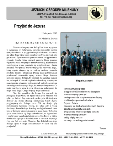JEZUICKI OŚRODEK MILENIJNY 5835 W. Irving Park Rd., Chicago, IL 60634 tel. 773. 777 7000; www.jezuici.org Przyjść do Jezusa 12 sierpnia 2012 19. Niedziela Zwykła 1 Krl 19, 4-8; Ps 34, 2-9; Ef 4, 30-5,2; J 6, 41-51 Mowa eucharystyczna, którą Pan Jezus wygłasza w synagodze w Kafarnaum, ujawnia różnorakie ludzkie opory i trudności w przyjęciu nie tylko Mistrza z Nazaretu, ale także Boga Ojca, który posłał swego Syna na świat, aby go zbawić. Żydzi szemrali przeciw Niemu. Przypomina to sytuację Izraela, który szemrał przeciw Bogu podczas wędrówki przez pustynię do Ziemi Obiecanej. Szemranie to znak kryzysu wiary, poddania się wątpliwościom i braku zaufania. Aby przyjąć przychodzącego do człowieka Boga, który często ukrywa się za zasłoną znaków, potrzeba prostoty, pokory i otwartości. Dzisiaj także potrzeba nam przekraczać różnorakie opory wobec Boga, bowiem jesteśmy kuszeni do tego, by szemrać, by narzekać na nasz los, na innych. Człowiek ciągle niezadowolony, skupiony na zaspokajaniu sztucznie wytworzonych potrzeb nawet nie zauważy przechodzącego Boga, bo patrzy w inną stronę. Co mnie zamyka w sobie i czyni ślepym na pukającego do mego serca Boga? Czego dotyczy moje szemranie? Ten, kto przyjdzie do Jezusa, kto pozwoli się pociągnąć Bogu Ojcu, ten będzie miał życie wieczne. Nie tylko po śmierci Bóg wskrzesi go do życia. Obietnica ta dotyczy już chwili obecnej. Spożywając Chleb Żywy, przyjmujemy dar Bożego życia. Tak się dzieje, gdy przyjmujemy Komunię świętą, ale także gdy z wiarą słuchamy Słowa Bożego. Jesteśmy wtedy jak latorośl, która trwa w krzewie winnym i czerpie z niego życie. To boskie życie to udzielanie się Boga człowiekowi, to Jego miłość i pokój, które wypełniają ludzkie serce. Św. Paweł w Liście do Galatów opisuje to doświadczenie w słowach: Już nie ja żyję, ale żyje we mnie Chrystus. Jak doświadczam tego Bożego życia w mojej codzienności? W czym się ono przejawia? o. Artur Wenner, SJ bieg do Jasności ten bieg musi się udać bieg po Miłość i nadzieję na Szczęście nie musimy się spieszyć to nieprawda że kto pierwszy ten lepszy pozbierajmy po drodze kwiaty Piękna i Dobra nauczmy się kochać przydrożnych Gapiów posyłając im ciepły uśmiech oni przecież wkrótce podążą za nami nie musimy się spieszyć każdy zdąży na czas na swój czas w biegu do Jasności Teresa http://pielgrzymowaniedrzewem.blog.onet.pl Słuchaj! Radio Deon - WPNA 1490 AM - pon.-pt.. 1:00 - 6:00 i 11:00 - 12:00 - tel. 773 481.9414 PORZĄDEK MSZY ŚWIĘTYCH Poniedziałek - pi¹tek: 8:00, 18:00, 19:00 (radiowa: WCEV 1450) I piątek miesiąca: 8:00, 19:00, 20:30 Środa: 19:00 - nowenna do Matki Bożej Nieustającej Pomocy Sobota: 8:00, tylko w I sobotę miesiąca o 17:00 dla chorych, 19:00 Niedziela: 8:00 (radiowa), 9:30, 11:00, 13:00, 19:00, 20:30 SpowiedŸ św.: od poniedziałku do soboty - 7:30 i 18:30, w niedzielę - pó³ godziny przed ka¿d¹ Msz¹ Œwiêt¹, w1. pi¹tek miesi¹ca - od 18:30 do 21:00 Adoracja Najświętszego Sakramentu - od poniedziałku do czwartku - od 18:30 do 19:00 - piątek od 14.30, sobota - od 18:00 do 19:00 Sanktuarium Najświętszego Serca Pana Jezusa Jezuicki Ośrodek Milenijny 5835 W. Irving Park Rd.; Chicago, IL 60634, Tel. 773 777 7000; fax 773 427 0126 e-mail: [email protected] Biuro czynne: od poniedziałku do piątku: 8:30 - 9:00, 15:30 - 20:30 sobota: 9:30 - 20:30, niedziela: 8:30 - 14:30, 18:30 - 21:30 Biblioteka czynna: czwartek - piątek: 20:00 - 20:30; (poniedziałek, wtorek, środa - nieczynna) sobota: 18:00 - 19:00; niedziela: 10:30 - 14:30; 19:00 - 21:00 Kawiarenka czynna: niedz.: 10:00 - 14:30, 19:00 - 21:30 Sacred Heart Mission House 4105 N. Avers Ave., Chicago, IL 60618 Tel. 773 588 74 76; fax 773 588 65 17 Rektor Sanktuarium i Przełożony Jezuitów o. Stanisław Czarnecki, SJ (773-588-7476 - ext. 224) o. Józef Birecki, SJ (773-588-7476 - ext. 225) o. Mirosław Bożek, SJ (773-588-7476 - ext. 234) o. Wiesław Faron, SJ (773-777-7000 - ext. 121) o. Jerzy Karpiński, SJ (773-588-7476 - ext. 237) o. Piotr Kochanowicz, SJ (773-588-7476 - ext. 227) br. Adam Poręba, SJ (773-777-7000 - ext. 122) Wszelkie ofiary i donacje prosimy kierowaæ na adres Sanktuarium. Donacje s¹ wolne od podatku i mo¿na je odpisywaæ przy rozliczeniu z IRS. INTENCJE MSZY ŚWIĘTYCH Niedziela, 12 VIII 2012r. 8:00 + + Genowefa, Władysław, Paweł i Wojciech Młynarczyk 9:30 zbiorowa 11:00 + Władysław Grala w 1. rocznicę śmierci 13:00 + Piotr Rak w 8. rocznicę śmierci 19:00 zbiorowa 20:30 + Helena Lenard w 11 miesięcy po śmierci; + Józef Lenard w 10 miesięcy Poniedziałek, 13 VIII 8:00 o opiekę i opatrzność Bożą dla Aleksandry i Jacka 18:00 z podziękowaniem za otrzymane łaski z prośbą o Boże błogosławieństwo i opiekę Matki Najświętszej w rocznicę śłubu dla Marcina i Sylwii 19:00 zbiorowa Wtorek, 14 VIII - św. Maksymiliana Marii Kolbego 8:00 o szczęśliwy lot i podróż do Polski i udaną operację dla Małgorzaty; o zdrowie dla Józefy 18:00 + Aniela Czabała w 22. rocznicę śmierci 19:00 zbiorowa Środa, 15 VIII - Wniebowzięcie Najświętszej Maryji Panny 8:00 za Dobroczyńców Jezuickiego Ośrodka Milenijnego 11:00 o zdrowie i Boże błogosławieństwo dla Agnieszki i Reginy Dąbrowskiej 19:00 zbiorowa 20:30 + Zofia Ignatowska w 5 miesięcy po śmierci Czwartek , 16 VIII 8:00 dziękczynna za otrzymane łaski 18:00 + + Wacław i Bronisława oraz za zmarłych z rodziny Pryzmontów 19:00 zbiorowa Piątek , 17 VIII - wspomnienie św. Jacka 8:00 + + Tomasz, Maria i Zofia 18:00 + Józef Wałuszko w 1. rocznicę śmierci 19:00 zbiorowa Sobota , 11 VIII - św. Alberta Hurtado 8:00 + Lucjan Pasiewicz w 9. rocznicę śmierci 19:00 zbiorowa TRANSMISJE RADIOWE I INTERNETOWE Transmisje radiowe z Sanktuarium: w ciągu tygodnia (od poniedziałku do piątku): godz. 19-20, Radio WCEV 1450 (www.wcev1450.com) w niedziele: godz 8-9, Radio WCEV 1450, or