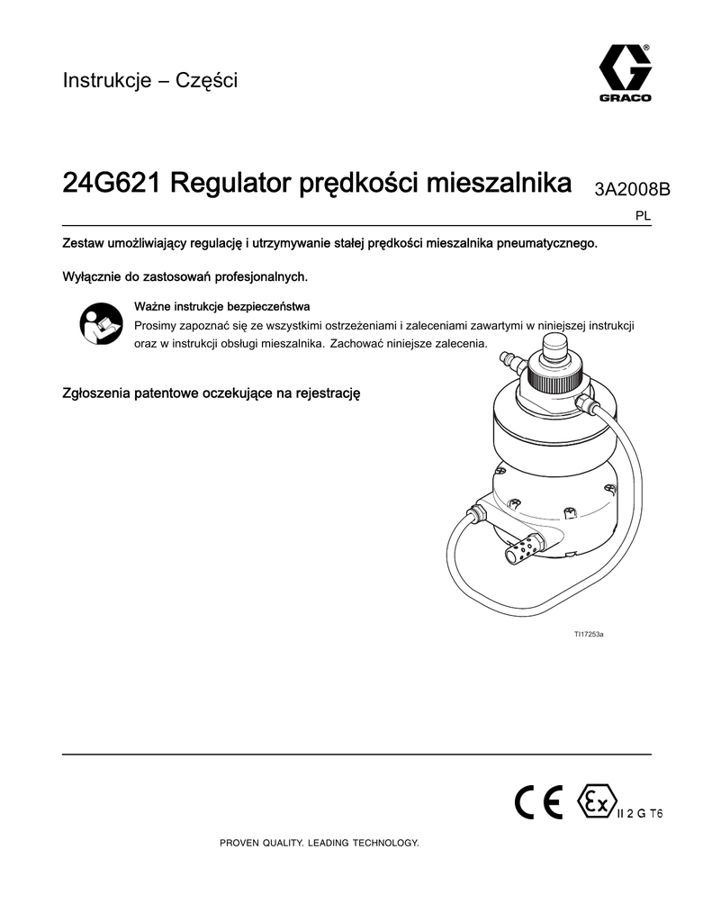 Instrukcje – Części 24G621 Regulator prędkości mieszalnika 3A2008B PL Zestaw umożliwiający regulację i utrzymywanie stałej prędkości mieszalnika pneumatycznego. Wyłącznie do zastosowań profesjonalnych. Ważne instrukcje bezpieczeństwa Prosimy zapoznać się ze wszystkimi ostrzeżeniami i zaleceniami zawartymi w niniejszej instrukcji oraz w instrukcji obsługi mieszalnika. Zachować niniejsze zalecenia. Zgłoszenia patentowe oczekujące na rejestrację TI17253a PROVEN QUALITY. LEADING TECHNOLOGY. Contents Montaż............................................................... 3 Eksploatacja....................................................... 5 Rozwiązywanie problemów ................................. 6 Naprawa ............................................................ 7 Dane techniczne................................................. 10 ........................................................... 11 Standardowa gwarancja firmy Graco.................... 12 Części zestawu .................................................. 8 2 3A2008B Montaż 2. Zamontować złączkę przewodu powietrza (21) w miejsce zaworu iglicowego. Regulator prędkości mieszalnika pasuje do następujących silników pneumatycznych firmy Graco: Silnik, nr części 101140 16A871 101388 111310 UWAGA: przed montażem należy upewnić się, że silnik pneumatyczny mieszalnika ma co najmniej 12,7 cm (5 cali) wolnej przestrzeni w poziomie oraz co najmniej 10,2 cm (4 cale) wolnej przestrzeni w pionie. UWAGA: jeśli korzystasz ze smarownicy, zamontuj ją od strony dopływu powietrza regulatora prędkości. TI17256a-1 3. Przykręcić palcami nakrętkę zaciskową (24) do złączki kołnierzowej (23). Umieścić zespół złączek (23, 24) na odsłoniętym wale silnika pneumatycznego, złączką kołnierzową do dołu. 1. Zdjąć pokrywę silnika (A) oraz zawór iglicowy (B) za pomocą klucza wielofunkcyjnego (26). Schować elementy w bezpiecznym miejscu; będą potrzebne, jeśli regulator prędkości zostanie w przyszłości zdjęty. TI17254a-1 TI17257a-1 TI17255a-1 3A2008B 3 4. Za pomocą klucza imbusowego (25) i klucza wielofunkcyjnego (26) dokręcić nakrętkę zaciskową (24) przynajmniej na 1/8 obrotu. To zapewni mocne połączenie z wałem silnika. 6. Podłączyć przewód powietrza (27) do złączki regulatora prędkości (29) i złączki silnika pneumatycznego (21). 21(Nr ref.) TI17258a-1 5. Upewnić się, że sześciokątna końcówka wału (C) znajduje się w gnieździe sześciokątnym (D) złączki kołnierzowej. Przykręcić palcami podstawę regulatora prędkości do gwintów znajdujących się w górnej części silnika. TI17253a-1 7. Wznowić używanie urządzenia. Podłączyć główny przewód powietrza do szybkozłączki (28) regulatora prędkości. TI17259a-1 4 3A2008B Eksploatacja Podłączyć główny przewód powietrza do szybkozłączki (28), znajdującej się na regulatorze prędkości. Nie przekraczać maksymalnego ciśnienia wlotowego powietrza 0,7 MPa, 7,0 bar (100 psi). Ustawić prędkość mieszalnika za pomocą pokrętła (16), znajdującego się w górnej części regulatora. Przekręcić w kierunku przeciwnym do ruchu wskazówek zegara (na zewnątrz), aby zwiększyć prędkość mieszalnika. Przekręcić w kierunku zgodnym z ruchem wskazówek zegara (do wewnątrz), aby zmniejszyć prędkość mieszalnika. Gdy ustawiona zostanie pożądana prędkość, regulator prędkości utrzyma ją poprzez regulację przepływu powietrza w silniku pneumatycznym. 16 Przekręcić pokrętło w lewo w celu zwiększenia prędkości. Przekręcić pokrętło w prawo w celu zmniejszenia prędkości. 28 TI17260a-1 Aby wyłączyć mieszalnik, należy odłączyć dopływ powietrza lub użyć pokrętła regulującego prędkość, przekręcając je do końca w kierunku zgodnym z ruchem wskazówek zegara. 3A2008B 5 Rozwiązywanie problemów Problem Rozwiązanie Regulator prędkości nie dostosowuje się do zmian w obciążeniu lub wyłącza się zanim pokrętło (16) zostanie przekręcone do końca. Usunąć iglicę (13). Nasmarować iglicę i pierścień uszczelniający (33) uniwersalnym smarem litowym. Regulator prędkości nie utrzymuje stałej prędkości lub prędkość ulega ciągłym zmianom. Wymienić iglicę (13), nasadkę u-cup (11) i pierścień uszczelniający (33), korzystając z zestawu naprawczego 24J886. Po uruchomieniu silnik przez kilka sekund pracuje bardzo szybko zanim regulator prędkości go spowolni. Upewnić się, czy nakrętka zaciskowa (24) i złączka kołnierzowa (23) są mocno przykręcone do wału silnika. Patrz: Montaż, page 3 . Regulator prędkości nie odcina silnika pneumatycznego, gdy pokrętło przekręcone jest maksymalnie do dołu, lub prędkość nie może zostać zredukowana poprzez przekręcenie pokrętła w dół. Wymienić iglicę (13), uszczelkę o-ring (18) i łożysko (20), korzystając z zestawu naprawczego 24J886. 6 3A2008B Naprawa UWAGA: aby przeprowadzić naprawę mieszalnika, należy skorzystać z dołączonej do niego instrukcji. UWAGA: dostępny jest zestaw naprawczy 24J886. Zestaw należy zamawiać oddzielnie. Części zestawu są oznaczone gwiazdką, na przykład (3*). Aby uzyskać najlepsze wyniki, należy zastosować wszystkie części wchodzące w skład zestawu. UWAGA: za każdym razem, gdy konieczna jest lubrykacja, należy stosować uniwersalny smar litowy. Nr części 111920. 1. Odłączyć główny przewód powietrza regulatora prędkości. 2. Odkręcić rurkę (27) łączącą regulator prędkości z silnikiem pneumatycznym. dużej podkładki (12). Zamontować wał (4) oraz zespół ramion krzywki w dolnej części obudowy (1). Łożysko (3*) musi być w pełni osadzone w gnieździe znajdującym się w obudowie. 10. Przykręcić górną część obudowy (2) do dolnej części obudowy (1). 11. Przekręcić pokrętło regulacyjne (16) do samego końca w kierunku przeciwnym do ruchu wskazówek zegara (na zewnątrz). Przykręcić nakrętkę r