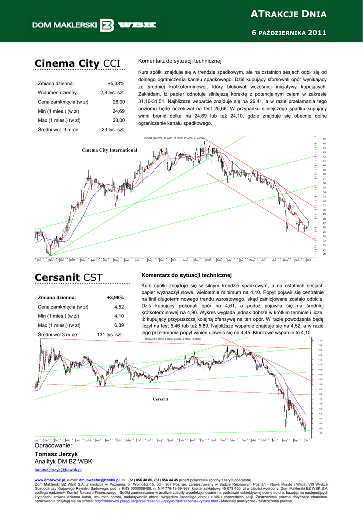 ATRAKCJE DNIA o Komentarz do sytuacji technicznej Cinema City CCI Zmiana dzienna: Kurs spółki znajduje się w trendzie spadkowym, ale na ostatnich sesjach odbił się od dolnego ograniczenia kanału spadkowego. Dziś kupujący sforsowali opór wynikający ze średniej krótkoterminowej, który blokował wcześniej inicjatywy kupujących. Zakładam, iŜ papier odnotuje silniejszą korektę z potencjalnym celem w zakresie 31,10-31,51. NajbliŜsze wsparcie znajduje się na 26,41, a w razie przełamania tego poziomu będę oczekiwał na test 25,66. W przypadku silniejszego spadku kupujący winni bronić dołka na 24,69 lub teŜ 24,10, gdzie znajduje się obecnie dolne ograniczenie kanału spadkowego. +5,38% Wolumen dzienny: 2,8 tys. szt. Cena zamknięcia (w zł) 26,00 Min (1 mies.) (w zł) 24,69 Max (1 mies.) (w zł) 28,00 Średni wol. 3 m-ce 6 PAŹDZIERNIKA 2011 23 tys. szt. CCIINT (26.3700, 27.4000, 26.3700, 27.4000, +1.40000) 46 45 44 Cinema City International 43 42 41 40 39 38 37 36 35 34 33 32 31 30 29 28 27 26 25 24 23 22 21 20 Oct Nov Dec 2010 Feb Mar Apr May Jun Jul Oct Nov Dec 2011 Feb Mar Apr May Jun Jul Aug Sep Oct Kurs spółki znajduje się w silnym trendzie spadkowym, a na ostatnich sesjach papier wyznaczył nowe, wieloletnie minimum na 4,10. Popyt pojawił się centralnie na linii długoterminowego trendu wzrostowego, skąd zainicjowane zostało odbicie. Dziś kupujący pokonali opór na 4,61, a podaŜ pojawiła się na średniej krótkoterminowej na 4,90. Wykres wygląda jednak dobrze w krótkim terminie i liczę, iŜ kupujący przypuszczą kolejną ofensywę na ten opór. W razie powodzenia będę liczył na test 5,46 lub teŜ 5,89. NajbliŜsze wsparcie znajduje się na 4,52, a w razie jego przełamania popyt winien ujawnić się na 4,45. Kluczowe wsparcie to 4,10. +3,98% Cena zamknięcia (w zł) 4,52 Min (1 mies.) (w zł) 4,10 Max (1 mies.) (w zł) 6,39 Średni wol 3 m-ce Sep Komentarz do sytuacji technicznej Cersanit CST Zmiana dzienna: Aug 131 tys. szt. CERSANIT (4.59000, 4.90000, 4.59000, 4.75000, +0.23000) 13.5 13.0 12.5 12.0 11.5 11.0 10.5 10.0 9.5 9.0 8.5 8.0 Cersanit 7.5 7.0 6.5 6.0 5.5 5.0 4.5 4.0 Aug Sep Oct Nov Dec 2010 Feb Mar Apr May Jun Jul Aug Sep Oct Nov Dec 2011 Feb Mar Apr May Jun Jul Aug Sep Oct Opracowanie: Tomasz Jerzyk Analityk DM BZ WBK [email protected] www.dmbzwbk.pl, e-mail: [email protected], tel.: (61) 856 48 80, (61) 856 44 45 (koszt połączenia zgodny z taryfą operatora) Dom Maklerski BZ WBK S.A. z siedzibą w Poznaniu, pl. Wolności 15, 60 - 967 Poznań, zarejestrowany w Sądzie Rejonowym Poznań - Nowe Miasto i Wilda, VIII Wydział Gospodarczy Krajowego Rejestru Sądowego, pod nr KRS 0000006408, nr NIP 778-13-59-968, kapitał zakładowy 45 073 400 zł w całości wpłacony. Dom Maklerski BZ WBK S.A. podlega nadzorowi Komisji Nadzoru Finansowego. Spółki zamieszczone w analizie zostały wyselekcjonowane na podstawie subiektywnej oceny autora, bazując na następujących kryteriach: zmiana dzienna kursu, wolumen obrotu, nadaktywność obrotu względem średniego obrotu z kilku poprzednich sesji. ZastrzeŜenia prawne dotyczące charakteru opracowania znajdują się na stronie: http://dmbzwbk.pl/regulacje/zastrzezenia-i-ryzyko/zastrzezenia-i-ryzyko.html - Materiały analityczne - zastrzeŜenia prawne Niniejszy materiał przygotowany przez Dom Maklerski BZ WBK S.A. (DM BZ WBK S.A.) ma charakter wyłącznie informacyjny i nie stanowi oferty ani rekomendacji zawarcia transakcji kupna lub sprzedaŜy jakiegokolwiek instrumentu finansowego, produktu lub towaru. Niniejszy materiał nie stanowi porady inwestycyjnej, ani teŜ nie jest wskazaniem, iŜ jakakolwiek inwestycja lub strategia jest odpowiednia w indywidualnej sytuacji inwestora. System rekomendacyjny DM BZ WBK S.A. opiera się na wyznaczaniu cen docelowych i ich relacji do ceny bieŜącej instrumentów finansowych, poza tym w przypadku rekomendacji kierowanych do szerokiego kręgu odbiorców wymaga zastosowania dwóch sposobów wyceny. Zawarte w niniejszym materiale informacje nie spełniają Ŝadnego z powyŜszych wymogów. Ponadto w zaleŜności od okoliczności mogą one stanowić podstawę do podjęcia róŜnych (takŜe o przeciwstawnych kierunkach) zachowań inwestycyjnych dla poszczególnych inwestorów. Dane prezentowane w niniejszym materiale zostały uzyskane lub zaczerpnięte ze źródeł uznanych przez DM BZ WBK S.A. za wiarygodne, jednakŜe DM BZ WBK S.A. nie moŜe zagwarantować ich dokładności i kompletności. Interpretacja wykresu jest subiektywną oceną analityka dotyczącą oceny technicznej wykresu. Wykres przygotowano za pomocą programu Metastock, AmiBroker lub Fibotrader. Źródłem danych są GPW, PAP, Reuters, Bloomberg, EPFR, GUS, NBP, DM BZ WBK S.A., Akcje.net, prasa finansowa lub internetowe serwisy finansowo-ekonomiczne. Niniejsze opracowanie i zawarte w nim komentarze są wyrazem wiedzy oraz poglądów autorów i nie powinny być inaczej interpretowane. Inwestorzy korzystający z niniejszego materiału nie mogą zrezygnować z przeprowadzenia niezaleŜnej oceny i uwzględnienia innych okoliczności aniŜeli te, które zostały wskazane w niniejszym materiale. DM BZ WBK S.A. nie ponosi odpowiedzialności za szkody poniesione w wyniku decyzji podjętych na podstawie informacji i opinii zawartych w niniejszym opracowaniu. Powielanie bądź publikowanie niniejszego opracowania lub jego części bez pisemnej zgody DM BZ WBK S.A. jest zabronione. DM BZ WBK S.A. mógł wydać w przeszłości lub moŜe wydać w przyszłości inne dokumenty, przedstawiające inne wnioski, niespójne z przedstawionymi w niniejszym dokumencie. Takie dokumenty odzwierciedlają róŜne załoŜenia, punkty widzenia oraz metody analityczne przyjęte przez przygotowujących je analityków. DM BZ WBK S.A. nie jest zobowiązany do zapewnienia, iŜ takie dokumenty będą podawane do wiadomości adresatów niniejszego dokumentu. Niniejszy materiał nie zawiera ani nie stanowi oferty sprzedaŜy pap