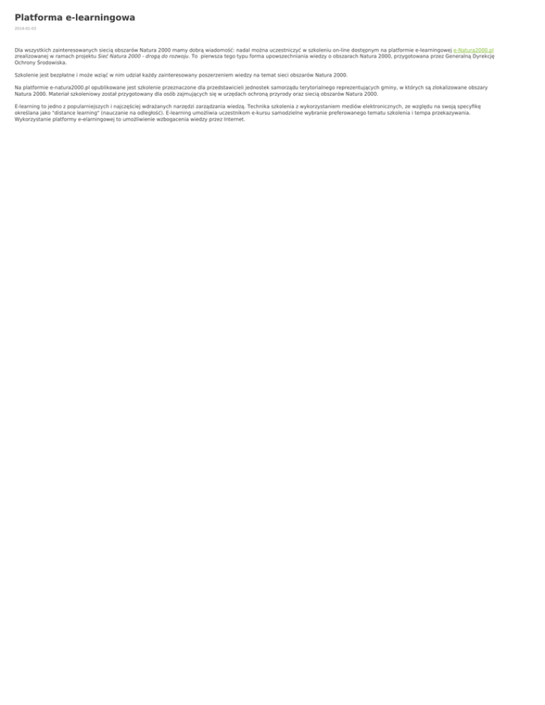 Platforma e-learningowa 2014-01-03 Dla wszystkich zainteresowanych siecią obszarów Natura 2000 mamy dobrą wiadomość: nadal można uczestniczyć w szkoleniu on-line dostępnym na platformie e-learningowej e-Natura2000.pl zrealizowanej w ramach projektu Sieć Natura 2000 - drogą do rozwoju. To pierwsza tego typu forma upowszechniania wiedzy o obszarach Natura 2000, przygotowana przez Generalną Dyrekcję Ochrony Środowiska. Szkolenie jest bezpłatne i może wziąć w nim udział każdy zainteresowany poszerzeniem wiedzy na temat sieci obszarów Natura 2000. Na platformie e-natura2000.pl opublikowane jest szkolenie przeznaczone dla przedstawicieli jednostek samorządu terytorialnego reprezentujących gminy, w których są zlokalizowane obszary Natura 2000. Materiał szkoleniowy został przygotowany dla osób zajmujących się w urzędach ochroną przyrody oraz siecią obszarów Natura 2000. E-learning to jedno z popularniejszych i najczęściej wdrażanych narzędzi zarządzania wiedzą. Technika szkolenia z wykorzystaniem mediów elektronicznych, ze względu na swoją specyfikę określana jako "distance learning" (nauczanie na odległość). E-learning umożliwia uczestnikom e-kursu samodzielne wybranie preferowanego tematu szkolenia i tempa przekazywania. Wykorzystanie platformy e-elarningowej to umożliwienie wzbogacenia wiedzy przez Internet.