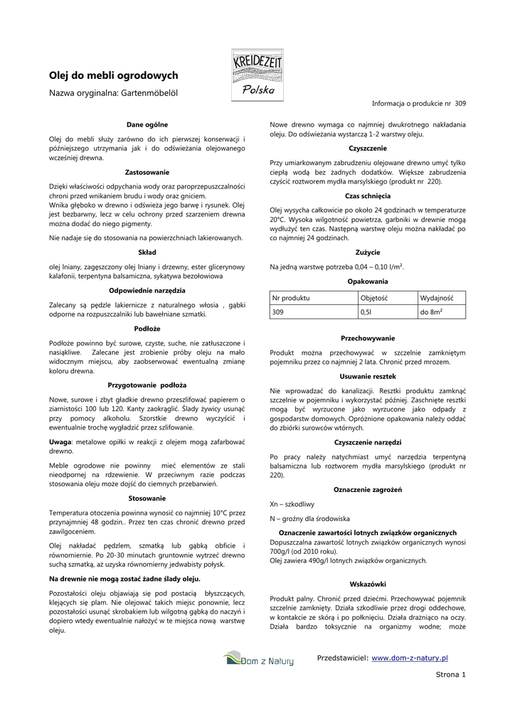 Olej do mebli ogrodowych Nazwa oryginalna: Gartenmöbelöl Informacja o produkcie nr 309 Dane ogólne Olej do mebli służy zarówno do ich pierwszej konserwacji i późniejszego utrzymania jak i do odświeżania olejowanego wcześniej drewna. Zastosowanie Dzięki właściwości odpychania wody oraz paroprzepuszczalności chroni przed wnikaniem brudu i wody oraz gniciem. Wnika głęboko w drewno i odświeża jego barwę i rysunek. Olej jest bezbarwny, lecz w celu ochrony przed szarzeniem drewna można dodać do niego pigmenty. Nowe drewno wymaga co najmniej dwukrotnego nakładania oleju. Do odświeżania wystarczą 1-2 warstwy oleju. Czyszczenie Przy umiarkowanym zabrudzeniu olejowane drewno umyć tylko ciepłą wodą bez żadnych dodatków. Większe zabrudzenia czyścić roztworem mydła marsylskiego (produkt nr 220). Czas schnięcia Nie nadaje się do stosowania na powierzchniach lakierowanych. Olej wysycha całkowicie po około 24 godzinach w temperaturze 20°C. Wysoka wilgotność powietrza, garbniki w drewnie mogą wydłużyć ten czas. Następną warstwę oleju można nakładać po co najmniej 24 godzinach. Skład Zużycie olej lniany, zagęszczony olej lniany i drzewny, ester glicerynowy kalafonii, terpentyna balsamiczna, sykatywa bezołowiowa Odpowiednie narzędzia Zalecany są pędzle lakiernicze z naturalnego włosia , gąbki odporne na rozpuszczalniki lub bawełniane szmatki. Na jedną warstwę potrzeba 0,04 – 0,10 l/m². Opakowania Nr produktu Objętość Wydajność 309 0,5l do 8m² Podłoże Podłoże powinno być surowe, czyste, suche, nie zatłuszczone i nasiąkliwe. Zalecane jest zrobienie próby oleju na mało widocznym miejscu, aby zaobserwować ewentualną zmianę koloru drewna. Przygotowanie podłoża Nowe, surowe i zbyt gładkie drewno przeszlifować papierem o ziarnistości 100 lub 120. Kanty zaokrąglić. Ślady żywicy usunąć przy pomocy alkoholu. Szorstkie drewno wyczyścić i ewentualnie trochę wygładzić przez szlifowanie. Uwaga: metalowe opiłki w reakcji z olejem mogą zafarbować drewno. Meble ogrodowe nie powinny mieć elementów ze stali nieodpornej na rdzewienie. W przeciwnym razie podczas stosowania oleju może dojść do ciemnych przebarwień. Stosowanie Temperatura otoczenia powinna wynosić co najmniej 10°C przez przynajmniej 48 godzin.. Przez ten czas chronić drewno przed zawilgoceniem. Olej nakładać pędzlem, szmatką lub gąbką obficie i równomiernie. Po 20-30 minutach gruntownie wytrzeć drewno suchą szmatką, aż uzyska równomierny jedwabisty połysk. Na drewnie nie mogą zostać żadne ślady oleju. Pozostałości oleju objawiają się pod postacią błyszczących, klejących się plam. Nie olejować takich miejsc ponownie, lecz pozostałości usunąć skrobakiem lub wilgotną gąbką do naczyń i dopiero wtedy ewentualnie nałożyć w te miejsca nową warstwę oleju. Przechowywanie Produkt można przechowywać w szczelnie zamkniętym pojemniku przez co najmniej 2 lata. Chronić przed mrozem. Usuwanie resztek Nie wprowadzać do kanalizacji. Resztki produktu zamknąć szczelnie w pojemniku i wykorzystać później. Zaschnięte resztki mogą być wyrzucone jako wyrzucone jako odpady z gospodarstw domowych. Opróżnione opakowania należy oddać do zbiórki surowców wtórnych. Czyszczenie narzędzi Po pracy należy natychmiast umyć narzędzia terpentyną balsamiczna lub roztworem mydła marsylskiego (produkt nr 220). Oznaczenie zagrożeń Xn – szkodliwy N – groźny dla środowiska Oznaczenie zawartości lotnych związków organicznych Dopuszczalna zawartość lotnych związków organicznych wynosi 700g/l (od 2010 roku). Olej zawiera 490g/l lotnych związków organicznych. Wskazówki Produkt palny. Chronić przed dziećmi. Przechowywać pojemnik szczelnie zamknięty. Działa szkodliwie przez drogi oddechowe, w kontakcie ze skórą i po połknięciu. Działa drażniąco na oczy. Działa bardzo toksycznie na organizmy wodne; może Przedstawiciel: www.dom-z-natury.pl Strona 1 powodować długo utrzymujące się niekorzystne zmiany w środowisku wodnym. Nie wprowadzać do kanalizacji. W razie połknięcia nie wywoływać wymiotów: niezwłocznie zasięgnąć porady lekarza i pokazać opakowanie lub etykietę. Nosić odpowiednią odzież ochronną, odpowiednie rękawice ochronne i okulary lub ochronę twarzy. Stosować wyłącznie w dobrze wentylowanych pomieszczeniach. Schnące oleje zagrażają samozapaleniem się szmat używanych do czyszczenia! Nasiąknięte olejem szmaty należy wietrzyć na zewnątrz, lub też przechowywać w szczelnie zamkniętym ogniotrwałym pojemniku (metalowa puszka lub szklany pojemnik). Przedstawione informacje zostały opracowane na podstawie naszego doświadczenia. Istnieją różne metody użycia i różny wpływ na środowisko oraz różnego rodzaju właściwości podłoża, należy więc wykluczyć zobowiązanie za ogólną ważność prawną pojedynczych zaleceń. Przed użyciem należy sprawdzić produkt pod kątem zdatności do zastosowania (powłoka próbna). W przypadku nowego produktu albo zmiany istniejącego produktu informacje te tracą swoją ważność. Najnowsze informacje o produktach można znaleźć w internecie pod www.kreidezeit.de albo bezpośrednio u firmy Kreidezeit. (17.04.2013) Przedstawiciel: www.dom-z-natury.pl Strona 2