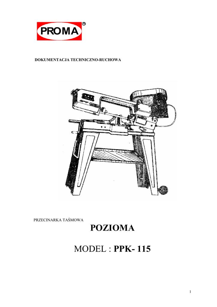 R PROMA DOKUMENTACJA TECHNICZNO-RUCHOWA PRZECINARKA TAŚMOWA POZIOMA MODEL : PPK- 115 1 PROMA DOKUMENTACJA TECHNICZNO-RUCHOWA PRZECINARKA TAŚMOWA PPK-115 SPIS TREŚCI 1. 2. 3. 4. 5. 6. 7. WSTĘP 1.1. Opis ogólny maszyny.................................................................................................................. 1 1.2. Parametry maszyny...................................................................................................................... 2 1.3. Podstawowe zespoły, mechanizmy maszyny ........................................................................... 3 1.3.1. Elementy regulacji mechanizmów przecinarki.................................................................... 4 BEZPIECZEŃSTWO PRACY 2.1. ZagroŜenia w trakcie pracy maszyny........................................................................................ 5 2.2. Dopuszczalny poziom hałasu...................................................................................................... 5 2.3. Źródła niebezpieczeństwa........................................................................................................... 5 2.4. Stanowisko pracy........................................................................................................................ 5 2.5. Osobiste wyposaŜenie ochronne................................................................................................ 6 2.6. Środki bezpieczeństwa w miejscu ustawiania maszyny............................................................ 6 2.7. Postępowanie w razie wypadku lub awarii................................................................................. 6 INSTALACJA MASZYNY 3.1 Miejsce przeznaczone pod maszynę........................................................................................... 6 3.2. Transport..................................................................................................................................... 6 3.3.Rozpakowanie i rozkonserwowanie ......................................................................................... . 7 3.4. MontaŜ i ustawienie................................................................................................................... 7 3.5. Podłączenie maszyny do sieci elektrycznej............................................................................... 7 3.6. Uruchomienie............................................................................................................................. 8 PRACA NA MASZYNIE 4.1. Pulpit sterowniczy...................................................................................................................... 8 4.2. Czynności przygotowawcze do pracy........................................................................................... 9 4.2.1. Dobór, zdejmowanie i zakładanie taśmy...............................................................................9 4.2.2. Mocowanie materiału..........................................................................................................10 4.3. Tabela doboru podziałki międzyzębnej taśmy tnącej..................................................................11 4.4. Tabela doboru prędkości przesuwu taśmy...................................................................................12 4.5. Prace na maszynie-cięcie.............................................................................................................12 OBSŁUGA EKSPLOATACYJNA 5.1. Konserwacja , smarowanie......................................................................................................... 13 5.2. Regulacja zespołów i mechanizmów.......................................................................................... 15 5.2.1 Regulacja pasków napędowych,nastawianie prędkości przesuwu taśmy............................15 5.2.2. Ustawienie i regulacja prowadników taśmy...................................................................... 15 5.2.3. Regulacja ustawienia koła napinającego............................................................................ 16 5.2.4. Regulacja posuwu opadania ramienia przecinarki..............................................................17 5.3. Typowe usterki, ich przyczyny i sposoby usuwania...................................................................17 5.4. Specyfikacja łoŜysk.....................................................................................................................19 5.5. Naprawy i remonty......................................................................................................................20 SPECYFIKACJA CZĘŚCI PRZECINARKI TAŚMOWEJ 21 INSTRUKCJA OBSŁUGI - część elektryczna 24 7.1. Wykaz elektrycznych elementów i części zamiennych.............................................................. 25 7.2. Schematy elektryczne dla maszyny - ideowy..................................................................................................................................26 - montaŜowy............................................................................................................................27 8. - CE deklaracja zgodności 2 PROMA DOKUMENTACJA TECHNICZNO-RUCHOWA PRZECINARKA TAŚMOWA PPK-115 1. WSTĘP 1.1. OPIS OGÓLNY MASZYNY CHARAKTERYSTYKA MASZYNY Przecinarka taśmowa do metali, pozioma PPK-115 ze skrętnym imadłem ( rys. 1) jest przeznaczona do przecinania prętów , rur, profili, kształtowników wykonanych ze stali, metali nieŜelaznych i tworzyw sztucznych.Przecinanie moŜe odbywać się w płaszczyźnie prostopadłej do osi przecinanego materiału i pod dowolnym kątem w zakresie od 0 do 45° .Materiał do cięcia moŜe być podawany ręcznie lub dowolnym urządzeniem mechanicznym.Natomiast posuw narzędzia odbywa się samoczynnie. Odpowiednią szybkość skrawania ( szybkość przesuwu taśmy) uzyskuje się przez zmianę przełoŜenia na kołach pasowych.Do po