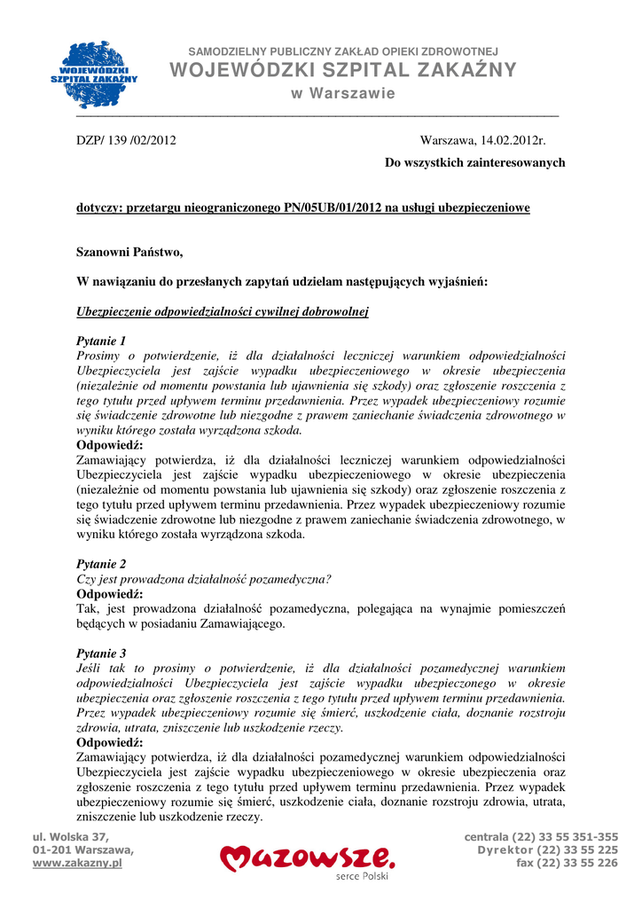 SAMODZIELNY PUBLICZNY ZAKŁAD OPIEKI ZDROWOTNEJ WOJEWÓDZKI SZPITAL ZAKAŹNY w Warszawie ___________________________________________________________________ DZP/ 139 /02/2012 Warszawa, 14.02.2012r. Do wszystkich zainteresowanych dotyczy: przetargu nieograniczonego PN/05UB/01/2012 na usługi ubezpieczeniowe Szanowni Państwo, W nawiązaniu do przesłanych zapytań udzielam następujących wyjaśnień: Ubezpieczenie odpowiedzialności cywilnej dobrowolnej Pytanie 1 Prosimy o potwierdzenie, iŜ dla działalności leczniczej warunkiem odpowiedzialności Ubezpieczyciela jest zajście wypadku ubezpieczeniowego w okresie ubezpieczenia (niezaleŜnie od momentu powstania lub ujawnienia się szkody) oraz zgłoszenie roszczenia z tego tytułu przed upływem terminu przedawnienia. Przez wypadek ubezpieczeniowy rozumie się świadczenie zdrowotne lub niezgodne z prawem zaniechanie świadczenia zdrowotnego w wyniku którego została wyrządzona szkoda. Odpowiedź: Zamawiający potwierdza, iŜ dla działalności leczniczej warunkiem odpowiedzialności Ubezpieczyciela jest zajście wypadku ubezpieczeniowego w okresie ubezpieczenia (niezaleŜnie od momentu powstania lub ujawnienia się szkody) oraz zgłoszenie roszczenia z tego tytułu przed upływem terminu przedawnienia. Przez wypadek ubezpieczeniowy rozumie się świadczenie zdrowotne lub niezgodne z prawem zaniechanie świadczenia zdrowotnego, w wyniku którego została wyrządzona szkoda. Pytanie 2 Czy jest prowadzona działalność pozamedyczna? Odpowiedź: Tak, jest prowadzona działalność pozamedyczna, polegająca na wynajmie pomieszczeń będących w posiadaniu Zamawiającego. Pytanie 3 Jeśli tak to prosimy o potwierdzenie, iŜ dla działalności pozamedycznej warunkiem odpowiedzialności Ubezpieczyciela jest zajście wypadku ubezpieczonego w okresie ubezpieczenia oraz zgłoszenie roszczenia z tego tytułu przed upływem terminu przedawnienia. Przez wypadek ubezpieczeniowy rozumie się śmierć, uszkodzenie ciała, doznanie rozstroju zdrowia, utrata, zniszczenie lub uszkodzenie rzeczy. Odpowiedź: Zamawiający potwierdza, iŜ dla działalności pozamedycznej warunkiem odpowiedzialności Ubezpieczyciela jest zajście wypadku ubezpieczeniowego w okresie ubezpieczenia oraz zgłoszenie roszczenia z tego tytułu przed upływem terminu przedawnienia. Przez wypadek ubezpieczeniowy rozumie się śmierć, uszkodzenie ciała, doznanie rozstroju zdrowia, utrata, zniszczenie lub uszkodzenie rzeczy. ul. Wolska 37, 01-201 Warszawa, www.zakazny.pl centrala (22) 33 55 351-355 Dyr e k to r (22) 33 55 225 fax (22) 33 55 226 Ubezpieczenie odpowiedzialności cywilnej obowiązkowej Pytanie 4 Prosimy o potwierdzenie, Ŝe przedmiotem ubezpieczenia jest szkoda majątkowa lub niemajątkowa będąca następstwem zdarzenia medycznego, o którym mowa w rt. 67 a ustawy z dnia 6 listopada 2008 r. o prawach pacjenta i Rzeczniku Praw Pacjenta (Dz.U. z 2009 r. nr 52, poz. 417, z późń. zm.). Odpowiedź: Tak. Przedmiotem ubezpieczenia na rzecz pacjentów z tytułu zdarzeń medycznych jest szkoda majątkowa lub niemajątkowa będąca następstwem zdarzenia medycznego, o którym mowa w art. 67a ustawy z dnia 6 listopada 2008 r. o prawach pacjenta i Rzeczniku Praw Pacjenta (Dz.U. z 2009 r. nr 52, poz. 417, z późń. zm.). Pytanie 5 Prosimy potwierdzić, Ŝe suma ubezpieczenia/ podlimity odpowiedzialności wynoszą: 1.200.000 zł na wszystkie zdarzenia medyczne, w tym podlimity: - 100.000 zł w odniesieniu do jednego pacjenta w przypadku zakaŜenia, uszkodzenia ciała lub rozstroju zdrowia, - 300.000 zł w odniesieniu do jednego pacjenta w przypadku śmierci pacjenta, z zastrzeŜeniem wysokości świadczeń w odniesieniu do jednego pacjenta w przypadku poszczególnych zdarzeń medycznych określonych w rozporządzeniu Ministra Zdrowia w sprawie szczegółowego zakresu oraz warunków ustalania wysokości świadczenia w przypadku zdarzenia medycznego, o którym mowa w art. 67k ust. 11 ustawy o prawach pacjenta Odpowiedź: Zamawiający potwierdza, Ŝe sumy ubezpieczenia na rzecz pacjentów z tytułu zdarzeń medycznych określone w SIWZ są obowiązujące, z zastrzeŜeniem wysokości świadczeń w odniesieniu do jednego pacjenta w przypadku poszczególnych zdarzeń medycznych określonych w rozporządzeniu Ministra Zdrowia w sprawie szczegółowego zakresu oraz warunków ustalania wysokości świadczenia w przypadku zdarzenia medycznego, o którym mowa w art. 67k ust. 11 ustawy z dnia 6 listopada 2008 r. o prawach pacjenta i Rzeczniku Praw Pacjenta. Pytanie 6 Dotyczy OC za produkt – Czy roszczenie to dotyczy Ŝywienia zbiorowego prowadzonego przez szpital? Odpowiedź: Zamawiający potwierdza, Ŝe OC za produkt dotyczy Ŝywienia zbiorowego. Pytanie 7 Czy szpital prowadzi własną kuchnię? JeŜeli tak, to czy działalność kuchni jest prowadzona tylko na własne potrzeby? Czy są podwykonawcy? Odpowiedź: Szpital prowadzi kuchnię wyłącznie na własne potrzeby. Kuchnia prowadzona jest przez pracowników Zamawiającego i obowiązują w niej procedury, kontrole HACCP. Termin składania ofert Pytanie 8 Wnosimy o przesunięcie terminu składania ofert do dnia 22.02.2012r. Odpowiedź: Zamawiający wyraŜa zgodę na przesunięcie terminu składania ofert do dnia 17.02.2012 r. tj. do piątku do godziny 1200. Otwarcie ofert odbędzie się 17.02.2012 r. o godzinie 1215. Z powaŜaniem Iwona Tatuch Przewodnicząca Komisji Przetargowej UWAGA: Treść i pisownia pytań jest oryginalna, skopiowana z korespondencji przesyłanej przez zainteresowane firmy ww. przetargiem nieograniczonym. Zamawiający nie ponosi odpowiedzialności za błędy w treści pytań.