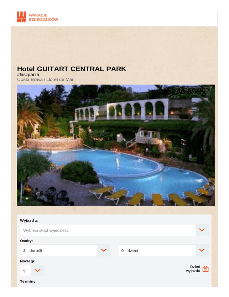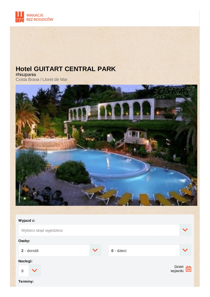 Hotel GUITART CENTRAL PARK #hiszpania Costa Brava / Lloret de Mar Wyjazd z: Wybierz skąd wyjedziesz Osoby: 2 - dorośli 0 - dzieci Noclegi: 9 Terminy: Dzień wyjazdu 13 dni 01.06.2017 - 14.06.2017 Pokój: Pokoj 2 osobowy Wyżywienie: Śniadanie i obiadokolacje Warunki płatności: Cena za 1 osobę: Razem: cena katalogowa 2042 zł 4084 zł Opis oferty Miejscowość Przejazd autokarem PREMIUM Realizacja Wycieczkiimprezy autokarami PREMIUM to gwarancja transportu fakultatywne autokarami z roczników 2015 i 2016 produkcji Irizar i VDL indywidualnego, multimedialnego systemu rozrywki - tablet z dotykowym ekranem w każdym zagłówku (filmy, gry, muzyka itp.). Możliwość podłączenia własnego nośnika danych poprzez wejście AUX lub Opinie USB. najwyższej klasy skórzanych lub półskórzanych foteli z możliwością regulacji oparcia lub/i zagłówka Rozkład jazdy największej w Polsce przestrzeni między siedzeniami małej półki przed każdym siedzeniem + siateczki na czasopisma, książki czy telefon bezpłatnego dostępu do sieci WiFi na terenie Polski* gniazdek elektrycznych 230V wydajnej klimatyzacji sterowanej indywidualnie bogato wyposażonego barku udostępnionego w czasie jazdy WC na pokładzie autokaru Idealna i komfortowa podróż… ZAWSZE! Na ternie Polski GWARANTUJEMY, że wszystkie przejazdy realizowane są autobusem, busem lub samochodem osobowym. Zapewnimy komfortowy transport na każdym etapie podróży. Ważne - Autokar Premium jest autokarem docelowym. *jakość usług internetowych może różnić się w zależności od jakości sygnału Atuty kompleks 5 basenów bezpłatne leżaki i parasole bezpłatne zaplecze sportowo-rekreacyjne wspaniały ogród ze sztucznymi wodospadami i tarasami słonecznymi blisko plaży i centrum Położenie Hotel o standardzie 3* należący do doskonale znanej i rozpoznawalnej na europejskim rynku sieci Hoteli Guitart. Guitart Central Park jest uznawany przez wielu Klientów za najatrakcyjniejszy obiekt hotelowy w Lloret de Mar. Położony zaledwie ok. 400 m od plaży "Fanals" i ok. 400 m. od ścisłego centrum Lloret de Mar gwarantuje łatwy dostęp do wszystkich atrakcji oferowanych przez miejscowość Lloret de Mar. Na terenie hotelu do dyspozycji gości jest aż 5 basenów , z czego 4 są otwarte, a poza sezonem 1 z nich jest podgrzewany i kryty. Otoczenie hotelu to pięknie zagospodarowany teren zielony opływający kwiatami, ozdobnymi krzewami i sztucznymi wodospadami pośród których znajdują się tarasy do kąpieli słonecznych. Bezpłatnie do dyspozycji gości są leżaki i parasole. Bogate zaplecze sportoworekreacyjne w ramach którego bezpłatnie korzystać można z kortów tenisowych, ściany wspinaczkowej, tenisa stołowego. Ponadto za opcjonalną opłatą na miejscu - siłownia, sauna, gabinet masażu, bilard. Ponadto hotel oferuje doskonałą, urozmaiconą kuchnię w formie bufetu oraz bogaty program animacyjny dla swoich gości. Guitart Central Park cieszy się bardzo dobrą opinią Klientów z racji na wykwalifikowaną obsługę, międzynarodową atmosferę, doskonałą lokalizację oraz znakomity stosunek ceny do jakości. Zakwaterowanie Pokoje dwuosobowe z łazienkami z możliwością dostawki. Wszystkie pokoje maja TV, sejf ( za opcjonalną dopłatą na miejscu), telefon, klimatyzację (bezpłatną) oraz balkony lub tarasy. Dostępne opcje zakwaterowania pokój 2 osobowy z możliwością dostawki dokwaterowanie (bez dopłat*) lub pokój 1 osobowy (dopłata) *dokwaterowanie - osoby wybierając się pojedynczo, które w momencie rezerwacji nie dokonują dopłaty do pokoju jednoosobowego, mogą zostać zakwaterowanie z jedną lub kilkoma osobami tej samej płci w tzw. opcji dokwaterowania; jednakże w przypadku braku innej rezerwacji w opcji dokwaterowania w terminie do 7 dni przed rozpoczęciem imprezy wymagana jest dopłata do pokoju 1 osobowego Dostępne opcje wyżywienia śniadania (w cenie) obiadokolacje (opcja) Pakiet KOMFORT gwarancja wyboru miejsca w autokarze napoje w autokarze w cenie (6 x do wyboru - kawa, herbata, zimny napój 0,2l) cena - 50 zł/os Pakiet PRESTIGE gwarancja wyboru miejsca w autokarze napoje w autokarze w cenie (6 x do wyboru - kawa, herbata, zimny napój 0,2l) pierwszeństwo wejścia na pokład autokaru nadbagaż 5 kg w cenie suchy prowiant na drogę powrotną cena - 100 zł/os Karta Dużej Rodziny www.oskar.com.pl/zalaczniki/karta_duzej_rodziny Warunki promocji FIRST MINUTE www.oskar.com.pl/zalaczniki/warunki_promocji Ubezpieczenie Warunki ubezpieczenia Bezpieczne Podróże Signal Iduna dokument do pobrania www.oskar.com.pl/zalaczniki/owu Warunki ubezpieczenia Kosztów Imprezy Turystycznej Signal Iduna dokument do pobrania www.oskar.com.pl/zalaczniki/owurg Turystyczny Fundusz Gwarancyjny W związku z powołaniem do życia w dniu 26.11.2016 Turystycznego Funduszu Gwarancyjnego każdy klient Biura Podróży Oskar zobowiązany jest do zapłaty kwoty w wysokości 10zł/os. przy każdorazowej rezerwacji imprezy turystycznej (obowiązuje od dnia 26.11.2016). Kwota przeznaczona na Turystyczny Fundusz Gwarancyjny zostanie automatycznie doliczona do wartości rezerwacji (w momencie jej dokonania). Wyjątkiem są imprezy turystyczne odbywające się w krajach posiadających granicę z Rzeczpospolitą Polską. Składka nie jest przychodem biura. Udogodnienia Centrum miasta Życie nocne Klimatyzacja Sporty wodne Tenis Sport Animation for adults Basen kryty Basen Fitness / gym Dla rodzin z dziećmi Ośrodek wodny Bez paszportu AGD RTV Wellness Darmowe WiFi Program ramowy Dzień 1 Wyjazd w Polski zgodnie z rozkładem jazdy autokarów. Przejazd przez Niemcy, Francję. Dzień 2 Przyjazd do Lloret de Mar w godzinach okołopołudniowych. Zakwaterowanie od godz. 1400. Dzień 3-10 Pobyt na miejscu. Możliwość korzystania z dodatkowych wycieczek fakultatywnych. Dzień 11 Wykwaterowanie do godziny 10-00. Czas wolny. Wyjazd do Polski w godzinach popołudniowych. Przejazd przez Francję, Niemcy. Dzień 12 Pr