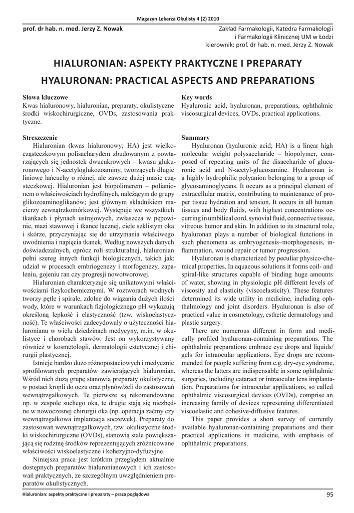 Magazyn Lekarza Okulisty 4 (2) 2010 prof. dr hab. n. med. Jerzy Z. Nowak Zakład Farmakologii, Katedra Farmakologii i Farmakologii Klinicznej UM w Łodzi kierownik: prof. dr hab. n. med. Jerzy Z. Nowak HIALURONIAN: ASPEKTY PRAKTYCZNE I PREPARATY HYALURONAN: PRACTICAL ASPECTS AND PREPARATIONS Słowa kluczowe Key words Kwas hialuronowy, hialuronian, preparaty, okulistyczne Hyaluronic acid, hyaluronan, preparations, ophthalmic środki wiskochirurgiczne, OVDs, zastosowania prak- viscosurgical devices, OVDs, practical applications. tyczne. Streszczenie Hialuronian (kwas hialuronowy; HA) jest wielkocząsteczkowym polisacharydem zbudowanym z powtarzających się jednostek dwucukrowych – kwasu glukuronowego i N-acetyloglukozoaminy, tworzących długie liniowe łańcuchy o różnej, ale zawsze dużej masie cząsteczkowej. Hialuronian jest biopolimerem – polianionem o właściwościach hydrofilnych, należącym do grupy glikozoaminoglikanów; jest głównym składnikiem macierzy zewnątrzkomórkowej. Występuje we wszystkich tkankach i płynach ustrojowych, zwłaszcza w pępowinie, mazi stawowej i tkance łącznej, ciele szklistym oka i skórze, przyczyniając się do utrzymania właściwego uwodnienia i napięcia tkanek. Według nowszych danych doświadczalnych, oprócz roli strukturalnej, hialuronian pełni szereg innych funkcji biologicznych, takich jak: udział w procesach embriogenezy i morfogenezy, zapaleniu, gojeniu ran czy progresji nowotworowej. Hialuronian charakteryzuje się unikatowymi właściwościami fizykochemicznymi. W roztworach wodnych tworzy pętle i spirale, zdolne do wiązania dużych ilości wody, które w warunkach fizjologicznego pH wykazują określoną lepkość i elastyczność (tzw. wiskoelastyczność). Te właściwości zadecydowały o użyteczności hialuronianu w wielu dziedzinach medycyny, m.in. w okulistyce i chorobach stawów. Jest on wykorzystywany również w kosmetologii, dermatologii estetycznej i chirurgii plastycznej. Istnieje bardzo dużo różnopostaciowych i medycznie sprofilowanych preparatów zawierających hialuronian. Wśród nich dużą grupę stanowią preparaty okulistyczne, w postaci kropli do oczu oraz płynów/żeli do zastosowań wewnątrzgałkowych. Te pierwsze są rekomendowane np. w zespole suchego oka, te drugie stają się niezbędne w nowoczesnej chirurgii oka (np. operacja zaćmy czy wewnątrzgałkowa implantacja soczewek). Preparaty do zastosowań wewnątrzgałkowych, tzw. okulistyczne środki wiskochirurgiczne (OVDs), stanowią stale powiększającą się rodzinę środków reprezentujących zróżnicowane właściwości wiskoelastyczne i kohezyjno-dyfuzyjne. Niniejsza praca jest krótkim przeglądem aktualnie dostępnych preparatów hialuronianowych i ich zastosowań praktycznych, ze szczególnym uwzględnieniem preparatów okulistycznych. Hialuronian: aspekty praktyczne i preparaty – praca poglądowa Summary Hyaluronan (hyaluronic acid; HA) is a linear high molecular weight polysaccharide – biopolymer, composed of repeating units of the disaccharide of glucuronic acid and N-acetyl-glucosamine. Hyaluronan is a highly hydrophilic polyanion belonging to a group of glycosaminoglycans. It occurs as a principal element of extracellular matrix, contributing to maintenance of proper tissue hydration and tension. It occurs in all human tissues and body fluids, with highest concentrations occurring in umbilical cord, synovial fluid, connective tissue, vitreous humor and skin. In addition to its structural role, hyaluronan plays a number of biological functions in such phenomena as embryogenesis–morphogenesis, inflammation, wound repair or tumor progression. Hyaluronan is characterized by peculiar physico-chemical properties. In aquaeous solutions it forms coil- and spiral-like structures capable of binding huge amounts of water, showing in physiologic pH different levels of viscosity and elasticity (viscoelasticity). These features determined its wide utility in medicine, including ophthalmology and joint disorders. Hyaluronan is also of practical value in cosmetology, esthetic dermatology and plastic surgery. There are numerous different in form and medically profiled hyaluronan-containing preparations. The ophthalmic preparations embrace eye drops and liquids/ gels for intraocular applications. Eye drops are recommended for people suffering from e.g. dry-eye syndrome, whereas the latters are indispensable in some ophthalmic surgeries, including cataract or intraocular lens implantation. Preparations for intraocular applications, so called ophthalmic viscosurgical devices (OVDs), comprise an increasing family of devices representing differentiated viscoelastic and cohesive-diffusive features. This paper provides a short survey of currently available hyaluronan-containing preparations and their practical applications in medicine, with emphasis of ophthalmic preparations. 95
