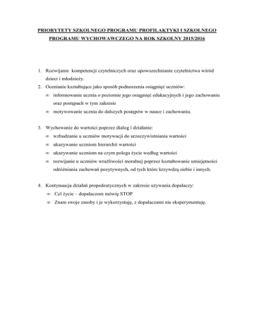 PRIORYTETY SZKOLNEGO PROGRAMU PROFILAKTYKI I SZKOLNEGO PROGRAMU WYCHOWAWCZEGO NA ROK SZKOLNY 2015/2016 1. Rozwijanie kompetencji czytelniczych oraz upowszechnianie czytelnictwa wśród dzieci i młodzieży. 2. Ocenianie kształtujące jako sposób podnoszenia osiągnięć uczniów: • informowanie ucznia o poziomie jego osiągnięć edukacyjnych i jego zachowaniu oraz postępach w tym zakresie • motywowanie ucznia do dalszych postępów w nauce i zachowaniu. 3. Wychowanie do wartości poprzez dialog i działanie: • wzbudzanie u uczniów motywacji do urzeczywistniania wartości • ukazywanie uczniom hierarchii wartości • ukazywanie uczniom na czym polega życie według wartości • rozwijanie u uczniów wrażliwości moralnej poprzez kształtowanie umiejętności odróżniania zachowań pozytywnych, od tych które krzywdzą siebie i innych. 4. Kontynuacja działań propedeutycznych w zakresie używania dopalaczy: • Cel życie – dopalaczom mówię STOP • Znam swoje zasoby i je wykorzystuję, z dopalaczami nie eksperymentuję.