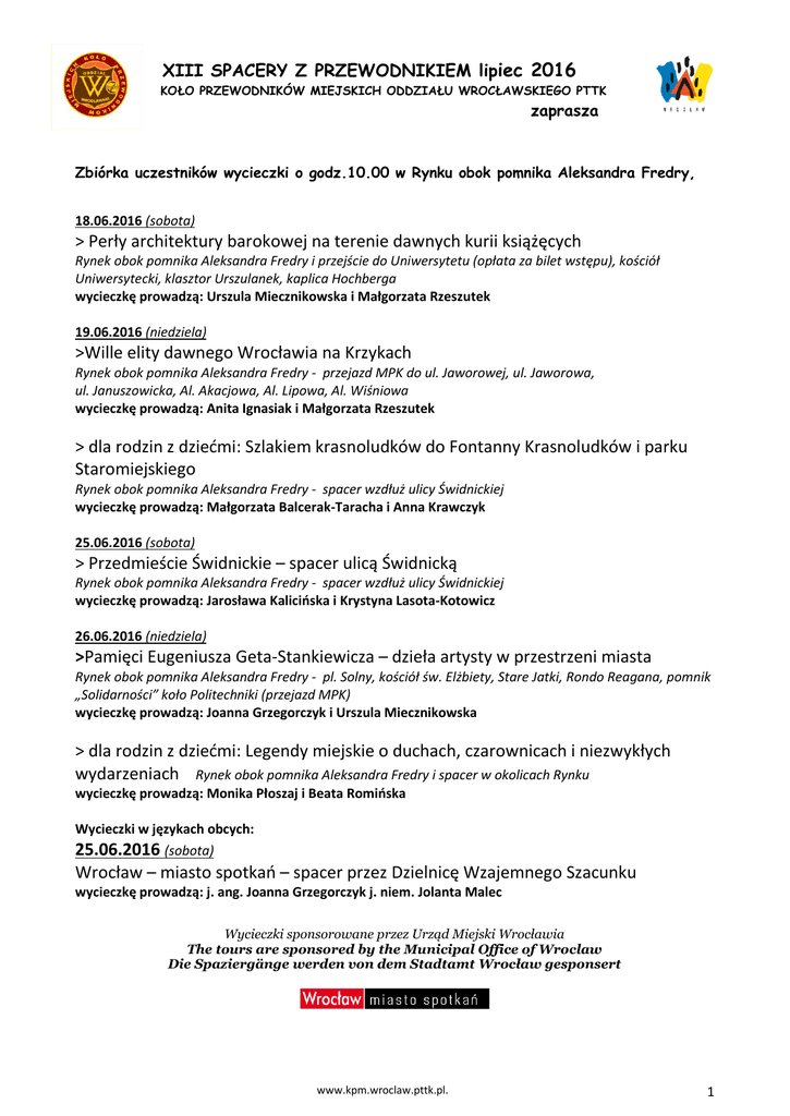 XIII SPACERY Z PRZEWODNIKIEM lipiec 2016 KOŁO PRZEWODNIKÓW MIEJSKICH ODDZIAŁU WROCŁAWSKIEGO PTTK zaprasza Zbiórka uczestników wycieczki o godz.10.00 w Rynku obok pomnika Aleksandra Fredry, 18.06.2016 (sobota) > Perły architektury barokowej na terenie dawnych kurii książęcych Rynek obok pomnika Aleksandra Fredry i przejście do Uniwersytetu (opłata za bilet wstępu), kościół Uniwersytecki, klasztor Urszulanek, kaplica Hochberga wycieczkę prowadzą: Urszula Miecznikowska i Małgorzata Rzeszutek 19.06.2016 (niedziela) >Wille elity dawnego Wrocławia na Krzykach Rynek obok pomnika Aleksandra Fredry - przejazd MPK do ul. Jaworowej, ul. Jaworowa, ul. Januszowicka, Al. Akacjowa, Al. Lipowa, Al. Wiśniowa wycieczkę prowadzą: Anita Ignasiak i Małgorzata Rzeszutek > dla rodzin z dziećmi: Szlakiem krasnoludków do Fontanny Krasnoludków i parku Staromiejskiego Rynek obok pomnika Aleksandra Fredry - spacer wzdłuż ulicy Świdnickiej wycieczkę prowadzą: Małgorzata Balcerak-Taracha i Anna Krawczyk 25.06.2016 (sobota) > Przedmieście Świdnickie – spacer ulicą Świdnicką Rynek obok pomnika Aleksandra Fredry - spacer wzdłuż ulicy Świdnickiej wycieczkę prowadzą: Jarosława Kalicińska i Krystyna Lasota-Kotowicz 26.06.2016 (niedziela) >Pamięci Eugeniusza Geta-Stankiewicza – dzieła artysty w przestrzeni miasta Rynek obok pomnika Aleksandra Fredry - pl. Solny, kościół św. Elżbiety, Stare Jatki, Rondo Reagana, pomnik „Solidarności” koło Politechniki (przejazd MPK) wycieczkę prowadzą: Joanna Grzegorczyk i Urszula Miecznikowska > dla rodzin z dziećmi: Legendy miejskie o duchach, czarownicach i niezwykłych wydarzeniach Rynek obok pomnika Aleksandra Fredry i spacer w okolicach Rynku wycieczkę prowadzą: Monika Płoszaj i Beata Romińska Wycieczki w językach obcych: 25.06.2016 (sobota) Wrocław – miasto spotkań – spacer przez Dzielnicę Wzajemnego Szacunku wycieczkę prowadzą: j. ang. Joanna Grzegorczyk j. niem. Jolanta Malec Wycieczki sponsorowane przez Urząd Miejski Wrocławia The tours are sponsored by the Municipal Office of Wroclaw Die Spaziergänge werden von dem Stadtamt Wrocław gesponsert www.kpm.wroclaw.pttk.pl. 1
