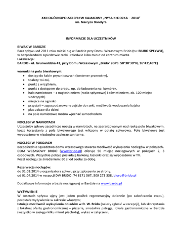 XXII OGÓLNOPOLSKI SPŁYW KAJAKOWY „NYSA KŁODZKA – 2014” im. Narcyza Bondyra INFORMACJE DLA UCZESTNIKÓW BIWAK W BARDZIE Baza spływu od 2011 roku mieści się w Bardzie przy Domu Wczasowym Brido (tu: BIURO SPŁYWU), w bezpośrednim sąsiedztwie rzeki i zaledwie kilka minut od centrum miasta Lokalizacja: BARDO - ul. Grunwaldzka 41, przy Domu Wczasowym „Brido” (GPS: 50°30’38”N, 16°43’,48”E) warunki na polu biwakowym: dostęp do kabin prysznicowych (kontener przenośny), toalety toi-toi, punkt z wrzątkiem, punkt z dostępem do prądu, np. do ładowania np. komórek, hala namiotowa – z nagłośnieniem (radio spływowe) i oświetleniem, ok. 120 miejsc siedzących) miejsce na ognisko przystań – zagospodarowane zejście do rzeki, możliwość wodowania kajaka plac zabaw dla dzieci na pole namiotowe można wjechać samochodem NOCLEGI W NAMIOTACH Uczestnicy spływu zasadniczo nocują w namiotach, na zaaranżowanym nad rzeką polu biwakowym, koszt korzystania z pola biwakowego jest wliczony w opłatę spływową. Pole biwakowe jest wyposażone w niezbędne zaplecze sanitarne. NOCLEGI W POKOJACH Bezpośrednie sąsiedztwo domu wczasowego stwarza możliwość wykupienia noclegów w pokojach. DOM WCZASOWY BRIDO (www.brido.pl) oferuje 50 miejsc noclegowych w pokojach 2, 3 osobowych. Wszystkie pokoje posiadają balkony, łazienki oraz są wyposażone w TV. Koszt noclegu ze śniadaniem: 60 zł od osoby za dobę. Rezerwacja noclegów: do 31.03.2014 u organizatora spływu przy zgłoszeniu ze strony. od 01.04.2014 w recepcji DW BRIDO: 74 8171 567, 509 273 338, [email protected] Dodatkowe informacje o bazie noclegowej w Bardzie na www.bardo.pl WYŻYWIENIE W kosztach spływu ujęty jest jeden posiłek regeneracyjny dziennie (po zakończeniu etapu), pozostałe wyżywienie w zakresie własnym; Istnieje możliwość wykupienia obiadów w D. W. Brido (należy zgłosić w recepcji), lub skorzystania z lokalnej oferty gastronomicznej – pizzeria, smażalnia pstrąga, lokale gastronomiczne w Bardzie (wszystko w zasięgu kilku minut piechotą), wykaz w załączeniu dojazd Samochodem: zjazd do Barda z drogi krajowej nr 8 relacji Wrocław – Kudowa Pociągiem: dojazd do stacji PKP „Bardo Śląskie”, dojście do biwaku piechotą (kilka minut) Autobusem/ busem: przystanki mieszczą się na ul. Głównej i na placu Kasztelańskim, dojście do biwaku piechotą (kilka minut) - do Barda dojeżdżają autobusy PKS i lokalne busy z Ząbkowic Śląskich (dworzec PKP) i Kłodzka (PKP, PKS) BIURO SPŁYWU – Dom Wczasowy Brido, ul. Grunwaldzka 41 od 30.04.2013 (wtorek), od godz. 17.00 - do 04.05.2013 (sobota), do godz.12.00 Dom Wczasowy Brido BARDO - ul. Grunwaldzka 41, GPS: 50°30’38”N, 16°43’,48”E, www.brido.pl - oferuje łącznie 50 miejsc noclegowych w pokojach 2 – 3 osobowych, z łazienkami, balkonami, TV i Wi-Fi (rezerwacja za pośrednictwem organizatora spływu), - prowadzi własną kuchnię i stołówkę, co stwarza możliwość wykupienia obiadów (informacja w recepcji, tel. 74/ 817 15 67) - recepcja domu wczasowego prowadzi sprzedaż napojów ciepłych i zimnych (min.: piwo Opat), lodów i innych drobnych smakołyków - oferuje możliwość wykupienia spływu pontonowego (wraz z transportem w górę rzeki), pontony max. 6-cio osobowe (informacja w recepcji tel. 74/ 817 15 67) BARDO – Miasto cudów: Bardo jest niewielkim (2,5 tys. mieszkańców) uroczym miasteczkiem, zlokalizowanym bezpośrednio w przełomie Nysy Kłodzkiej. Charakterystyczne atrakcje to zabytkowy kamienny most, widoczny z drogi krajowej nr 8, górująca nad miastem Bazylika i biały krzyż na skalnym urwisku, gdzie znajduje się punkt widokowy ze wspaniałym widokiem na miasto i przełom rzeki. Życie miasteczka skupia się przy ulicy Głównej, gdzie mieści się większość sklepów i lokali gastronomicznych. Miejsca, które należy koniecznie odwiedzić to pocysterska Bazylika z XII wieczną cudowną figurką Matki Bożej Bardzkiej – Strażniczki Wiary Świętej (szopka i muzeum), Obryw Skalny z punktem widokowym i białym krzyżem (ok. 40 min. wędrówki w jedną stronę), Wzgórze Różańcowe z kaplicami formie małych kościółków w różnorodnych stylach architektonicznych. www.bardo.pl *Zabytki Barda wytyczają bieg dwóch miejskich Tras Turystycznych: „Kalwaria” i „Wzgórze Różańcowe” –w punkcie informacji turystycznej (pl. Wolności 4) można wypożyczyć audioprzewodnik, dodatkowo pobierz mapkę i zwiedzaj trasy słuchając komentarza! PRZEŁOM BARDZKI – to miejsce, gdzie Nysa Kłodzka kilkoma szerokimi meandrami przebija się przez Góry Bardzkie, tworząc tzw. przełom antecedentny – jego unikatowość wynika z faktu, że sama rzeka jest starsza niż otaczające ją góry. Płynąca rzeka wcinała się w zbocza wypiętrzających się gór tworząc przełomy o głębokości 150 metrów. W okresie zlodowacenia skandynawskiego lądolód przedostał się przez Przełom Bardzki w Kotlinę Kłodzką, a po jego ustąpieniu woda ponownie wyżłobiła sobie koryto nadając mu obecny wygląd. Spływ Przełomem Bardzkim (ok. 14 km) jest niezapomnianą wędrówką wśród malowniczych wzniesień Gór Bardzkich, łąk, lasów i pionowo opadających do rzeki skał. Ze względu na swój urok i historię powstania Przełom Bardzki jest nazywany cudem Sudetów. Punkt informacji turystycznej - pl. Wolności 4 Gastronomia Pizzeria VERONA – ul. Główna Smażalnia pstrąga i nie tylko – przystań pontonowa SKI-RAFT, ul. Skalna Zajazd pod Złotym Gryfem (też pizza) – ul. Główna 23 Karczma Missoni – Opolnica 51, przy drodze krajowej nr 8 (kierunek Kłodzko) Bankomat Banku Spółdzielczego – pl. Wolności 4 i Rynek 2 Apteka - ul. Główna 26, Apteka Melisa – ul. Główna 24 Piekarnia i sklepik firmowy – ul. Noworudzka Pracownia rzeźbiarska JANDANA – przy ul. Kolejowej, pracownia pełna aniołów… oferuje oryginalne rzeźby i pamiątki z Barda baza sportowo-rekreacyjna: w 
