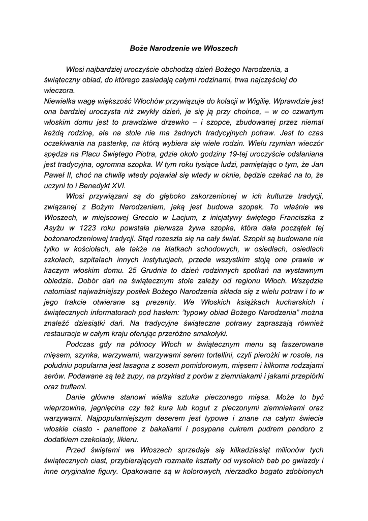 Boże Narodzenie we Włoszech Włosi najbardziej uroczyście obchodzą dzień Bożego Narodzenia, a świąteczny obiad, do którego zasiadają całymi rodzinami, trwa najczęściej do wieczora. Niewielka wagę większość Włochów przywiązuje do kolacji w Wigilię. Wprawdzie jest ona bardziej uroczysta niż zwykły dzień, je się ją przy choince, – w co czwartym włoskim domu jest to prawdziwe drzewko – i szopce, zbudowanej przez niemal każdą rodzinę, ale na stole nie ma żadnych tradycyjnych potraw. Jest to czas oczekiwania na pasterkę, na którą wybiera się wiele rodzin. Wielu rzymian wieczór spędza na Placu Świętego Piotra, gdzie około godziny 19-tej uroczyście odsłaniana jest tradycyjna, ogromna szopka. W tym roku tysiące ludzi, pamiętając o tym, że Jan Paweł II, choć na chwilę wtedy pojawiał się wtedy w oknie, będzie czekać na to, że uczyni to i Benedykt XVI. Włosi przywiązani są do głęboko zakorzenionej w ich kulturze tradycji, związanej z Bożym Narodzeniem, jaką jest budowa szopek. To właśnie we Włoszech, w miejscowej Greccio w Lacjum, z inicjatywy świętego Franciszka z Asyżu w 1223 roku powstała pierwsza żywa szopka, która dała początek tej bożonarodzeniowej tradycji. Stąd rozeszła się na cały świat. Szopki są budowane nie tylko w kościołach, ale także na klatkach schodowych, w osiedlach, osiedlach szkołach, szpitalach innych instytucjach, przede wszystkim stoją one prawie w kaczym włoskim domu. 25 Grudnia to dzień rodzinnych spotkań na wystawnym obiedzie. Dobór dań na świątecznym stole zależy od regionu Włoch. Wszędzie natomiast najważniejszy posiłek Bożego Narodzenia składa się z wielu potraw i to w jego trakcie otwierane są prezenty. We Włoskich książkach kucharskich i świątecznych informatorach pod hasłem: ”typowy obiad Bożego Narodzenia” można znaleźć dziesiątki dań. Na tradycyjne świąteczne potrawy zapraszają również restauracje w całym kraju oferując przeróżne smakołyki. Podczas gdy na północy Włoch w świątecznym menu są faszerowane mięsem, szynka, warzywami, warzywami serem tortellini, czyli pierożki w rosole, na południu popularna jest lasagna z sosem pomidorowym, mięsem i kilkoma rodzajami serów. Podawane są też zupy, na przykład z porów z ziemniakami i jakami przepiórki oraz truflami. Danie główne stanowi wielka sztuka pieczonego mięsa. Może to być wieprzowina, jagnięcina czy też kura lub kogut z pieczonymi ziemniakami oraz warzywami. Najpopularniejszym deserem jest typowe i znane na całym świecie włoskie ciasto - panettone z bakaliami i posypane cukrem pudrem pandoro z dodatkiem czekolady, likieru. Przed świętami we Włoszech sprzedaje się kilkadziesiąt milionów tych świątecznych ciast, przybierających rozmaite kształty od wysokich bab po gwiazdy i inne oryginalne figury. Opakowane są w kolorowych, nierzadko bogato zdobionych pudłach. To również typowy prezent, jaki dostają Włosi od swych pracodawców przed Bożym Narodzeniem. Na stole pojawia się wiele innych deserów, między innymi tort ryżowy, a także bardzo popularne nugaty o wielu smakach z orzechami. Włosi mają swój odpowiednik piernika - pan speziale, ciasto z miodem i bakaliami. 26 grudnia, we włoskim kalendarzu nazwany San Stefano, to drugi świąteczny dzień, który wypełniają rodzinne spotkania. Dla dzieci święta trwają aż do 6 stycznia czyli do święta Trzech Króli. Tego dnia znów otrzymują prezenty, a zgodnie z tradycją przynosi je Befana czyli czarownica na miotle. Karol Dudziak, klasa 3 g