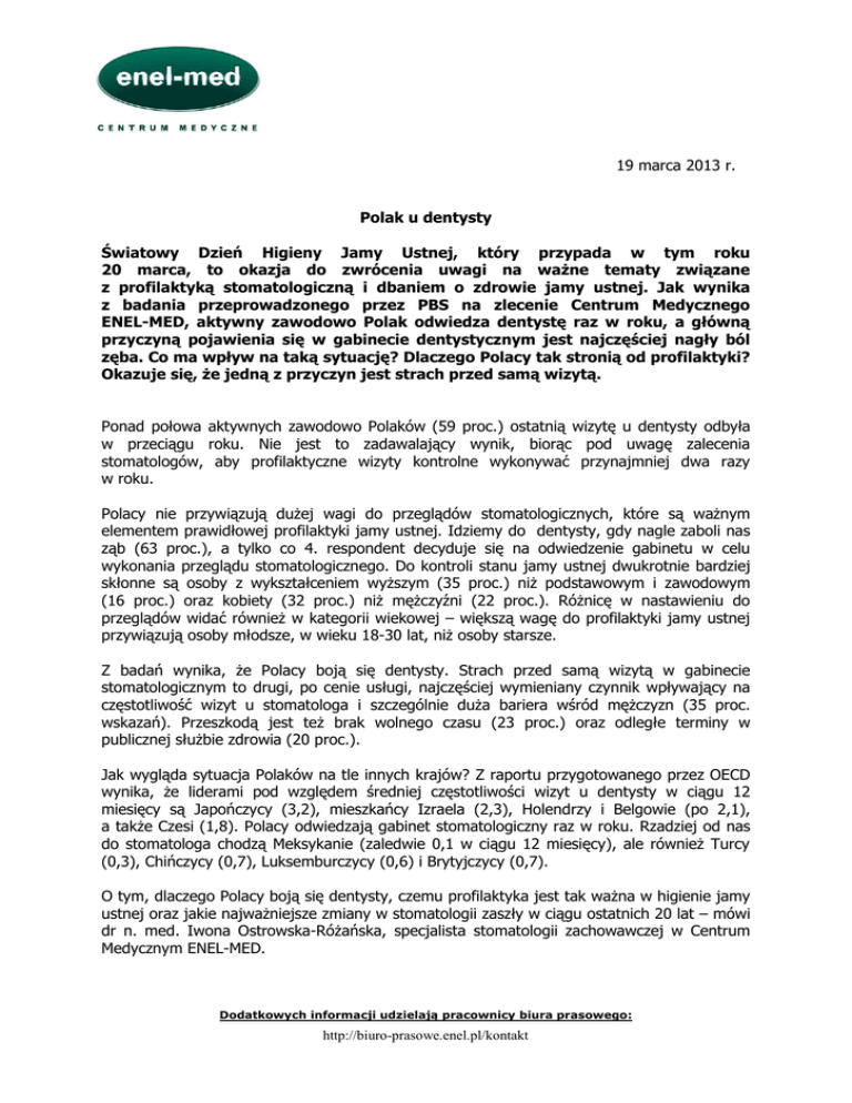 19 marca 2013 r. Polak u dentysty Światowy Dzień Higieny Jamy Ustnej, który przypada w tym roku 20 marca, to okazja do zwrócenia uwagi na ważne tematy związane z profilaktyką stomatologiczną i dbaniem o zdrowie jamy ustnej. Jak wynika z badania przeprowadzonego przez PBS na zlecenie Centrum Medycznego ENEL-MED, aktywny zawodowo Polak odwiedza dentystę raz w roku, a główną przyczyną pojawienia się w gabinecie dentystycznym jest najczęściej nagły ból zęba. Co ma wpływ na taką sytuację? Dlaczego Polacy tak stronią od profilaktyki? Okazuje się, że jedną z przyczyn jest strach przed samą wizytą. Ponad połowa aktywnych zawodowo Polaków (59 proc.) ostatnią wizytę u dentysty odbyła w przeciągu roku. Nie jest to zadawalający wynik, biorąc pod uwagę zalecenia stomatologów, aby profilaktyczne wizyty kontrolne wykonywać przynajmniej dwa razy w roku. Polacy nie przywiązują dużej wagi do przeglądów stomatologicznych, które są ważnym elementem prawidłowej profilaktyki jamy ustnej. Idziemy do dentysty, gdy nagle zaboli nas ząb (63 proc.), a tylko co 4. respondent decyduje się na odwiedzenie gabinetu w celu wykonania przeglądu stomatologicznego. Do kontroli stanu jamy ustnej dwukrotnie bardziej skłonne są osoby z wykształceniem wyższym (35 proc.) niż podstawowym i zawodowym (16 proc.) oraz kobiety (32 proc.) niż mężczyźni (22 proc.). Różnicę w nastawieniu do przeglądów widać również w kategorii wiekowej – większą wagę do profilaktyki jamy ustnej przywiązują osoby młodsze, w wieku 18-30 lat, niż osoby starsze. Z badań wynika, że Polacy boją się dentysty. Strach przed samą wizytą w gabinecie stomatologicznym to drugi, po cenie usługi, najczęściej wymieniany czynnik wpływający na częstotliwość wizyt u stomatologa i szczególnie duża bariera wśród mężczyzn (35 proc. wskazań). Przeszkodą jest też brak wolnego czasu (23 proc.) oraz odległe terminy w publicznej służbie zdrowia (20 proc.). Jak wygląda sytuacja Polaków na tle innych krajów? Z raportu przygotowanego przez OECD wynika, że liderami pod względem średniej częstotliwości wizyt u dentysty w ciągu 12 miesięcy są Japończycy (3,2), mieszkańcy Izraela (2,3), Holendrzy i Belgowie (po 2,1), a także Czesi (1,8). Polacy odwiedzają gabinet stomatologiczny raz w roku. Rzadziej od nas do stomatologa chodzą Meksykanie (zaledwie 0,1 w ciągu 12 miesięcy), ale również Turcy (0,3), Chińczycy (0,7), Luksemburczycy (0,6) i Brytyjczycy (0,7). O tym, dlaczego Polacy boją się dentysty, czemu profilaktyka jest tak ważna w higienie jamy ustnej oraz jakie najważniejsze zmiany w stomatologii zaszły w ciągu ostatnich 20 lat – mówi dr n. med. Iwona Ostrowska-Różańska, specjalista stomatologii zachowawczej w Centrum Medycznym ENEL-MED. Dodatkowych informacji udzielają pracownicy biura prasowego: http://biuro-prasowe.enel.pl/kontakt Jak wynika z badań Polacy boją się dentysty. Z czego mogą wynikać obawy Polaków przed wizytą w gabinecie stomatologicznym i czy jest się czego bać? Obiegowa opinia, że wizyta u stomatologa wiąże się z bólem, jest reliktem przeszłości. Niestety u wielu osób jest utrwalana przez doświadczenia np. starszych członków rodziny. Nośnikiem takich opinii są zazwyczaj osoby, które w gabinecie dentystycznym pojawiały się jedynie z powodu dolegliwości bólowych. Należy zatem podejrzewać, że zmiany chorobowe, które sprowadziły ich do gabinetu, były bardzo zaawansowane. W połączeniu ze sporadycznym w przeszłości używaniem środków znieczulających, musiało być to źródłem wielu przykrych doświadczeń. Negatywne opinie są również kształtowane przez rodziców przyprowadzających własne pociechy, nie mających własnych przykrych doświadczeń. Powszechnie używanym zwrotem jest: „Nie bój się, nic nie będzie bolało…” Trudno się dziwić, że w małym człowieku natychmiast rodzą się wątpliwości. Dlaczego profilaktyka stomatologiczna jest tak ważna w higienie jamy ustnej i co się na nią składa? Profilaktyka, czyli zapobieganie, jest jednym z najważniejszych sposobów dbałości o własne zdrowie. Tego niestety nie szanujemy. O wiele łatwiej jest przekonać statystycznego Polaka do przeglądu własnego samochodu niż do badań profilaktycznych. Profilaktyka to zarówno i przede wszystkim działania codzienne – które zależą od nas i zabierają naprawdę niewiele czasu, jak również działania pomocnicze, w tym wizyty kontrolne u stomatologa dwa razy do roku. Dlaczego akurat taka częstotliwość? Statystyki mówią, że tylko wtedy jesteśmy w stanie skutecznie zapobiegać konsekwencjom działania próchnicy. Lekarz w dobrym oświetleniu jest w stanie wychwycić pierwsze zmiany próchnicowe, interweniować (łatwo i szybko wyleczyć), poinstruować, w jaki sposób powinniśmy dbać o uzębienie, aby takich sytuacji uniknąć. Należy pamiętać, że wizyta u lekarza powinna być poprzedzona zabiegiem profesjonalnego usuwania osadów nazębnych zakończonego fluoryzacją, o ile lekarz nie zaleci inaczej. Profilaktyka, to pojęcie znacznie szersze niż działanie przeciwpróchnicowe. Nie lekceważmy zaleceń lekarza dotyczących konieczności leczenia wad zgryzu, uzupełniania braków zębowych. Konsekwencje takich zaniedbań są bardzo przykre i prowadzą do wielu przewlekłych dolegliwości, których leczenie jest długie i bardziej kosztowne. Bardzo istotne jest również profilaktyczne badanie błony śluzowej jamy ustnej. Niewielu pacjentów jest świadomych, jak mała jest wykrywalność nowotworów wywodzących się z tkanek jamy ustnej. Przyczyna jest prosta – nie badasz się, nie jesteś zdiagnozowany na czas. Efektem jest niewielki procent wyleczeń. Na co powinniśmy zwracać szczególną uwagę w ramach profilaktyki jamy ustnej na co dzień? Odpowiedź brzmi: na wszystko, gdyż nasze działania mają równorzędne znaczenie. Ważne jest zarówno oczyszcza