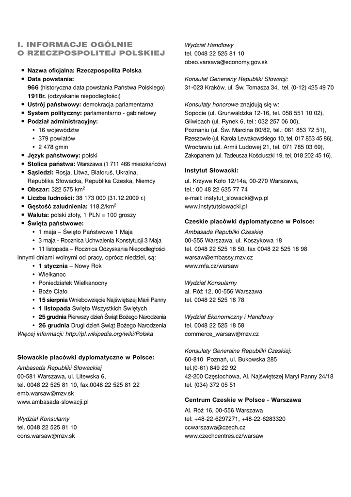 I. INFORMACJE OGÓLNIE O RZECZPOSPOLITEJ POLSKIEJ Wydział Handlowy tel. 0048 22 525 81 10 [email protected] n Nazwa oficjalna: Rzeczpospolita Polska Data powstania: 966 (historyczna data powstania Państwa Polskiego) 1918r. (odzyskanie niepodległości) n Ustrój państwowy: demokracja parlamentarna n System polityczny: parlamentarno - gabinetowy n Podział administracyjny: • 16 województw • 379 powiatów • 2 478 gmin n Język państwowy: polski n Stolica państwa: Warszawa (1 711 466 mieszkańców) n Sąsiedzi: Rosja, Litwa, Białoruś, Ukraina, Republika Słowacka, Republika Czeska, Niemcy n Obszar: 322 575 km2 n Liczba ludności: 38 173 000 (31.12.2009 r.) n Gęstość zaludnienia: 118,2/km2 n Waluta: polski złoty, 1 PLN = 100 groszy n Święta państwowe: • 1 maja – Święto Państwowe 1 Maja • 3 maja - Rocznica Uchwalenia Konstytucji 3 Maja • 11 listopada – Rocznica Odzyskania Niepodległości Innymi dniami wolnymi od pracy, oprócz niedziel, są: • 1 stycznia – Nowy Rok • Wielkanoc • Poniedziałek Wielkanocny • Boże Ciało • 15 sierpnia Wniebowzięcie Najświętszej Marii Panny • 1 listopada Święto Wszystkich Świętych • 25 grudnia Pierwszy dzień Świąt Bożego Narodzenia • 26 grudnia Drugi dzień Świąt Bożego Narodzenia Więcej informacji: http://pl.wikipedia.org/wiki/Polska n Słowackie placówki dyplomatyczne w Polsce: Ambasada Republiki Słowackiej 00-581 Warszawa, ul. Litewska 6, tel. 0048 22 525 81 10, fax.0048 22 525 81 22 [email protected] www.ambasada-slowacji.pl Wydział Konsularny tel. 0048 22 525 81 10 [email protected] Konsulat Generalny Republiki Słowacji: 31-023 Kraków, ul. Św. Tomasza 34, tel. (0-12) 425 49 70 Konsulaty honorowe znajdują się w: Sopocie (ul. Grunwaldzka 12-16, tel. 058 551 10 02), Gliwicach (ul. Rynek 6, tel.: 032 257 06 00), Poznaniu (ul. Św. Marcina 80/82, tel.: 061 853 72 51), Rzeszowie (ul. Karola Lewakowskiego 10, tel. 017 853 45 86), Wrocławiu (ul. Armii Ludowej 21, tel. 071 785 03 69), Zakopanem (ul. Tadeusza Kościuszki 19, tel. 018 202 45 16). Instytut Słowacki: ul. Krzywe Koło 12/14a, 00-270 Warszawa, tel.: 00 48 22 635 77 74 e-mail: [email protected] www.instytutslowacki.pl Czeskie placówki dyplomatyczne w Polsce: Ambasada Republiki Czeskiej 00-555 Warszawa, ul. Koszykowa 18 tel. 0048 22 525 18 50, fax 0048 22 525 18 98 [email protected] www.mfa.cz/warsaw Wydział Konsularny al. Róż 12, 00-556 Warszawa tel. 0048 22 525 18 78 Wydział Ekonomiczny i Handlowy tel. 0048 22 525 18 58 [email protected] Konsulaty Generalne Republiki Czeskiej: 60-810 Poznań, ul. Bukowska 285 tel.(0-61) 849 22 92 42-200 Częstochowa, Al. Najświętszej Maryi Panny 24/18 tel. (034) 372 05 51 Centrum Czeskie w Polsce - Warszawa Al. Róż 16, 00-556 Warszawa tel: +48-22-6297271, +48-22-6283320 [email protected] www.czechcentres.cz/warsaw Polskie placówki dyplomatyczne w Czechach i na Słowacji: Ambasada Rzeczpospolitej Polskiej w Czechach: 118 00 Praga, Valdštejnska, Tel.: 00420 257 099 500, 00420 257 099 500 [email protected] http://www.prague.polemb.net Obszar Polska Województwo Śląskie Ambasada Rzeczpospolitej Polskiej na Słowacji: 814 91 Bratysława, Hummelova 4, Tel.: 00 421 2 59490211, 00 421 2 59490211 [email protected] http://www.bratyslawa.polemb.net/ II. CHARAKTERYSTYKA REGIONU EURES – T BESKYDY EURES-T Beskydy po stronie polskiej obejmuje cześć województwa śląskiego i część województwa opolskiego. Województwo śląskie zajmuje powierzchnię 12 334 km2 (w tym obszar wchodzący w skład partnerstwa, czyli 3 146,91 km2), co stanowi 3,9% powierzchni Polski. Łączna długość granic województwa wynosi 957 km, z czego południową granicę stanowi granica państwa z Republiką Czeską o długości 141 km i Republiką Słowacką o długości 85 km. Pod względem administracyjnym województwo śląskie dzieli się na 36 powiatów, w tym 19 powiatów grodzkich (miast na prawach powiatów) i 17 powiatów ziemskich. Partnerstwo EURES-T Beskydy obejmuje swoim zasięgiem następujące powiaty: cieszyński, bielski, żywiecki, wodzisławski, raciborski oraz miasta Bielsko – Biała i Jastrzębie Zdrój. W Województwie śląskim wg stanu na 31 grudnia 2008 r. mieszkało 4,65 mln osób, co stanowiło 12,18% ludności kraju (w tym 835 980 osób na obszarze objętym Partnerstwem). Województwo śląskie jest drugim najludniejszym (po województwie mazowieckim) województwem w Polsce. Województwo opolskie jest położone w południowozachodnim regionie Polski i graniczy z Czechami. 38 173 000 4 654 115 Powiat i miasto Bielsko-Biała 153 987 Cieszyn 172 027 Jastrzębie Zdrój Konsulat Generalny Rzeczypospolitej Polskiej w Ostrawie Ostrawa, Blahoslavova 4, 701 00 Tel.: 00420596118074 [email protected] www.ostrawakg.polemb.net Stan na 31.12.2008 r. 93 455 Racibórz 110 591 Wodzisław Śląski 155 566 Żywiec 150 354 Województwo Opolskie Głubczyce Nysa Prudnik 1 044 000 49 580 146 606 60 430 Obejmuje obszar 9 412 km2 (3% powierzchni kraju), który zamieszkuje około 1 044 000 osób (co stanowi około 2,7 % ludności kraju). Region objęty Partnerstwem obejmuje 2 468,13 km2 i jest zamieszkany przez 256 616 osób. Województwa śląskie i opolskie znajdują się w grupie województw o najgorszej sytuacji demograficzną w Polsce: przyrost naturalny w śląskim wyniósł w 2008 r. (– 0,2), w opolskim (– 0,6), podczas gdy średnia krajowa w wyniosła 0,9. W województwach śląskim i opolskim mieszka ponad 70% ogółu ludności niepolskiej w kraju. Według danych ze spisu powszechnego w 2001 r. w województwie śląskim żyje 20 tys. Niemców (głównie w pow. raciborskim, gliwickim w większych miastach) oraz wielu przedstawicieli innych narodowości (Francuzi, Amerykanie, Ukraińcy, jedyna w Polsce mniejszość czeska i morawska itd.). Corocznie do województwa emigruje ponad 2 tys. obcokrajowców, natomiast z innych województw napływa blisko 50 tys. osób rocznie (trzecie miejsce w kraju). Na