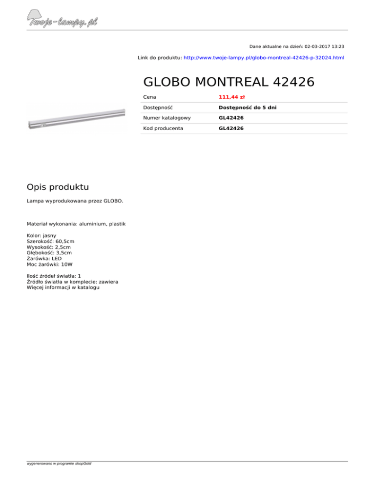 Dane aktualne na dzień: 02-03-2017 13:23 Link do produktu: http://www.twoje-lampy.pl/globo-montreal-42426-p-32024.html GLOBO MONTREAL 42426 Opis produktu Lampa wyprodukowana przez GLOBO. Materiał wykonania: aluminium, plastik Kolor: jasny Szerokość: 60,5cm Wysokość: 2,5cm Głębokość: 3,5cm Żarówka: LED Moc żarówki: 10W Ilość źródeł światła: 1 Źródło światła w komplecie: zawiera Więcej informacji w katalogu wygenerowano w programie shopGold Powered by TCPDF (www.tcpdf.org) Cena 111,44 zł Dostępność Dostępność do 5 dni Numer katalogowy GL42426 Kod producenta GL42426