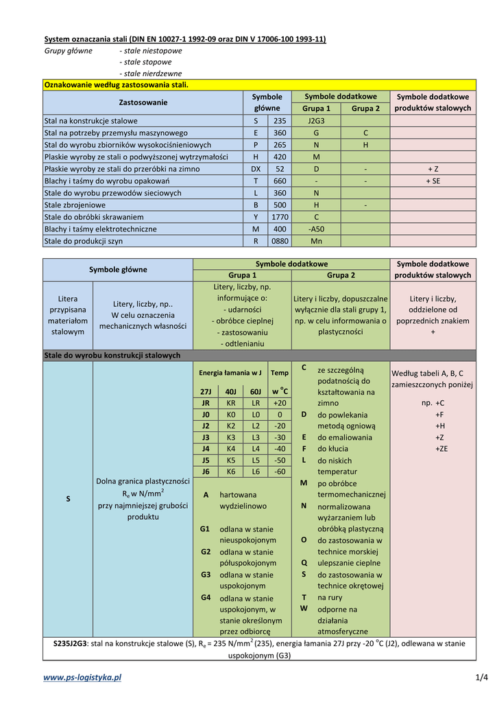 System oznaczania stali (DIN EN 10027-1 1992-09 oraz DIN V 17006-100 1993-11) Grupy główne - stale niestopowe - stale stopowe - stale nierdzewne Oznakowanie według zastosowania stali. Symbole dodatkowe Symbole Zastosowanie główne Grupa 1 Grupa 2 Stal na konstrukcje stalowe Stal na potrzeby przemysłu maszynowego Stal do wyrobu zbiorników wysokociśnieniowych Plaskie wyroby ze stali o podwyższonej wytrzymałości Płaskie wyroby ze stali do przeróbki na zimno Blachy i taśmy do wyrobu opakowań Stale do wyrobu przewodów sieciowych Stale zbrojeniowe Stale do obróbki skrawaniem Blachy i taśmy elektrotechniczne Stale do produkcji szyn Symbole główne Litera przypisana materiałom stalowym Litery, liczby, np.. W celu oznaczenia mechanicznych własności S E P H DX T L B Y M R 235 360 265 420 52 660 360 500 1770 400 0880 J2G3 G N M D N H C -A50 Mn Symbole dodatkowe produktów stalowych C H - +Z + SE - Symbole dodatkowe Symbole dodatkowe produktów stalowych Grupa 1 Grupa 2 Litery, liczby, np. informujące o: Litery i liczby, dopuszczalne Litery i liczby, - udarności wyłącznie dla stali grupy 1, oddzielone od np. w celu informowania o poprzednich znakiem - obróbce cieplnej plastyczności + - zastosowaniu - odtlenianiu Stale do wyrobu konstrukcji stalowych C ze szczególną Według tabeli A, B, C podatnością do zamieszczonych poniżej o 27J 40J 60J w C kształtowania na np. +C JR KR LR +20 zimno D do powlekania J0 K0 L0 0 +F J2 K2 L2 -20 metodą ogniową +H E do emaliowania J3 K3 L3 -30 +Z J4 K4 L4 -40 F do kłucia +ZE L do niskich J5 K5 L5 -50 J6 K6 L6 -60 temperatur Dolna granica plastyczności M po obróbce Re w N/mm2 termomechanicznej A hartowana S N normalizowana przy najmniejszej grubości wydzielinowo produktu wyżarzaniem lub obróbką plastyczną G1 odlana w stanie O do zastosowania w nieuspokojonym technice morskiej G2 odlana w stanie Q ulepszanie cieplne półuspokojonym S do zastosowania w G3 odlana w stanie uspokojonym technice okrętowej T na rury G4 odlana w stanie W odporne na uspokojonym, w stanie określonym działania przez odbiorcę atmosferyczne 2 o S235J2G3: stal na konstrukcje stalowe (S), Re = 235 N/mm (235), energia łamania 27J przy -20 C (J2), odlewana w stanie uspokojonym (G3) Energia łamania w J www.ps-logistyka.pl Temp 1/4 System identyfikacji stali (DIN EN 10027-1 1992-09 oraz DIN V 17006-100 1993-11) Symbole dodatkowe Symbole dodatkowe Symbole główne produktów stalowych Grupa 1 Grupa 2 Stale stosowane w przemyśle maszynowym C ze szczególną G1 odlana w stanie Według tabeli B, nieuspokojonym podatnością do zamieszczonych poniżej G2 odlana w stanie kształtowania na np. +A półuspokojonym zimno Dolna granica plastyczności Re w N/mm2 +QT G3 odlana w stanie E przy najmniejszej grubości uspokojonym produktu G4 odlana w stanie uspokojonym, w stanie określonym przez odbiorcę 2 E360C: stal stosowana w przemyśle maszynowym (E), Re = 360 N/mm (360), ze szczególną podatnością do kształtowania na zimno ( C) Stale do budowy zbiorników ciśnieniowych M po obróbce H zastosowanie w Według tabeli A, B, C termomechanicznej wysokich normalizowana zamieszczonych poniżej N wyżarzaniem lub temperaturach np. +T L zastosowanie w mechaniczną obróbką niskich Dolna granica plastyczności Q ulepszana cieplnie temperaturach Re w N/mm2 P B na butle gazowe R zastosowanie w przy najmniejszej grubości S na proste zbiorniki temperaturach produktu ciśnieniowe otoczenia X zastosowanie w wysokich i niskich temperaturach 2 P265NH: stal na zbiorniki ciśnieniowe (P), Re = 265 N/mm (265), normalizowana wyżarzaniem lub mechaniczną obróbką (N), przystosowana do pracy w wysokich temperaturach (H) Walcowane na zimno płaskie wyroby ze stali o podwyższonej wytrzymałości M walcowana D powlekana metodą Według tabeli C zanurzeniową termomechaniczzamieszczonych poniżej Dolna granica plastyczności H nie i na zimno Re w N/mm2 np. +ZE B hartowana piecowo P stal fosforowa X stal duplex Dolna granica Y stal typu IF wolna wytrzymałości na HT od wtrąceń rozciąganie niemetalicznych Rm w N/mm2 H420M: na zimno walcowana płaska stal o podwyższonej wytrzymałości (H), R e = 420 N/mm2 (420), termomechanicznie i na zimno walcowana (M) HT560M+ZE: na zimno walcowana płaska stal o podwyższonej wytrzymałości (HT), R m = 560 N/mm2 (560), termomechanicznie i na zimno walcowana (M), elektrolitycznie ocynkowana (+ZE) www.ps-logistyka.pl 2/4 Płaskie wyroby ze stali do obróbki na zimno D powlekana metodą Nie przewiduje się żadnych dwucyfrowy wyróżnik D Według tabeli B, C liczbowy zanurzeniową symboli zamieszczonych poniżej EK do tradycyjnego walcowana na zimno, np. +ZE DC emaliowania dwucyfrowy wyróżnik liczbowy ED do bezpośredniego +Z emaliowania walcowana na gorąco, DD T do wytwarzania rur dwucyfrowy wyróżnik liczbowy symbole chemiczne przewidywanych rodzaj walcowania nie DX pierwiastków, podany, dwucyfrowy wyróżnik liczbowy np. Cu DX52D+Z: stal walcowana do obróbki na zimno (D), bez wskazania sposobu walcowania (X), wyróżnik liczbowy 52, do powlekania metodą zanurzeniową (D), pokryta ogniowo cynkiem (+Z) DC02+ZE: stal walcowana do obróbki na zimno (D), walcowana na zimno ( C), wyróżnik liczbowy 02, elektrolitycznie ocynkowana (+ZE) Stale zbrojeniowe N normalne Nie przewiduje się żadnych Według tabeli C Dolna granica symboli równomierne zamieszczonych poniżej wytrzymałości na B wydłużenie rozciąganie H duże równomierne Rm w N/mm2 wydłużenie B500H: stal zbrojeniowa (B), Re = 500 N/mm2 (500), duże równomierne wydłużenie (H) Blachy i taśmy na opakowania Normalna granica Nie przewiduje się żadnych Nie przewiduje się żadnych Według tabeli B, C plastyczności fizycznej Rp w symboli symboli zamieszczonych poniżej T N/mm2 w przypadku np. +SE wyrobów z dwukrotną redukcją grubości +CE TH Wymagana średnia twardość wyrobów jednokrotnie redukowanych T660+SE: Blacha biała, podwójnie redukowana (T), Rp 0,2 = 660 w N